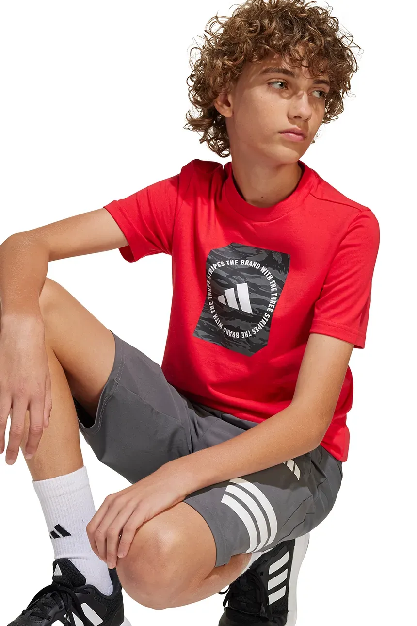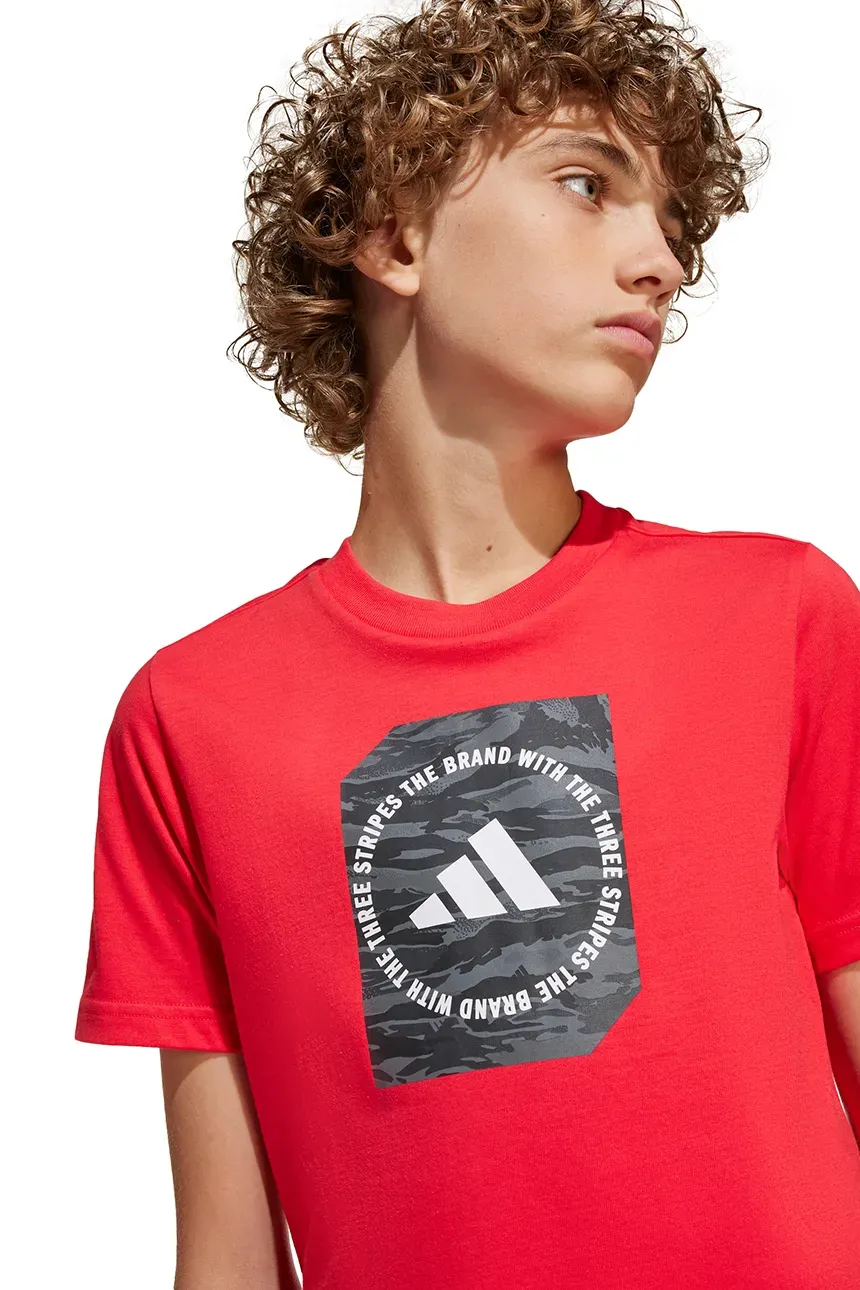 adidas t-shirt in cotone per bambini adidas per bambini T-shirt realizzata in maglia con stampa. Il modello realizzato in un tessuto di cotone estremamente confortevole. – Taglio dritto che consente libertà di movimento.– Un classico girocollo rotondo.– Tessuto elasticizzato a maglia fine. Codice del fabbricante: JM8233