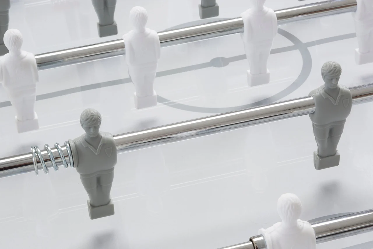 Gli ometti in bianco e grigio e il piano gioco bianco con linee grigie accrescono l’impressione generale di eleganza.