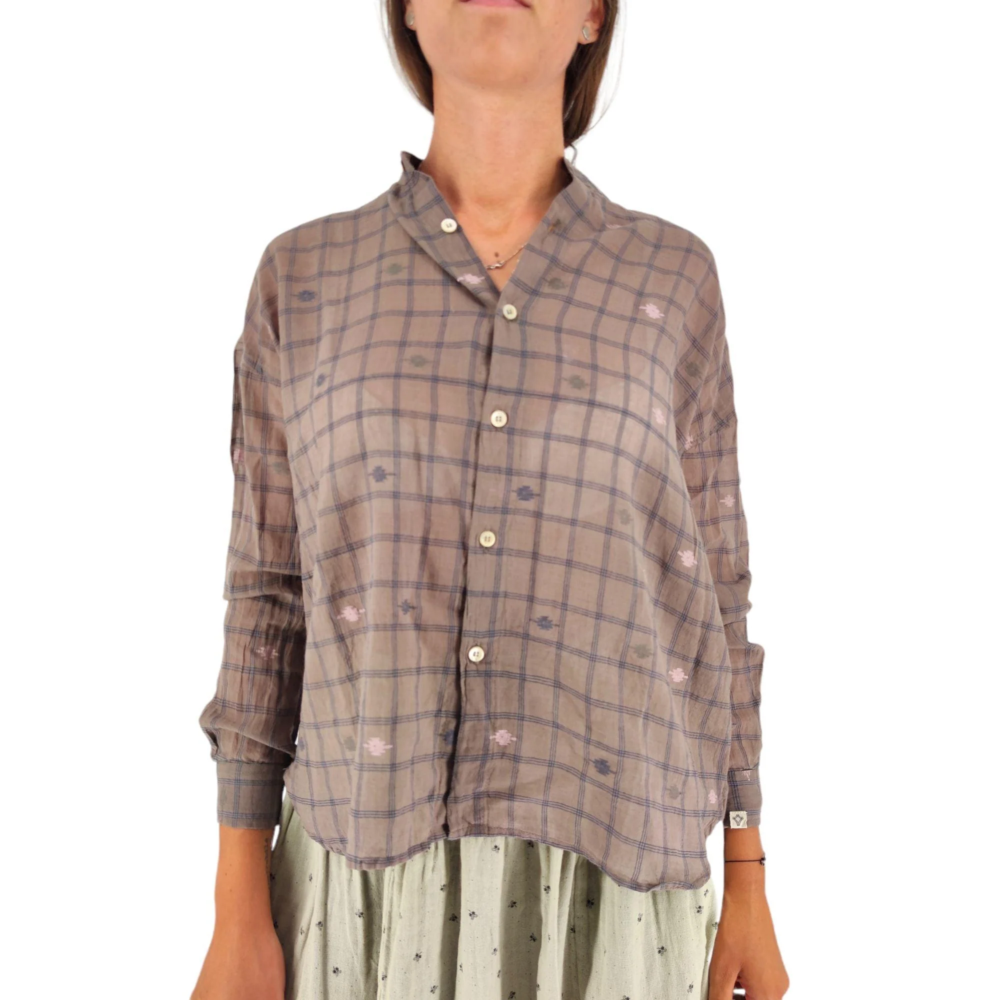 Realizzata in 100% cotone, la camicia “Omak” offre comfort e resistenza. La sua fattura artigianale, realizzata a mano in India, aggiunge un tocco di unicità e valore al capo. La camicia presenta un collo alla coreana con abbotonatura frontale e maniche lunghe con bottone, dettagli che aggiungono praticità e stile al design semplice ma elegante. La fantasia Jordan Check/Mud, un motivo a quadri con ricami geometrici, rende questa camicia un capo di tendenza, perfetto per chi vuole distinguersi.