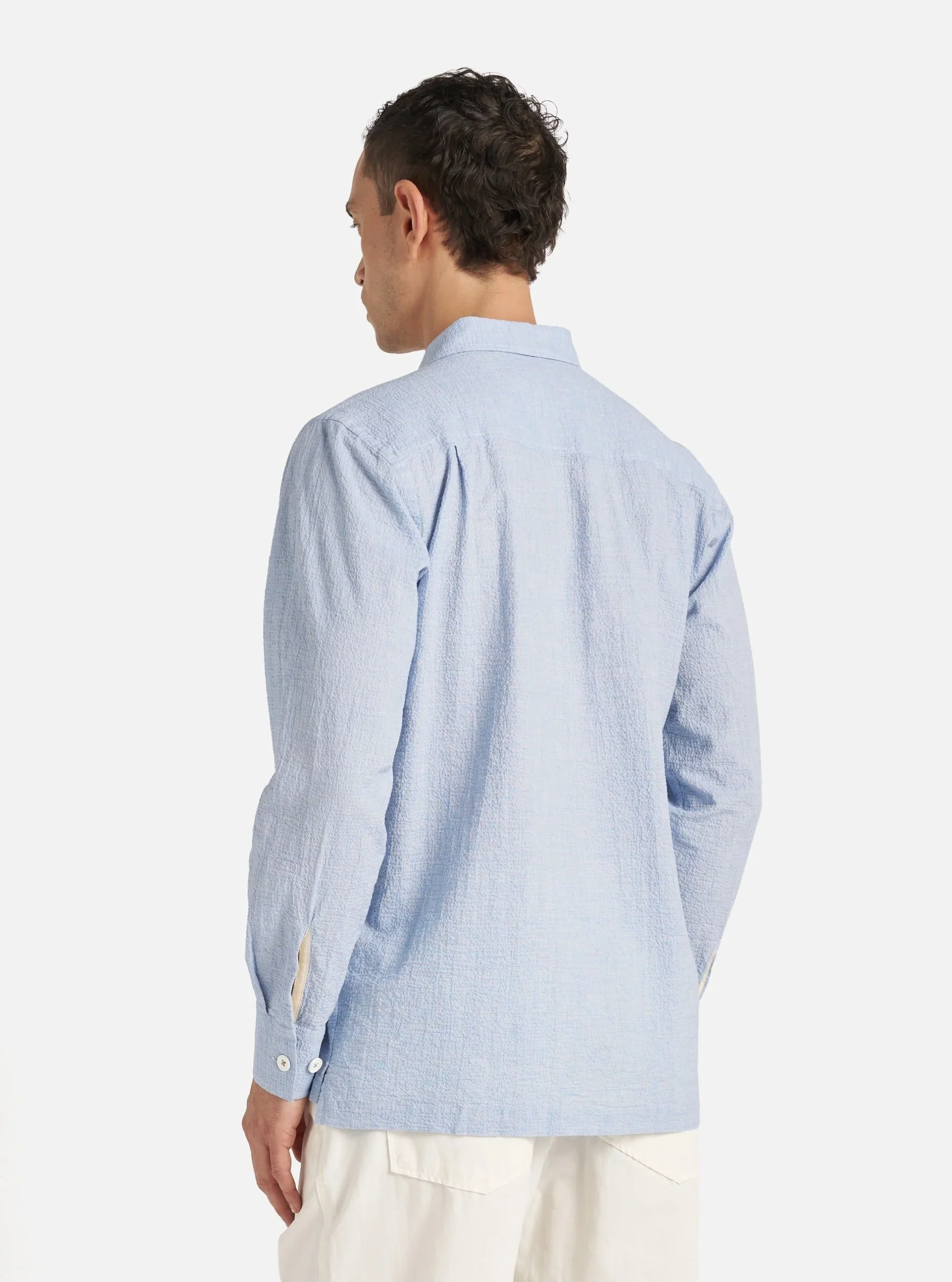 Realizzata in seersucker leggero, composto da cotone con una piccola percentuale di elastan, questa camicia è perfetta per la stagione estiva. La texture del tessuto solleva il materiale dalla pelle, migliorando la ventilazione e garantendo freschezza durante le giornate più calde. La chiusura frontale con bottoni e i polsini regolabili completano il design funzionale.