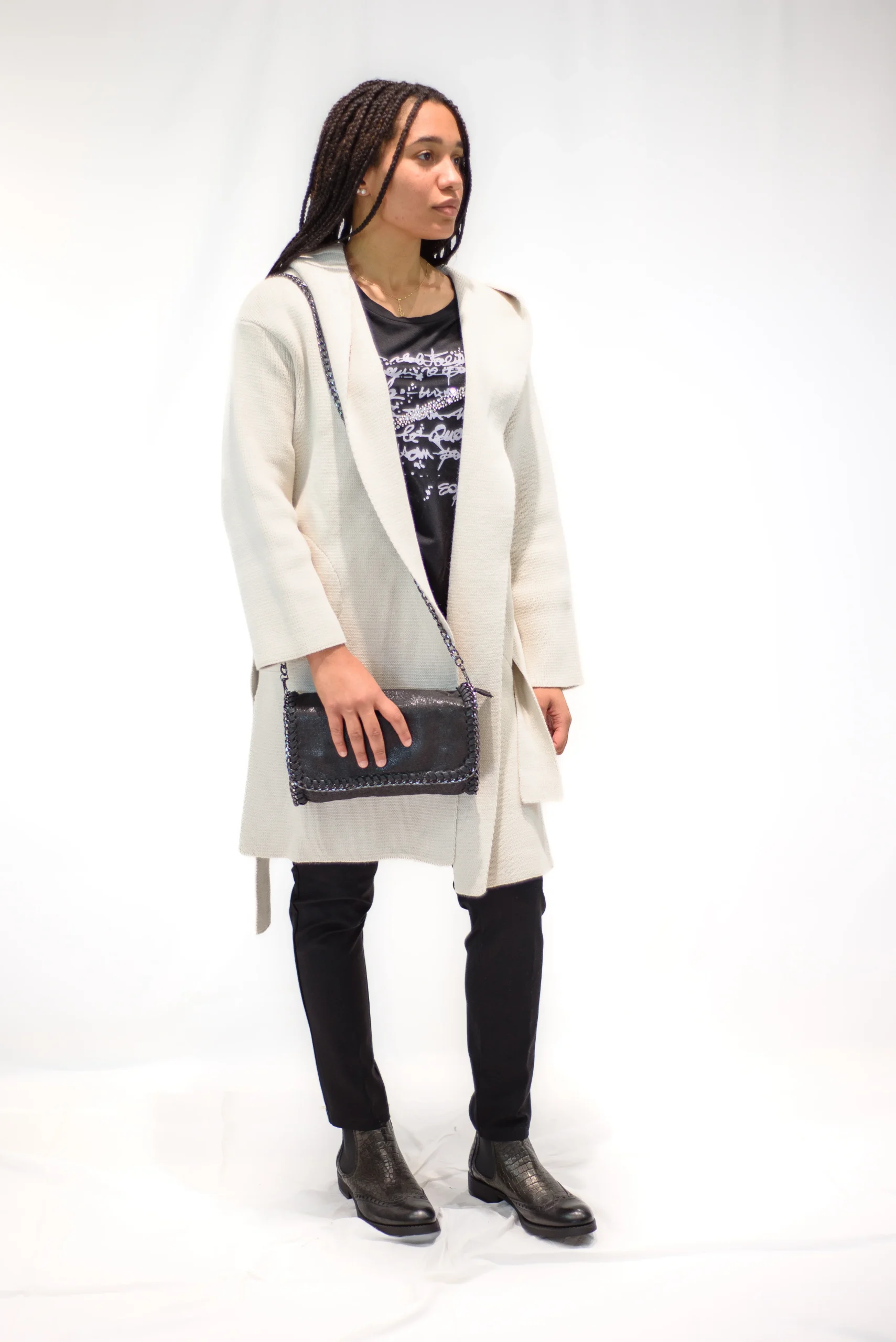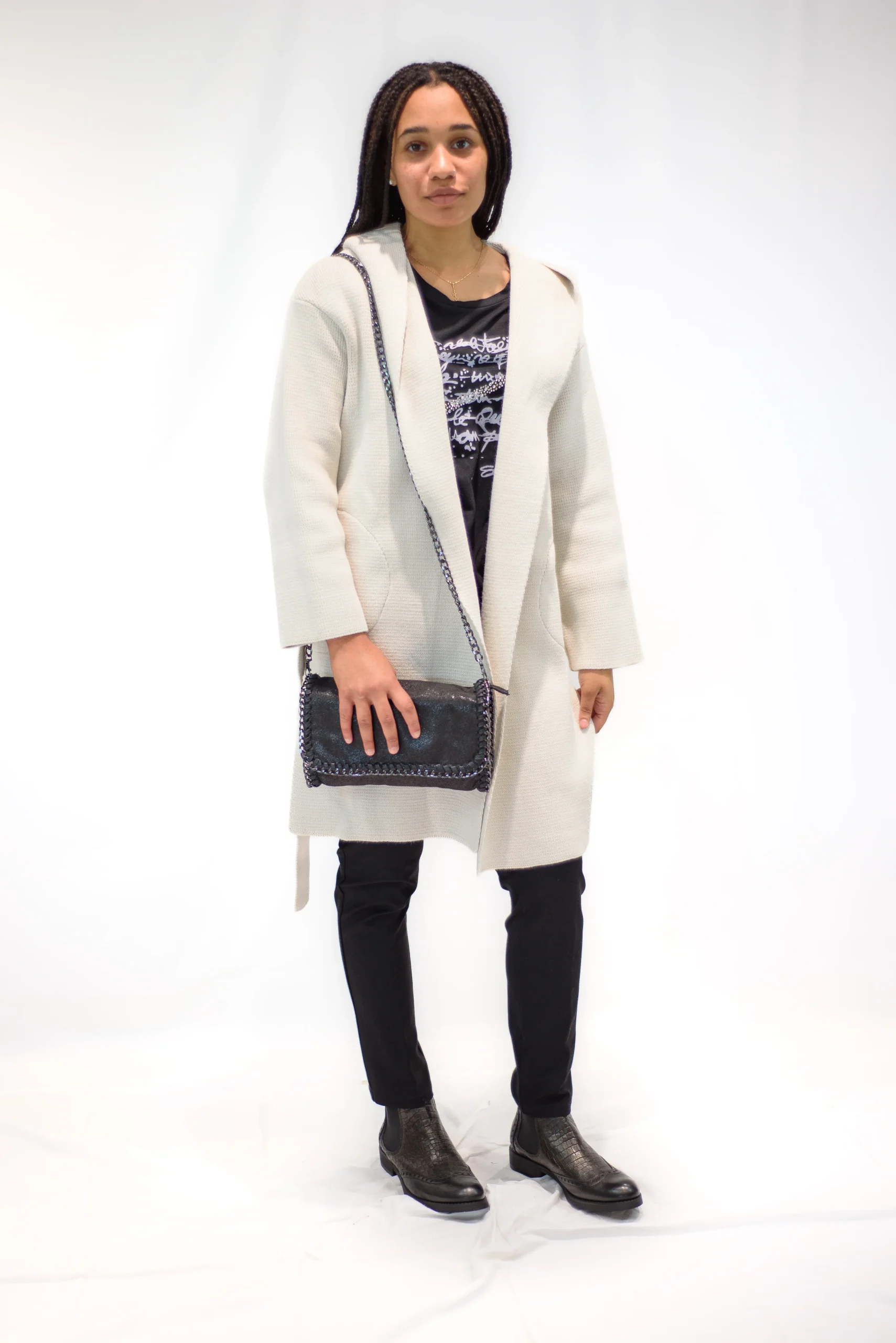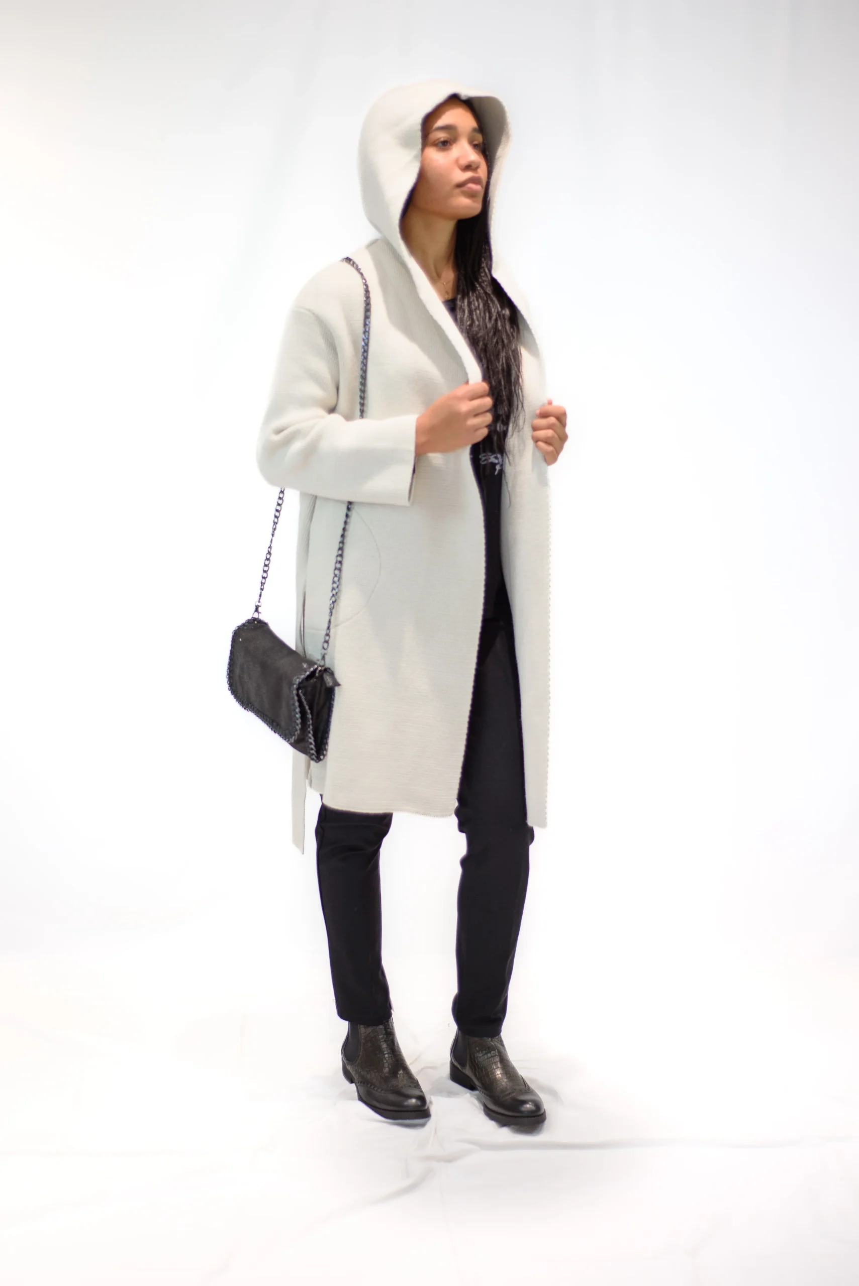 Cappottino Tricot con cappuccio e cintura Composizione: 0,00 % acrilico – 50,00 % lana Disponibile anche in colore nero