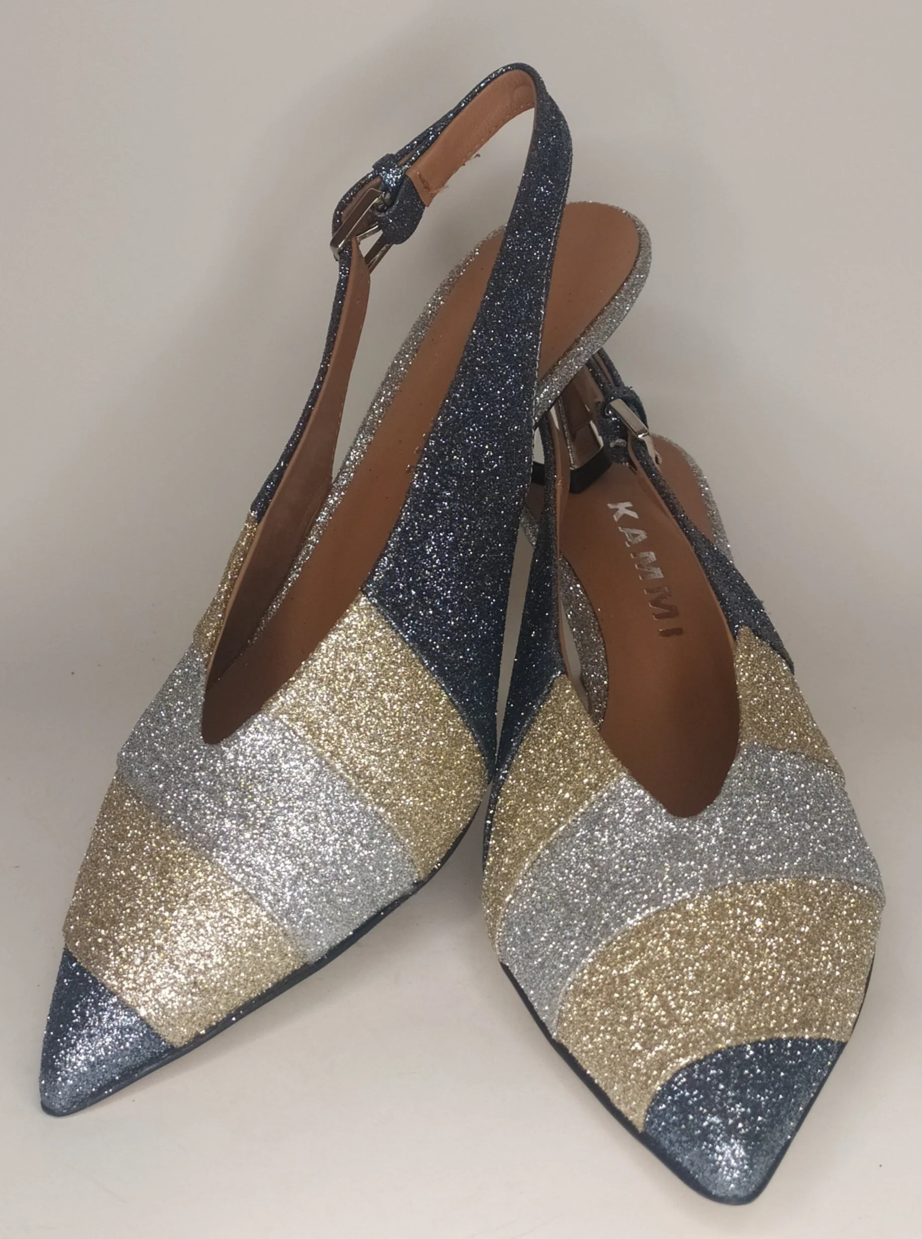 Decollètè Slingback a punta in pelle decorata da strisce glitter blu, oro e argento