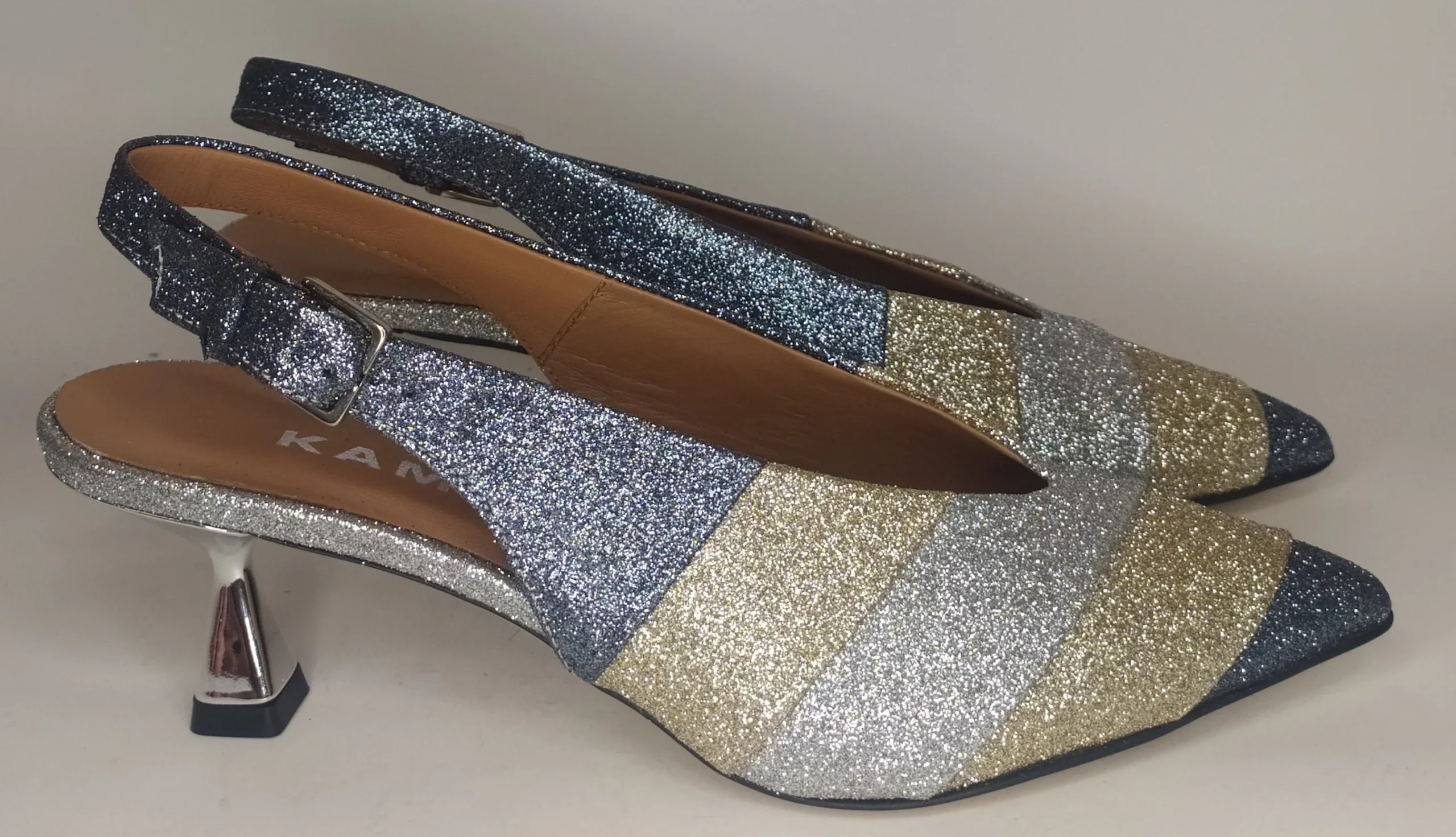Decollètè Slingback a punta in pelle decorata da strisce glitter blu, oro e argento modello 2026 Plantare in pelle Suola in cuoio Tacco 4 cm a forma piramidale