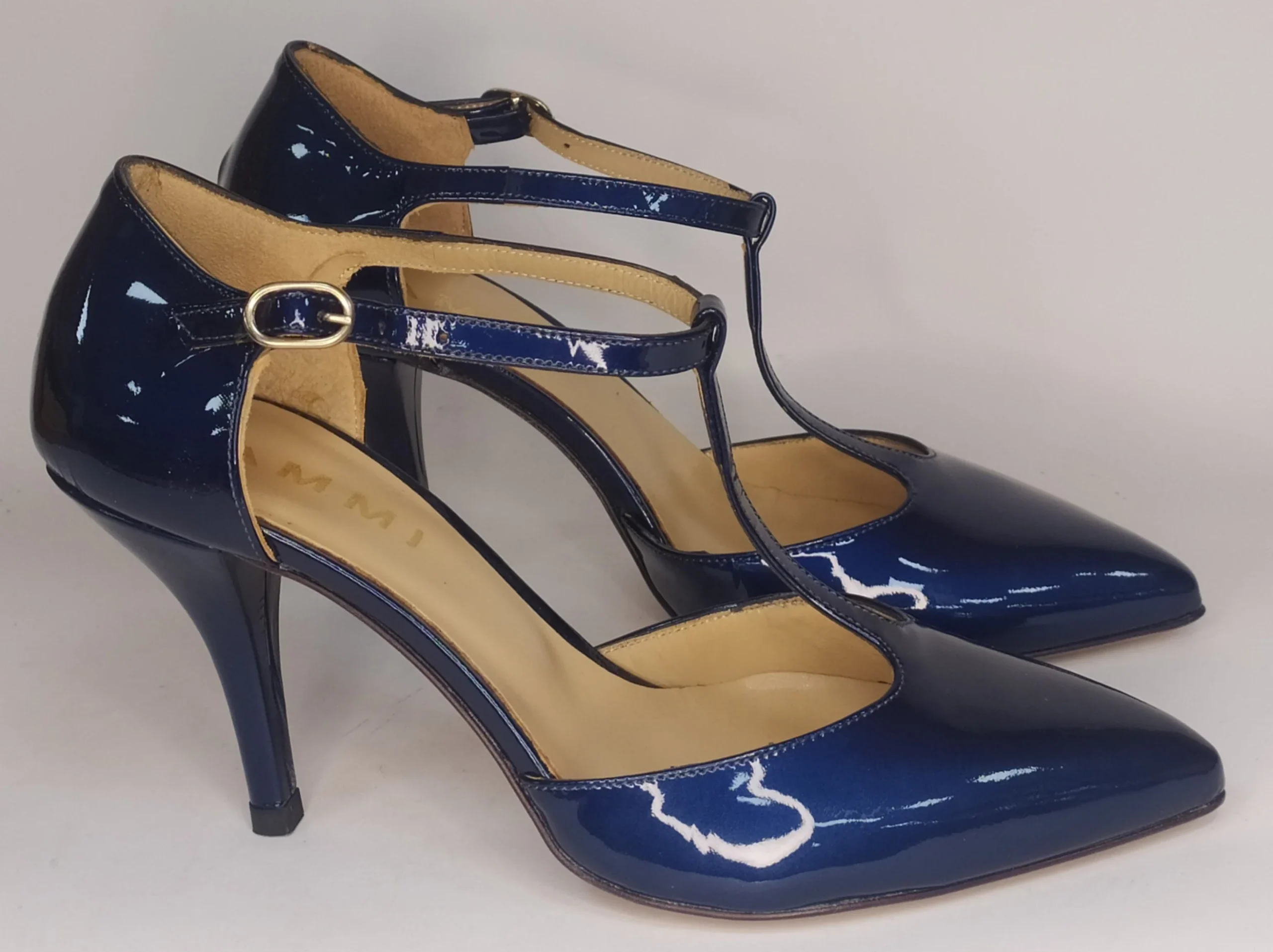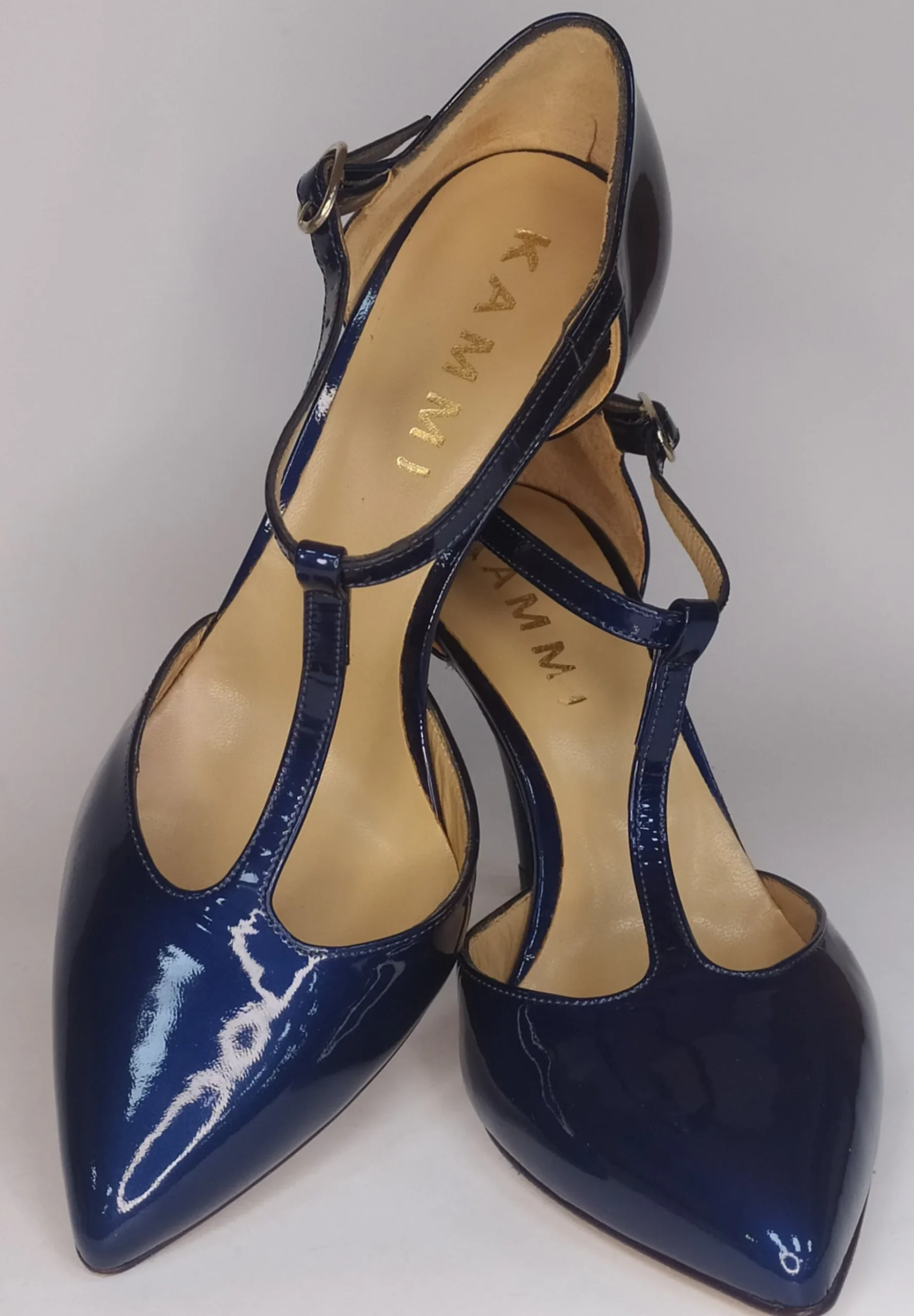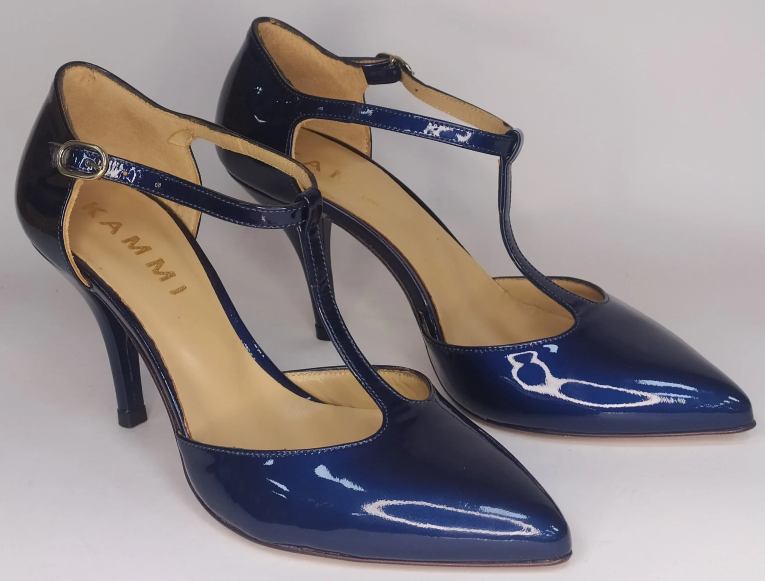 Decollètè a punta in pelle con lavorazione in vernice metallizzata color zaffiro, Modello 8210 cinturino a “T” alla caviglia, suola in cuoio, tacco a stiletto altezza tacco 8cm