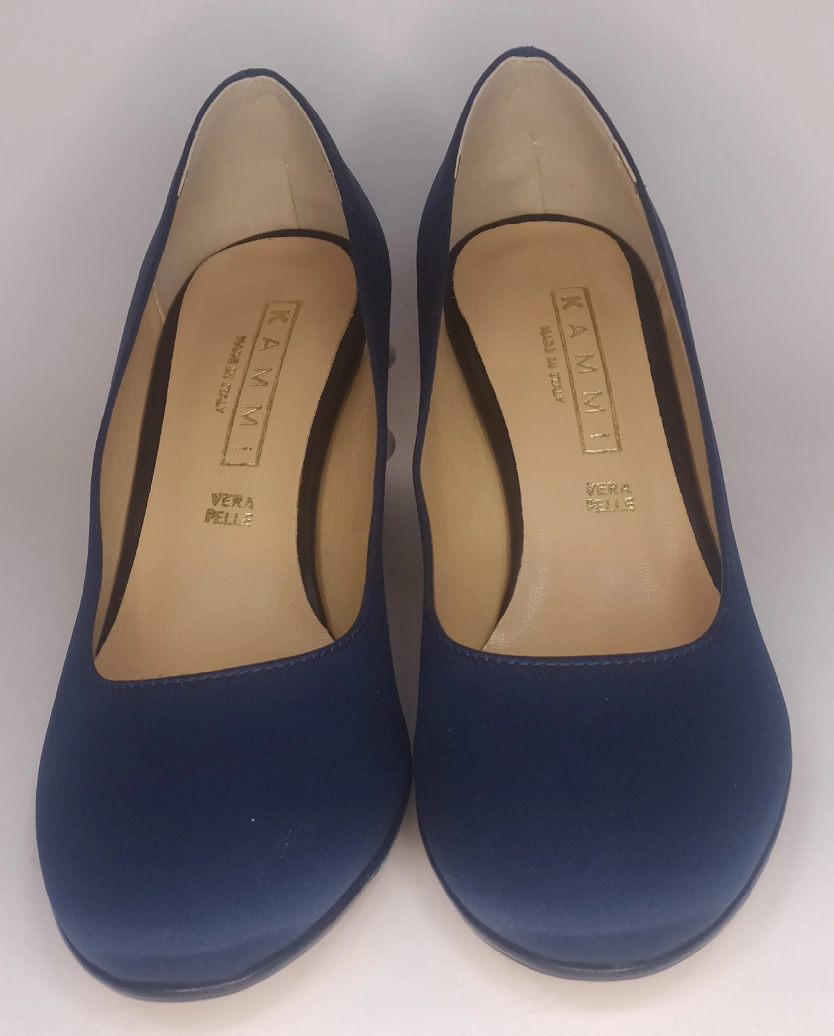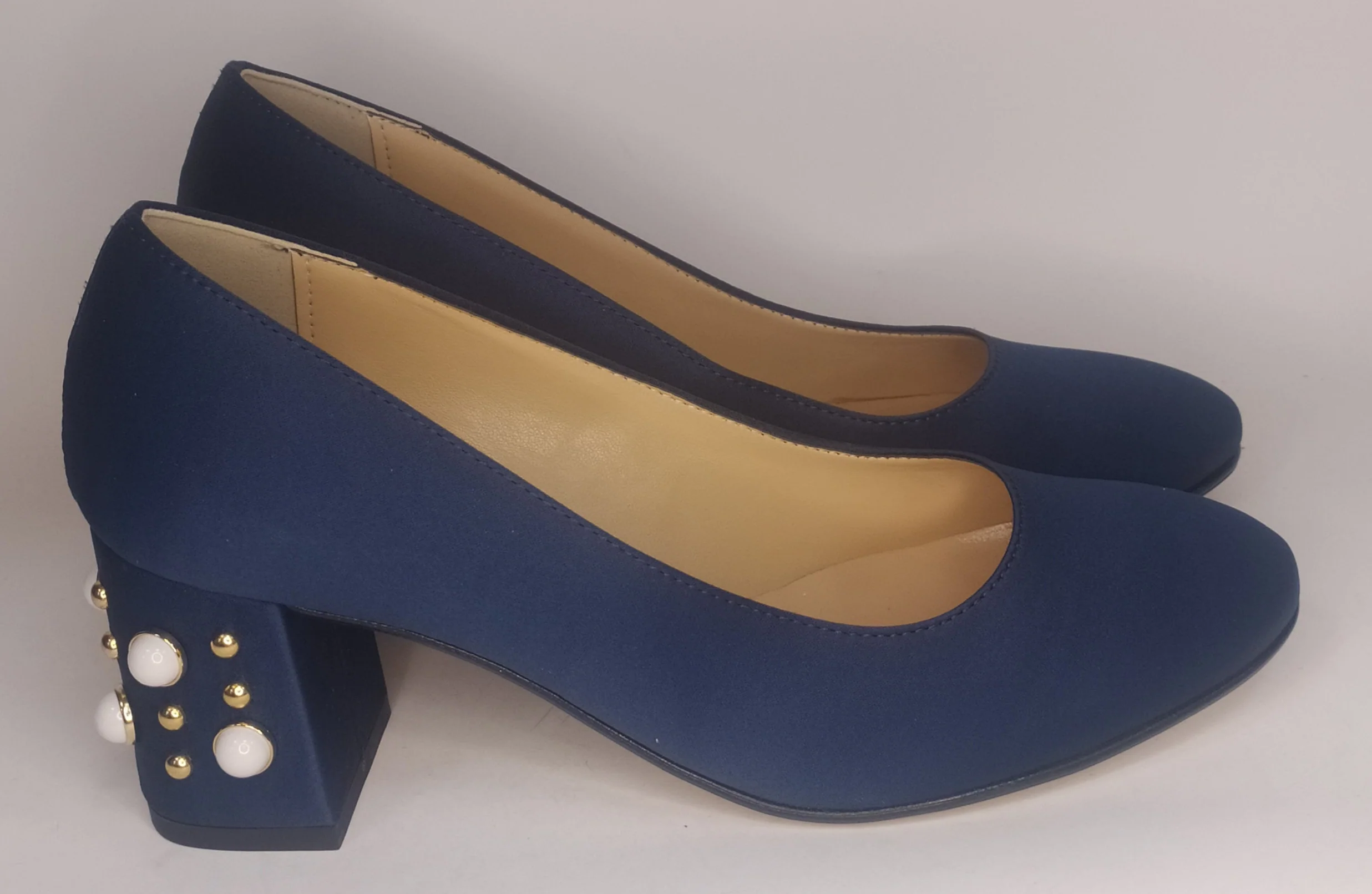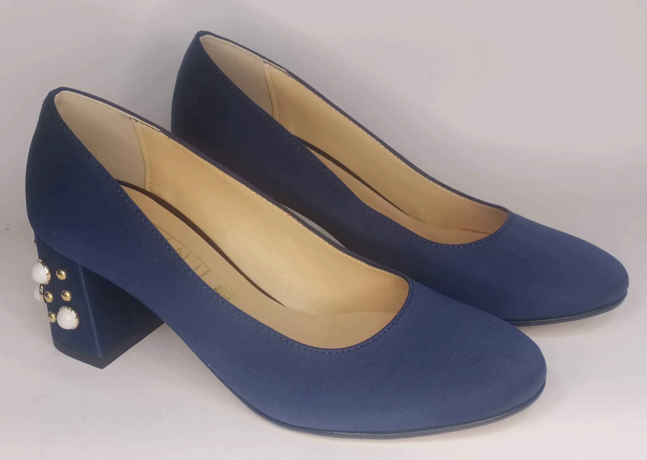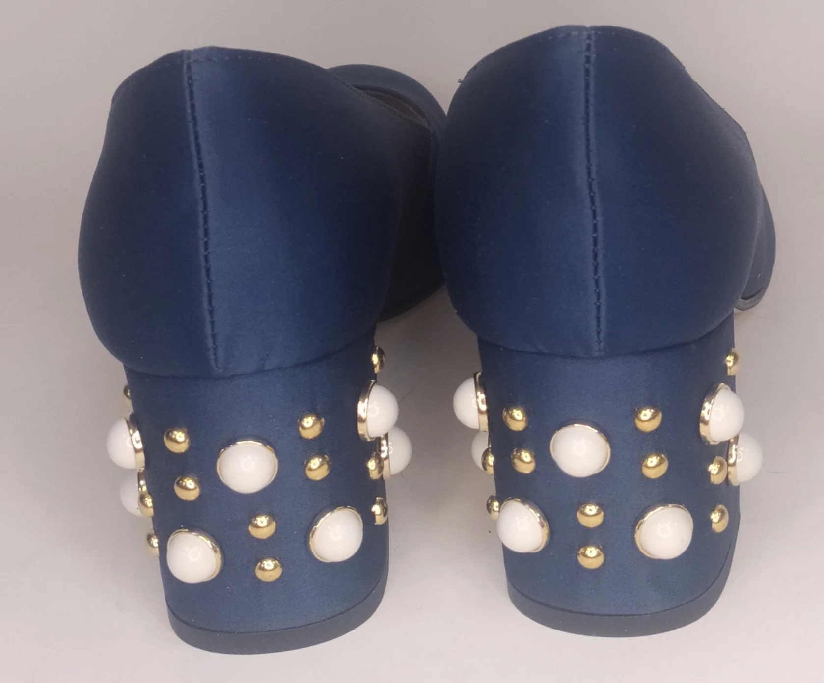 Decollete’ In Satin Blu Con Tacco Largo Impreziosito Di Perle Bianche E Borchie Dorate modello 1532Tacco Cm 5Plantare In PelleCalzata Comoda