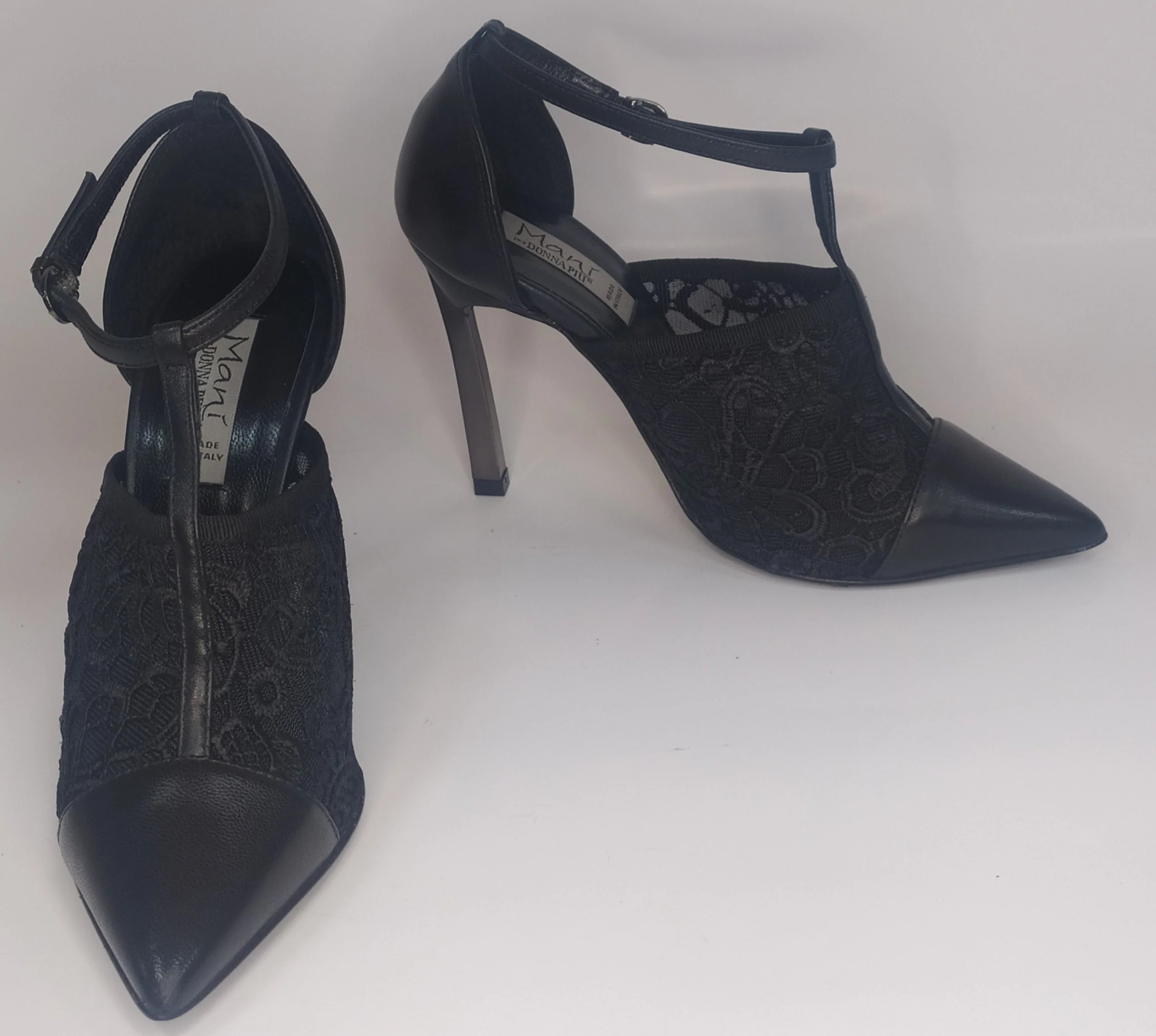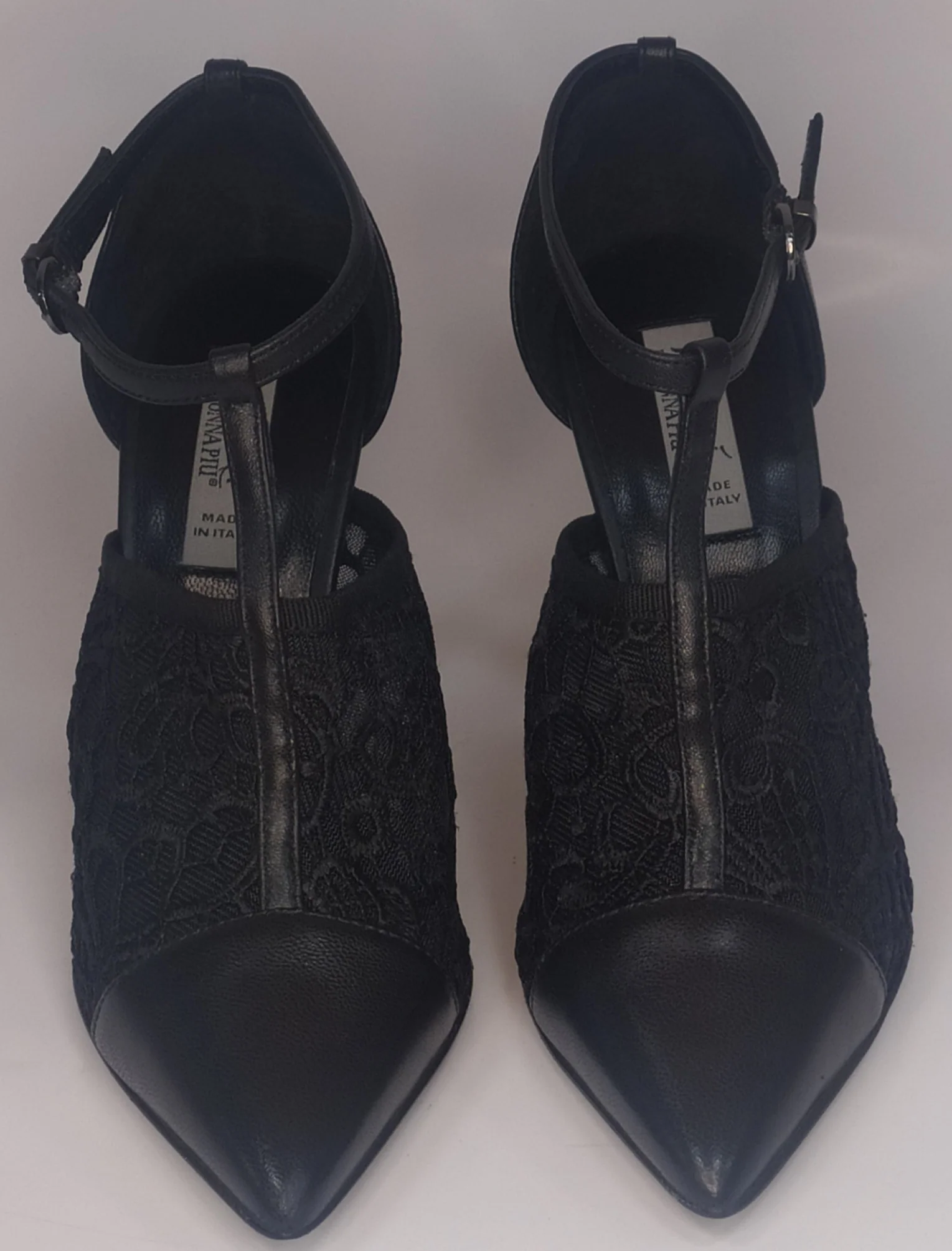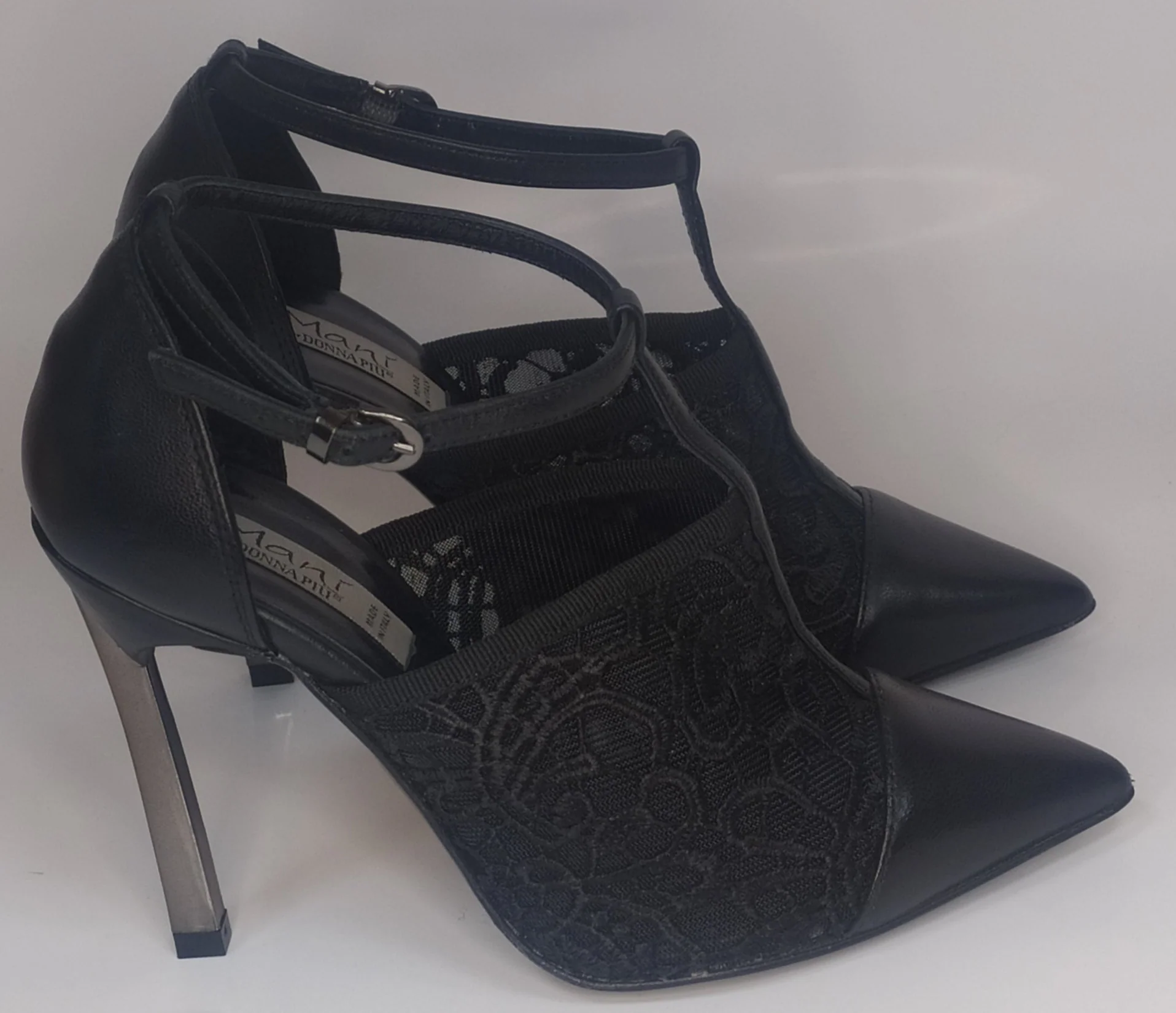 Decolletè in pelle e pizzo a punta con cinturino a “T” alla caviglia.
