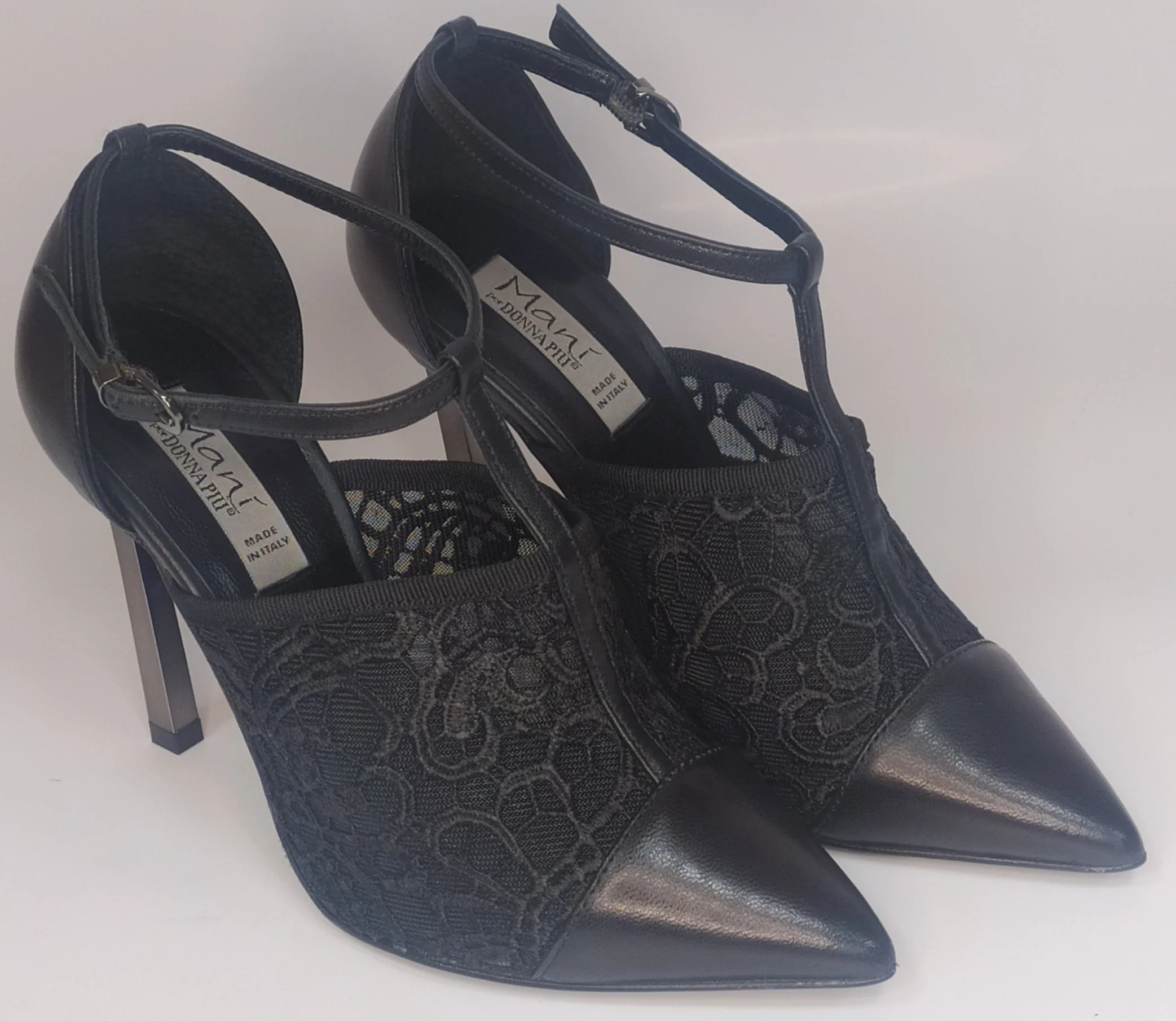 Decolletè in pelle e pizzo a punta con cinturino a “T” alla caviglia. modello 51874 Tacco sottile quadrato 10cm Suola in cuoio