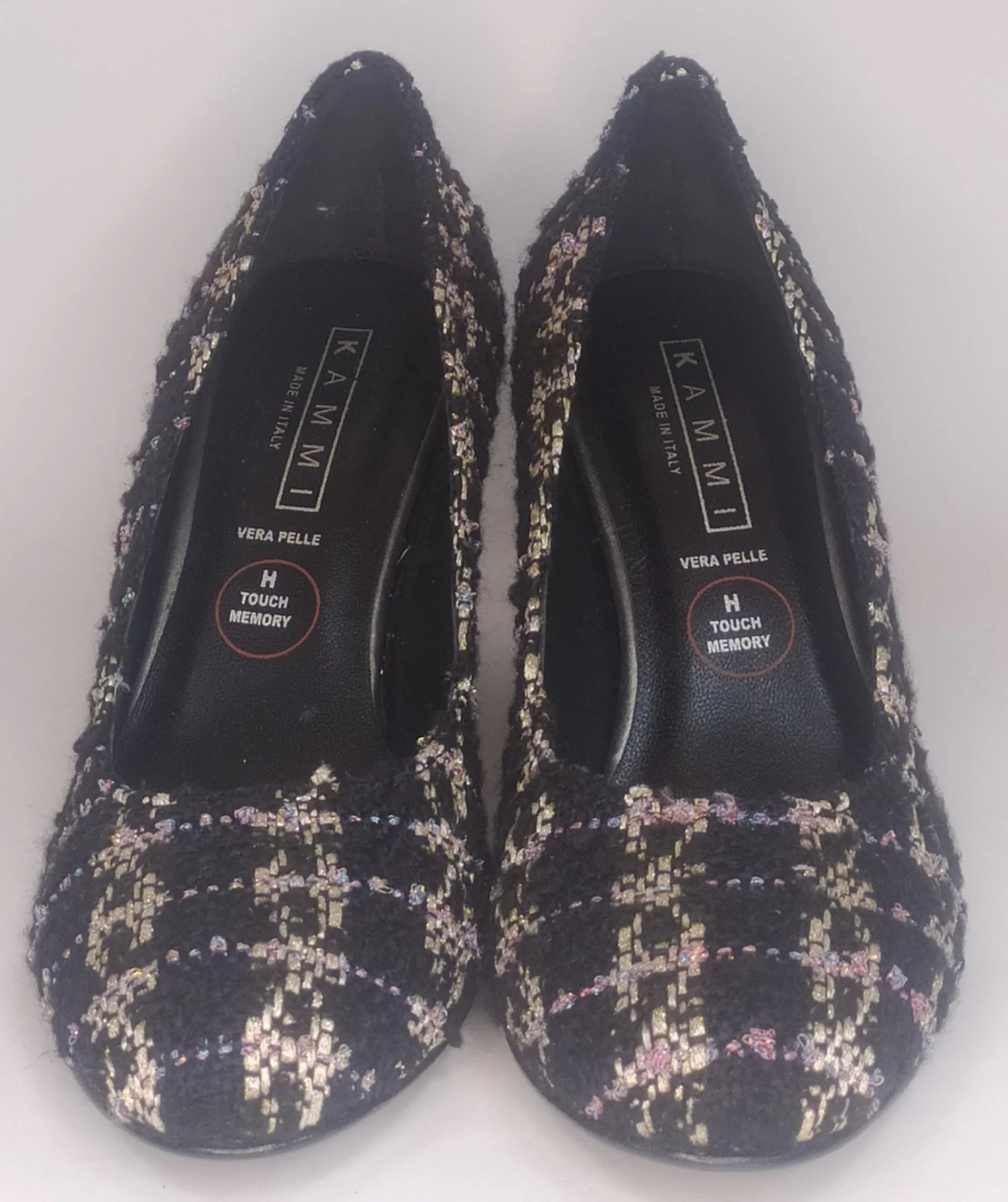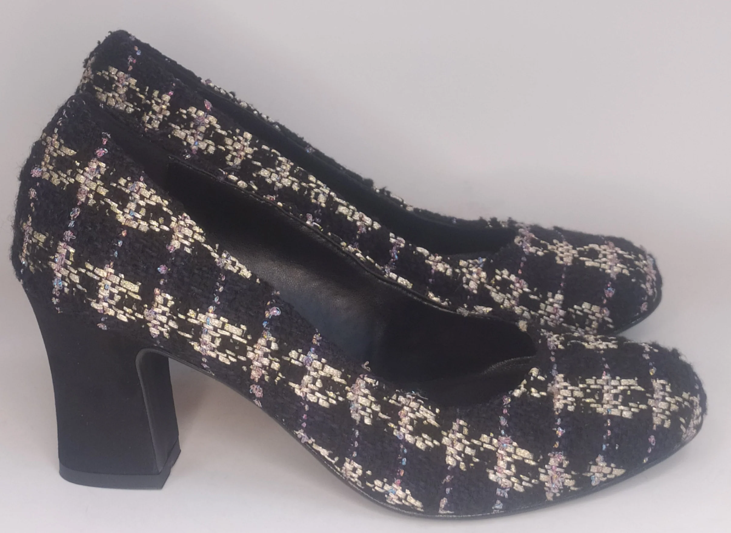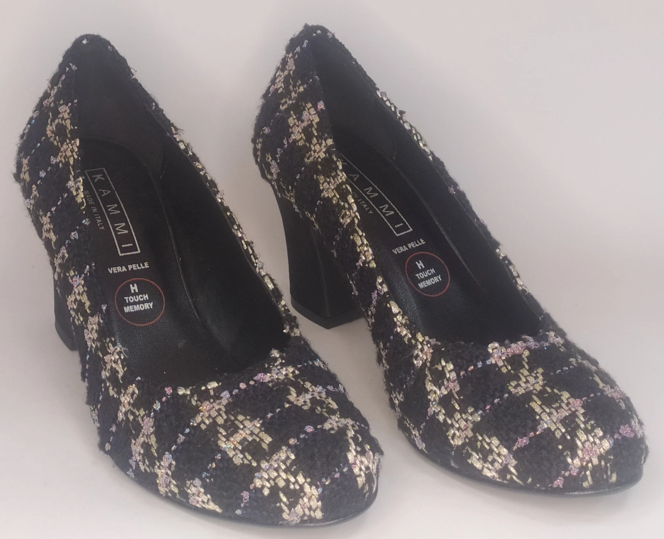 Decollete’ Donna In Tessuto Scozzese Color Nero/Oro modello 2375Plantare In PelleSuola In SinteticoTacco Cm 6
