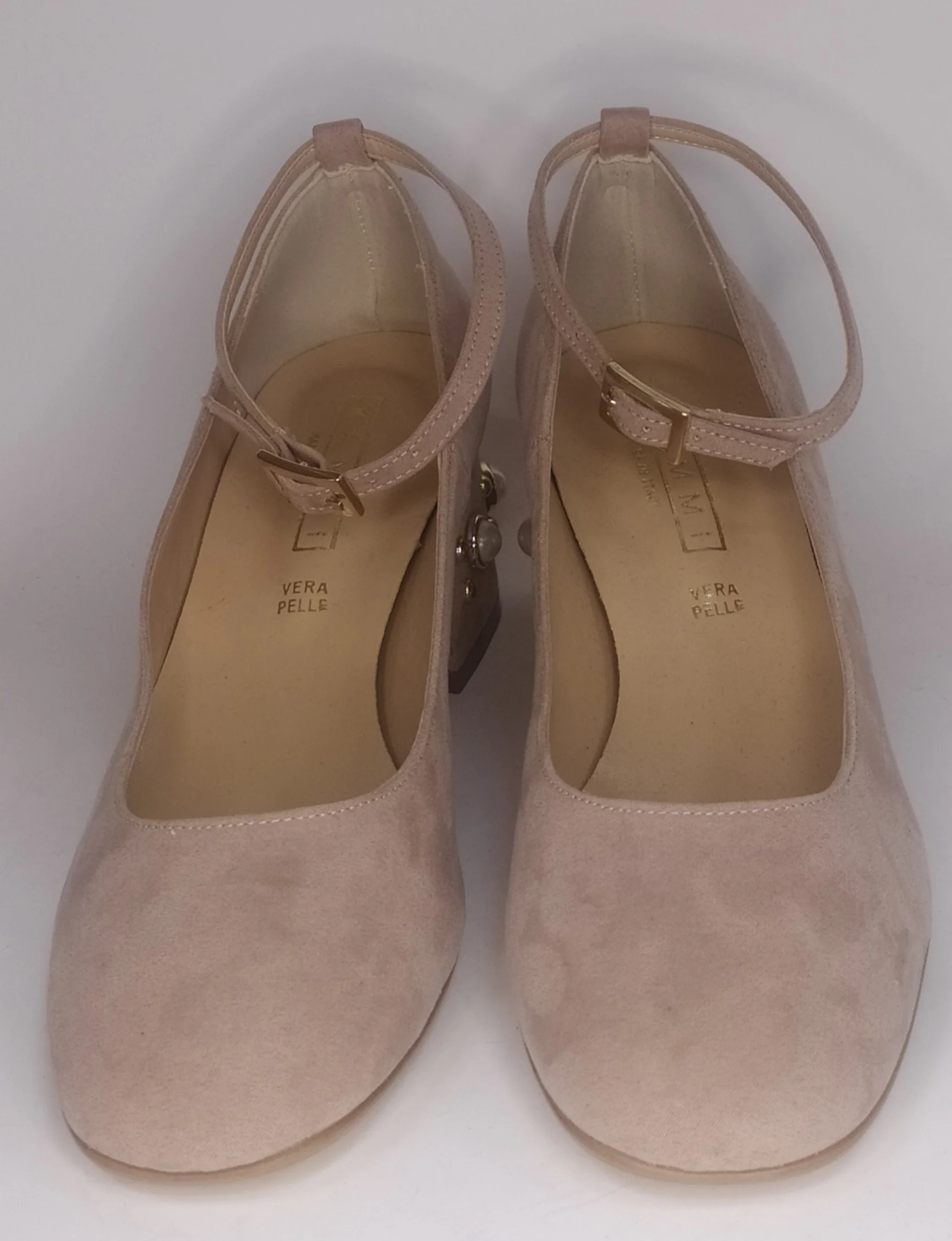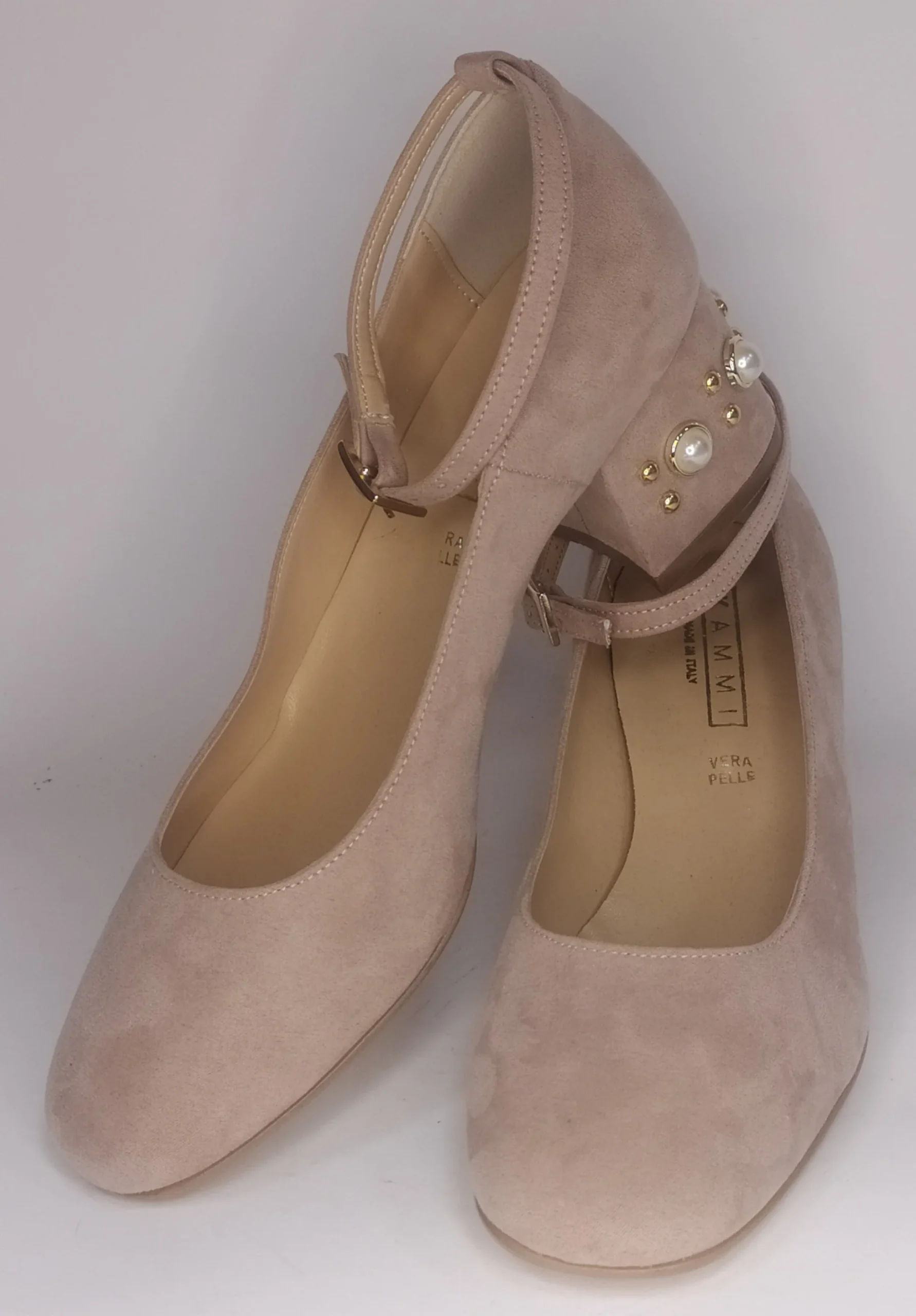 Decollete’ in ecopelle con finitura in camoscio rosa nude Modello con cinturino alla caviglia Materiale ecopelle e finitura in camoscio colore rosa nude Tacco largo cm 5 impreziosito da perle bianche e borchie dorate Plantare in pelle