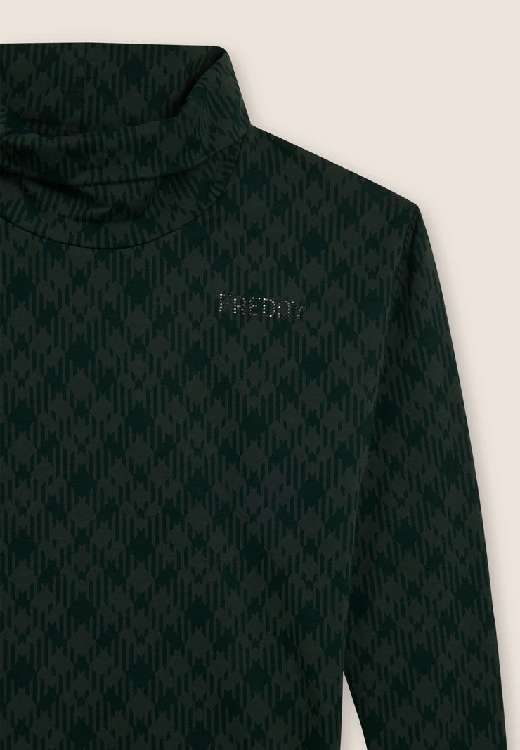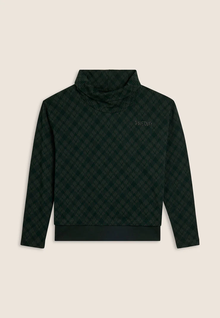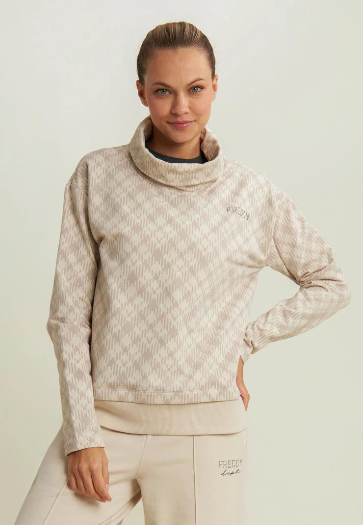 Felpa dalla linea morbida con fondo in costina che crea un effetto sovrapposto. Collo alto ampio, maniche lunghe con spalla scesa e logo sul cuore in borchie. In felpa elasticizzata con fantasia geometrica all-over. Senza tasche.