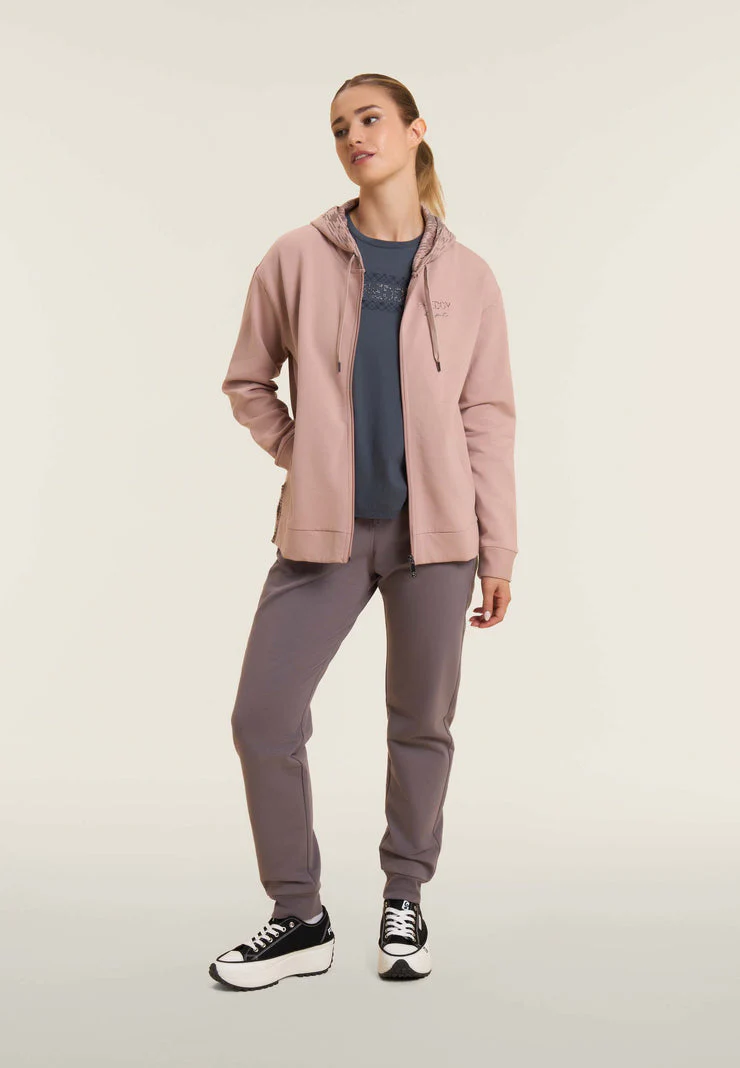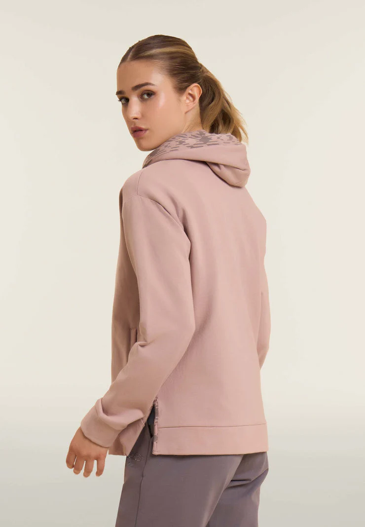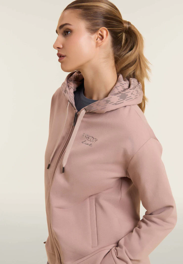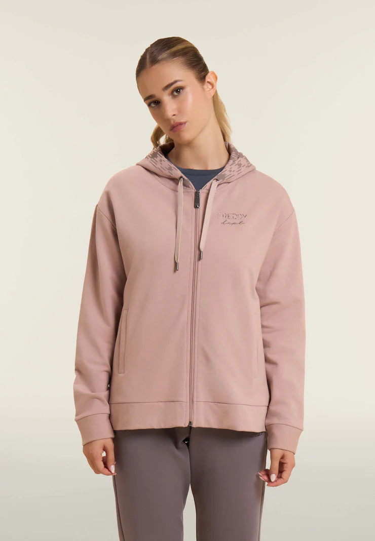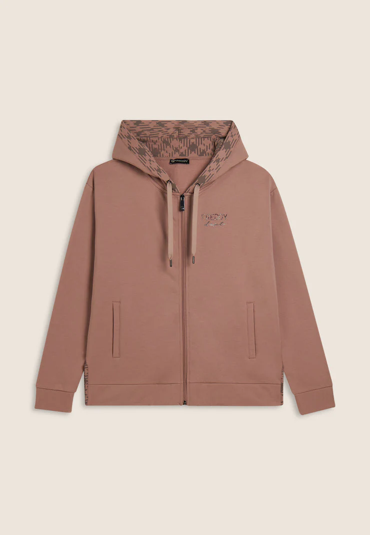 Felpa con zip e fondo dritto con spacchi laterali bordati in tessuto fantasia geometrica. Il cappuccio è doppiato e rifinito con bordatura in jersey stampato. Maniche con polsini, logo sul cuore in borchie e pratiche tasche interne a filetto.