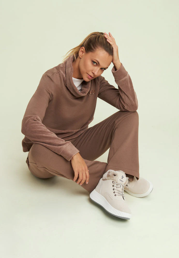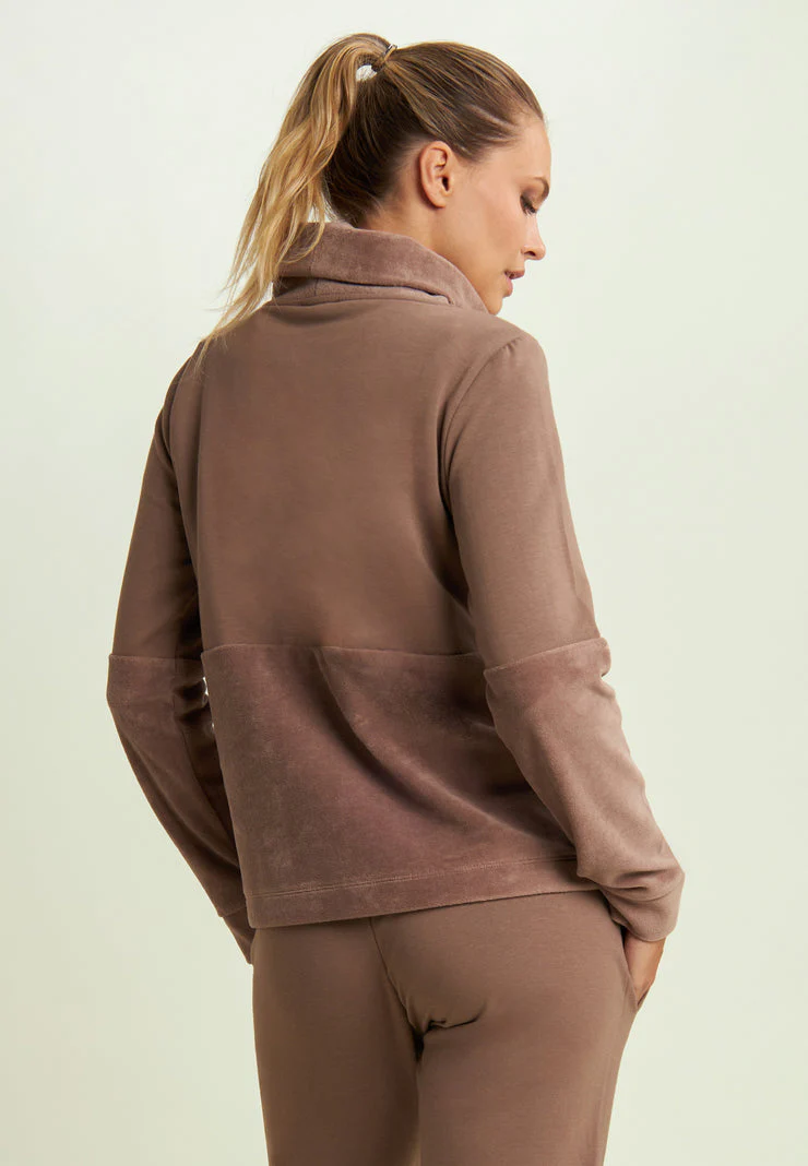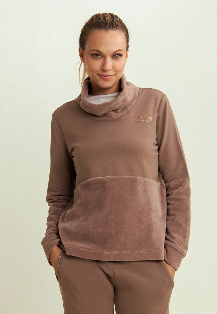 Pensata per chi cerca comfort e stile, questa felpa da donna presenta la parte alta di busto e maniche in felpa modal garzata elasticizzata e la parte bassa in velluto, incluso il collo alto. Le maniche sono rifinite con polsini e il logo FREDDY sul cuore è arricchito da strass bicolori