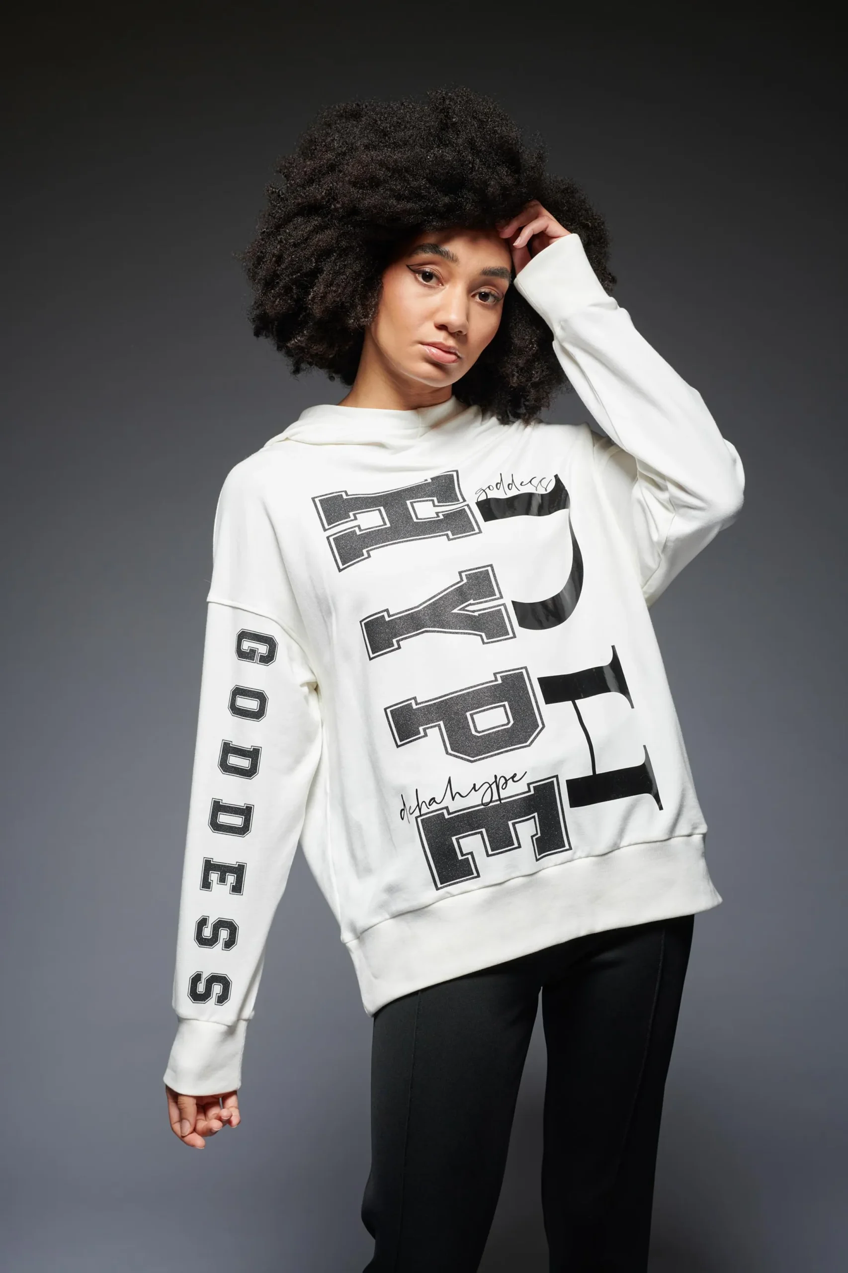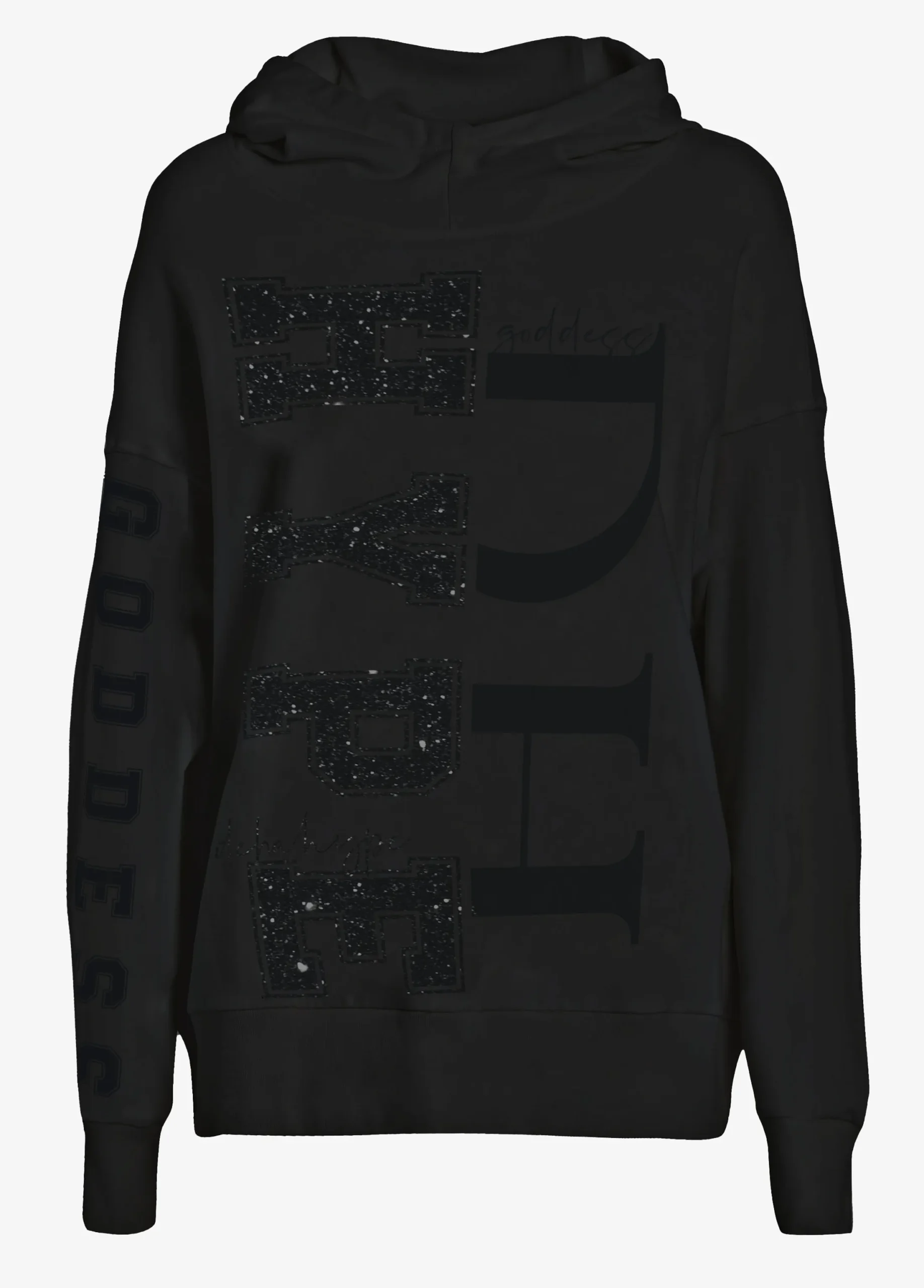 FELPA DEHA LUXE CON CAPPUCCIO felpa di cotone e modal 240 grm. cappuccio – grafica davanti e su maniche vestibilità ampia e lunga lavaggio in capo ecologico – la modella è alta 174 e indossa taglia M