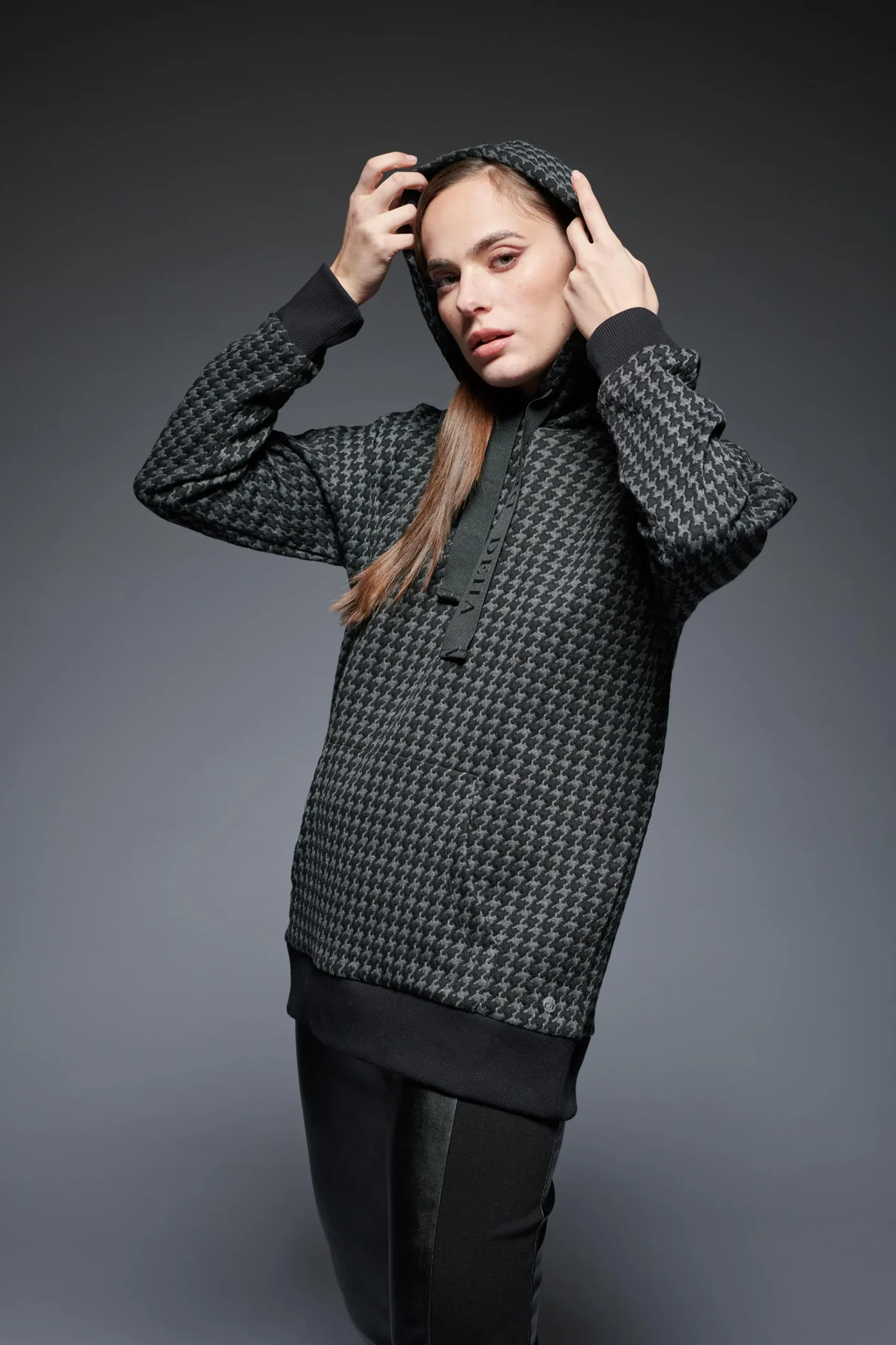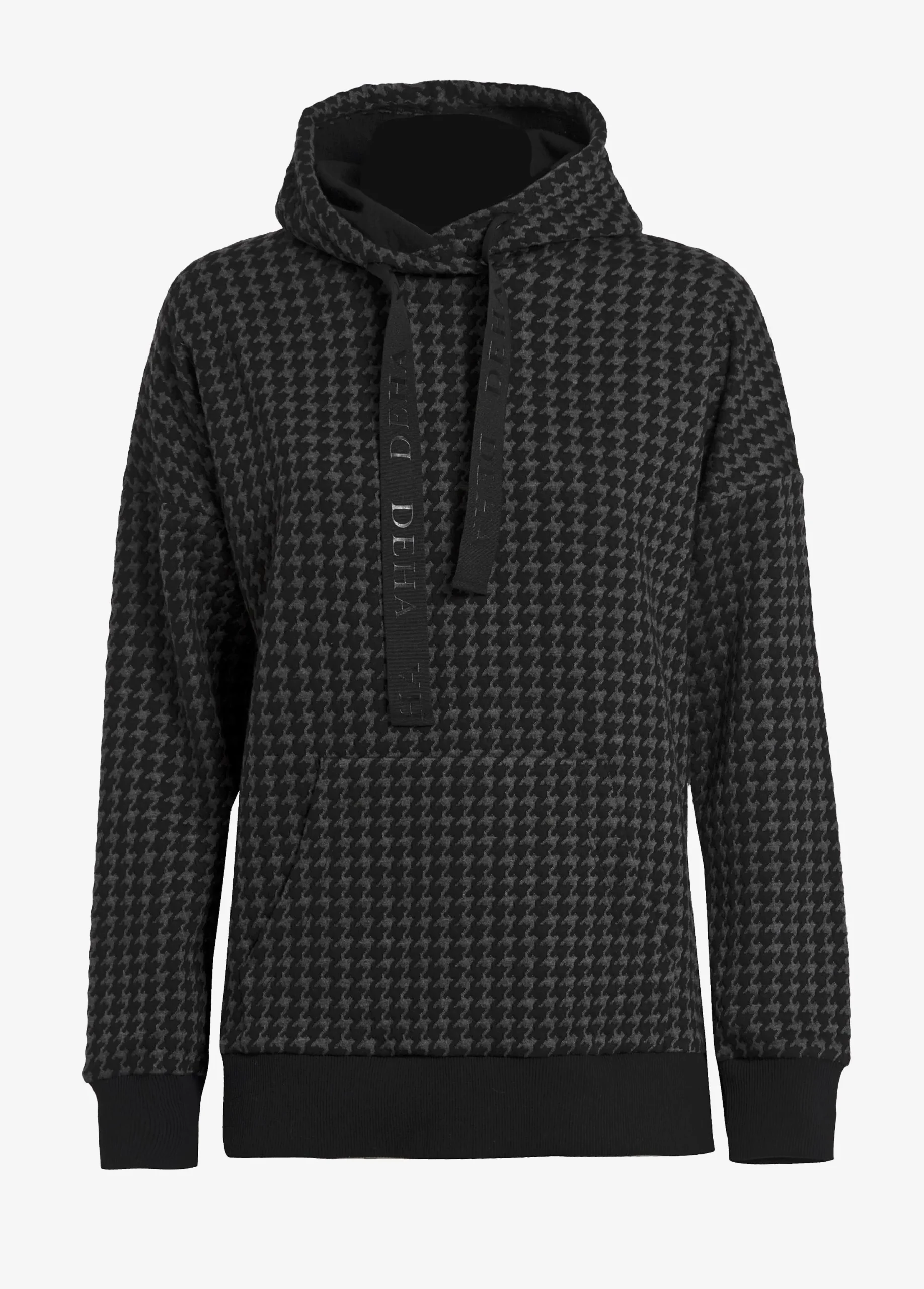 FELPA DEHA PIED-DE-POULE CON CAPPUCCIO felpa matelassè jacquard misto viscosa 270 g. cappuccio con coulisse logata nera – tasca amarsupio – polsi e fondo in costina vestibilità regolare stirare rovescio – la modella è alta 174 e indossa taglia M