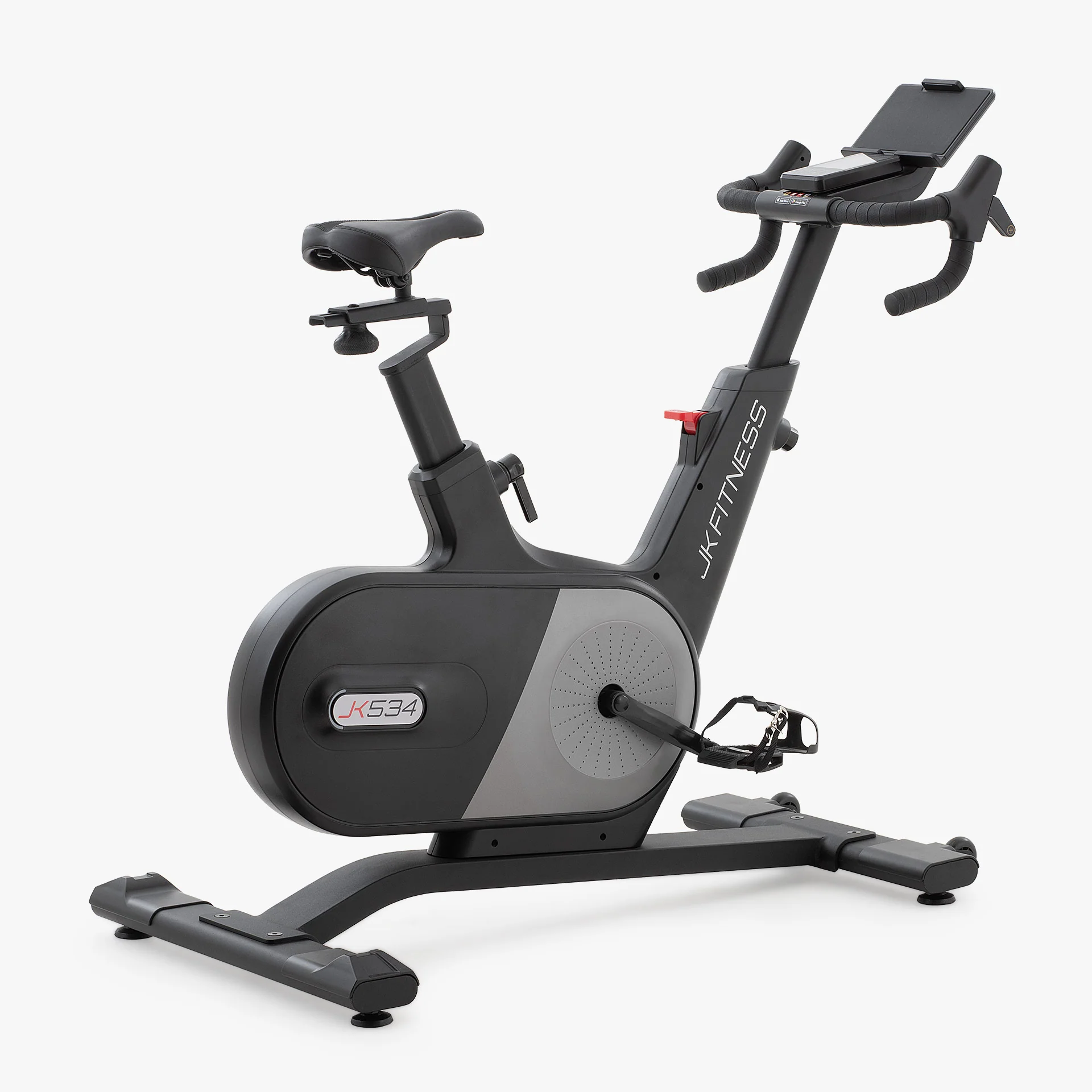 Design, prestazioni e dettagli tecnici particolari che proiettano la nuova indoor bike JK 534 fra le più interessanti spin bike del mercato ad oggi! Nasce da un progetto innovativo la nuova JK 534 per confermare l’offerta medio-alta home fitness ampliando la categoria della spin bike elettro-magnetiche con trasmissione a cinghia silenziata a scatto fisso con un sistema di freno motorizzato che simula i rapporti di una bici da corsa; tutto questo inserito in una veste completamente nuova, fuori dai soliti canoni stilistici delle bici da spinning, decisamente più moderna e sportiva grazie al nuovo look black/silver matt.
