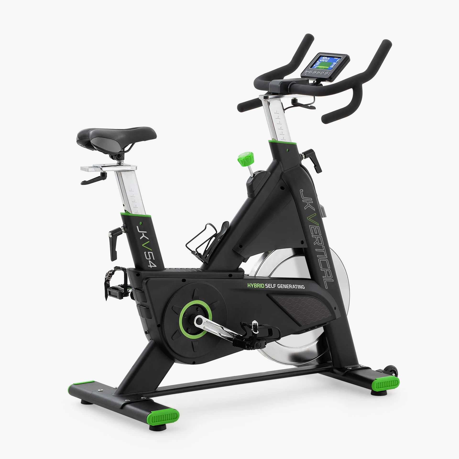 Design ricercato, prestazioni eccellenti ed ecologia, ecco i concetti di base che portano ai vertici della categoria la nuova indoor bike JK V54. La nuova rivoluzionaria JK V54 si conferma ai massimi livelli JK vertical fitness ampliando la categoria della spin bike JK fitness elettro-magnetiche con sistema di freno motorizzato a scatto fisso e trasmissione a cinghia silenziata. Il sistema integrato self generation produce l’energia necessaria alla spin bike senza collegarla alla rete domestica 220V! Tutte queste caratteristiche in una veste completamente nuova con dettagli verdi, dal telaio robusto e snello decisamente più moderno e sportivo con la colorazione black matt.