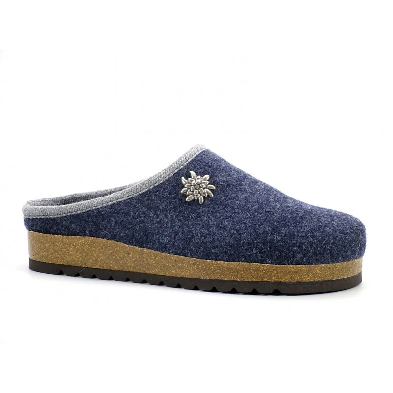 Originale pantofola tirolese in feltro naturale per dei piedi che soffrono il freddo. Suola in gomma antiscivolo.