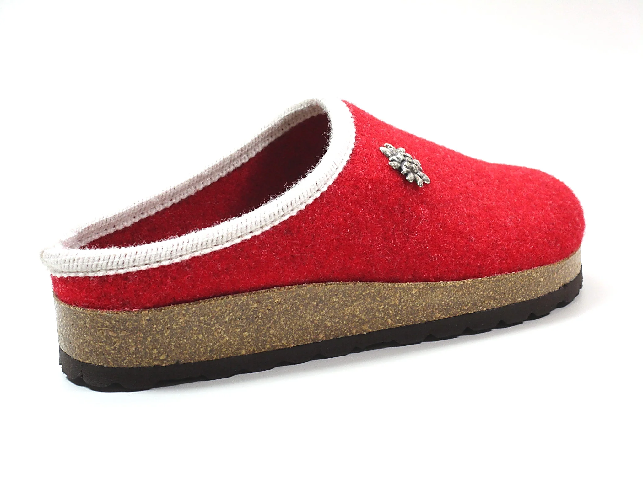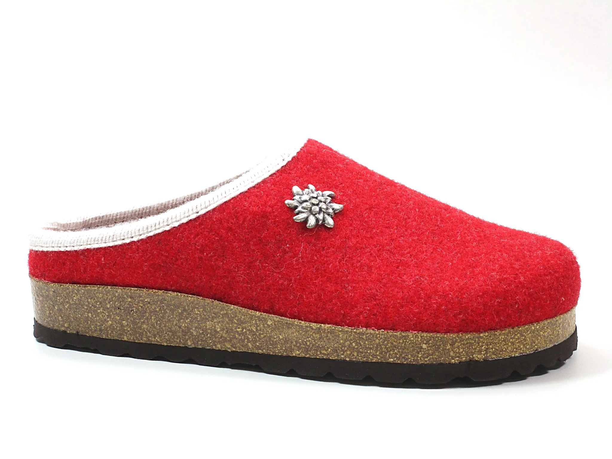 Originale pantofola tirolese in feltro naturale per dei piedi che soffrono il freddo. Suola in gomma antiscivolo.