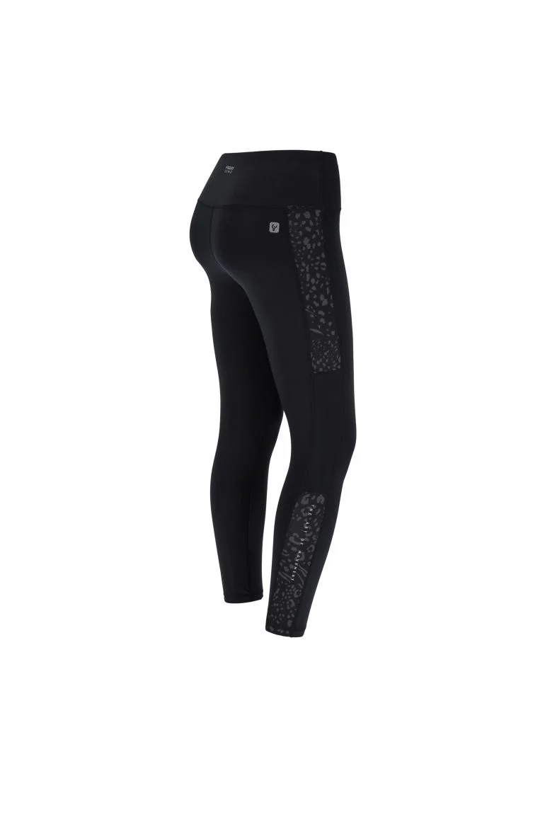 Leggings modellanti SuperFit ecologici in tessuto tecnico traspirante riciclato con bande texturizzate spezzate laterali e stampe in bianco THE ART OF MOVEMENT e glitter FREDDY a fondo gamba. Hanno vita alta con micro tasca interna alla cintura e lunghezza 7/8 alla caviglia. Sulla parte posteriore il logo Freddy metallizzato e il logo D.I.W.O.® che certifica il tessuto completano i dettagli di stile.