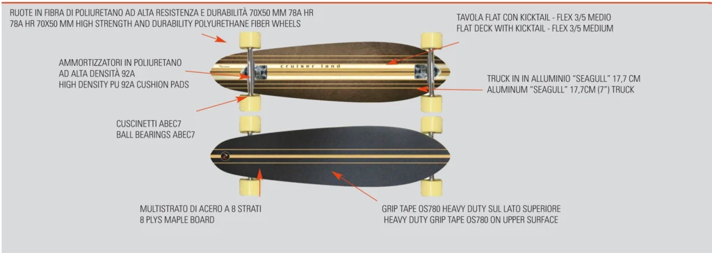 Dati Tecnici Dimensioni tavola 95×24 cm. spessore 12,5 mm Materiale tavola multistrato di acero a 8 strati Caratteristiche tavola flat con kicktail – flex 3/5 medio Grafica termostampata sul lato inferiore – grip tape OS780 heavy duty sul lato superiore Truck in alluminio “seagull” 17,7cm – montaggio standard TOP – RKP (reverse kingpin) Ammortizzatori in […]