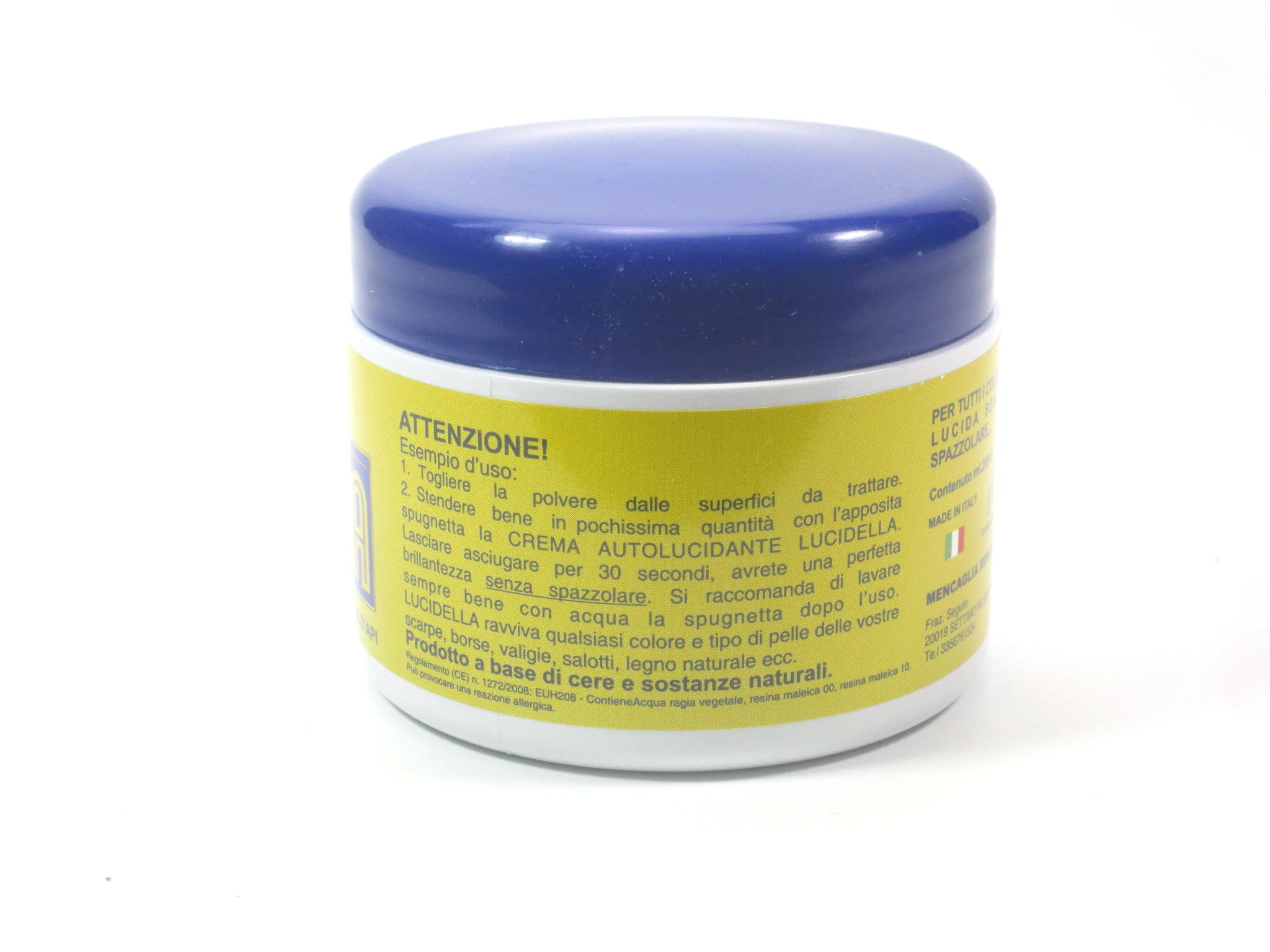 Crema autolucidante alla lanolina a cera d`api. Adatta a calzature con tomaia in pelle liscia, per tutti i colori lucida senza spazzolare. Contenuto 200 ml.
