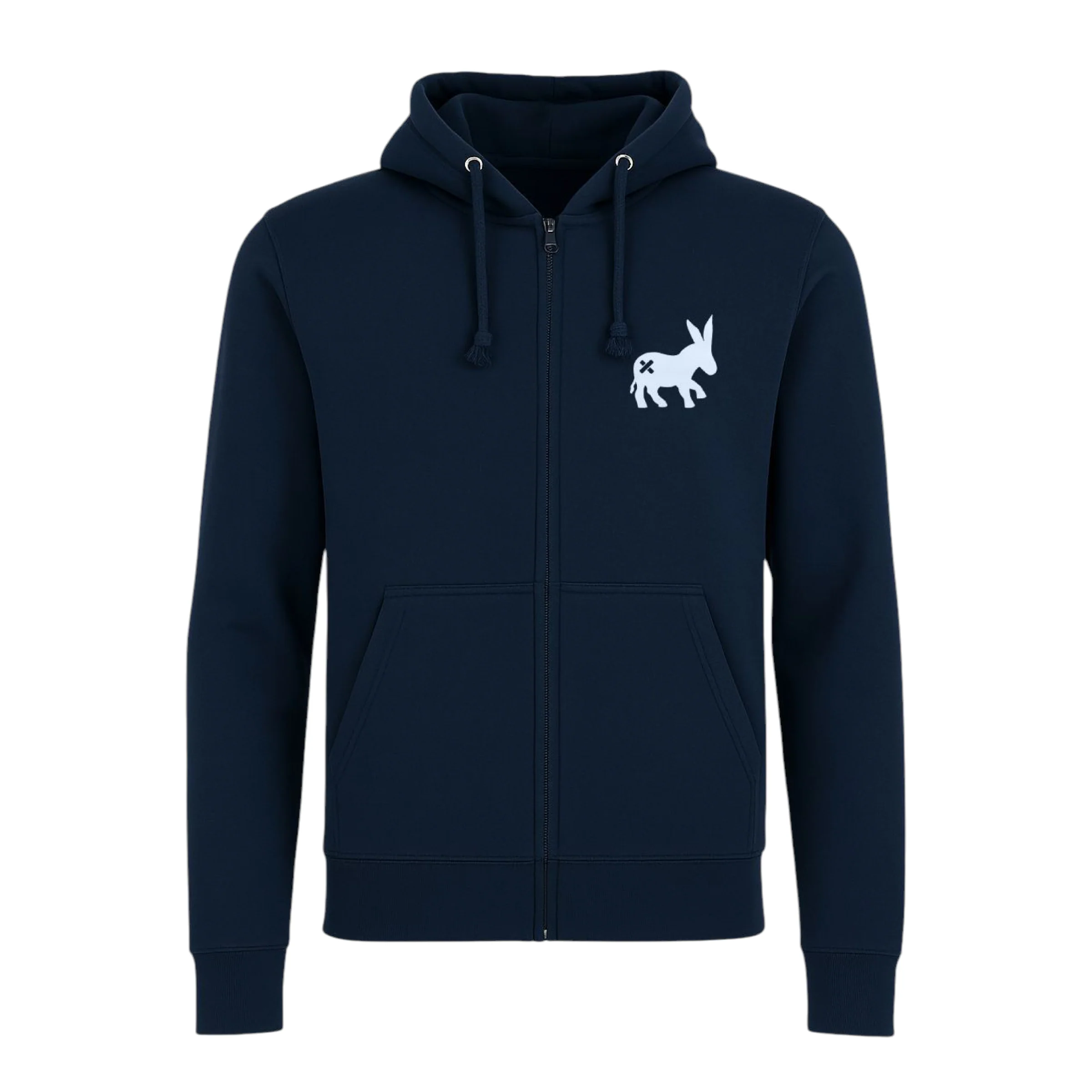Felpa con cerniera, cappuccio e tasca per le mani sul davanti, logo Asino con toppe davanti e dietro “Sensa Cunisiun declina ogni responsabilitร per qualsiasi atto di stupiditร indotto dall’uso di questo capo. L’uso improprio di questo capo puรฒ portare a stati permanenti di immaturitร e goliardia. essere lavata dalla neve almeno una volta al mese”