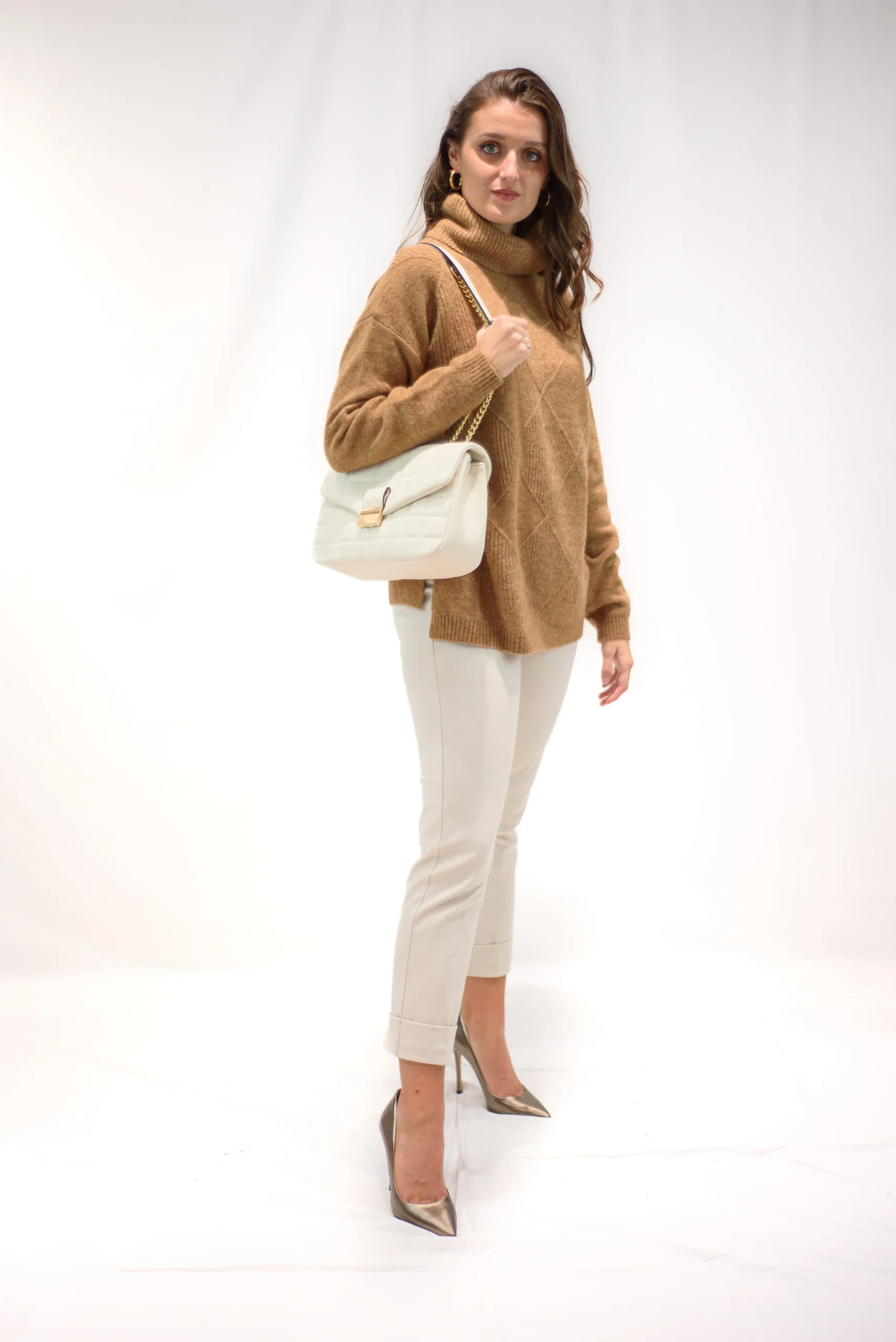Maglia lana Mohair a rombi Composizione: 18,00 % lana vergine – 48,00 % acrilico – 2,00 % elastan – 6,00 % metallo – 26,00 % poliammide col 129 Cammello