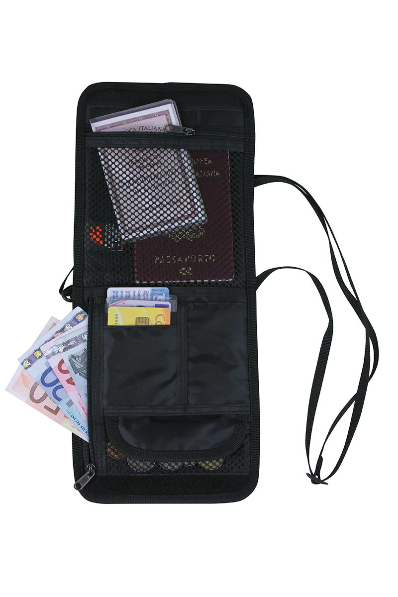 Porta documenti traspirante dotato di molti scompartimenti separati per riporre passaporto, soldi, carte di credito e molto altro. Pratico e comodo, indossabile sia a tracolla che a vita.