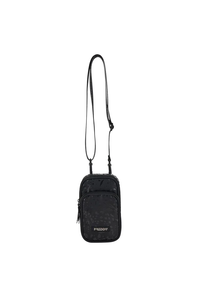Mini borsello phone case in nylon stampato a fantasia animalier perfetto per portare con te il cellulare e l’essenziale sentendoti libera e leggera. Ha chiusura con zip sul lato superiore, taschino frontale zippato e tracolla logata regolabile. Il logo Freddy applicato sul taschino completa i dettagli di stile.