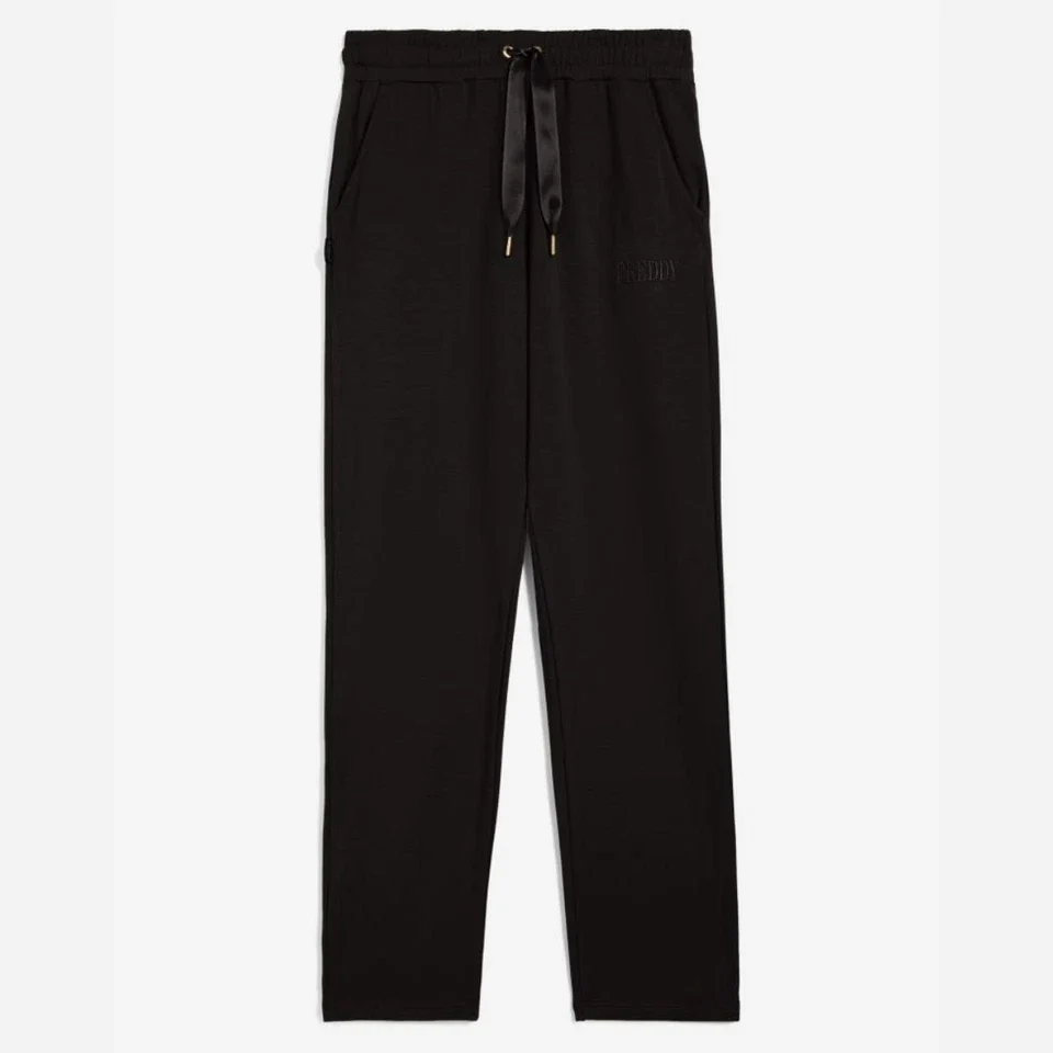 Pantaloni Freddy in felpa viscosa elasticizzata, un tessuto caratterizzato da morbidezza, flessibilità e lucentezza.