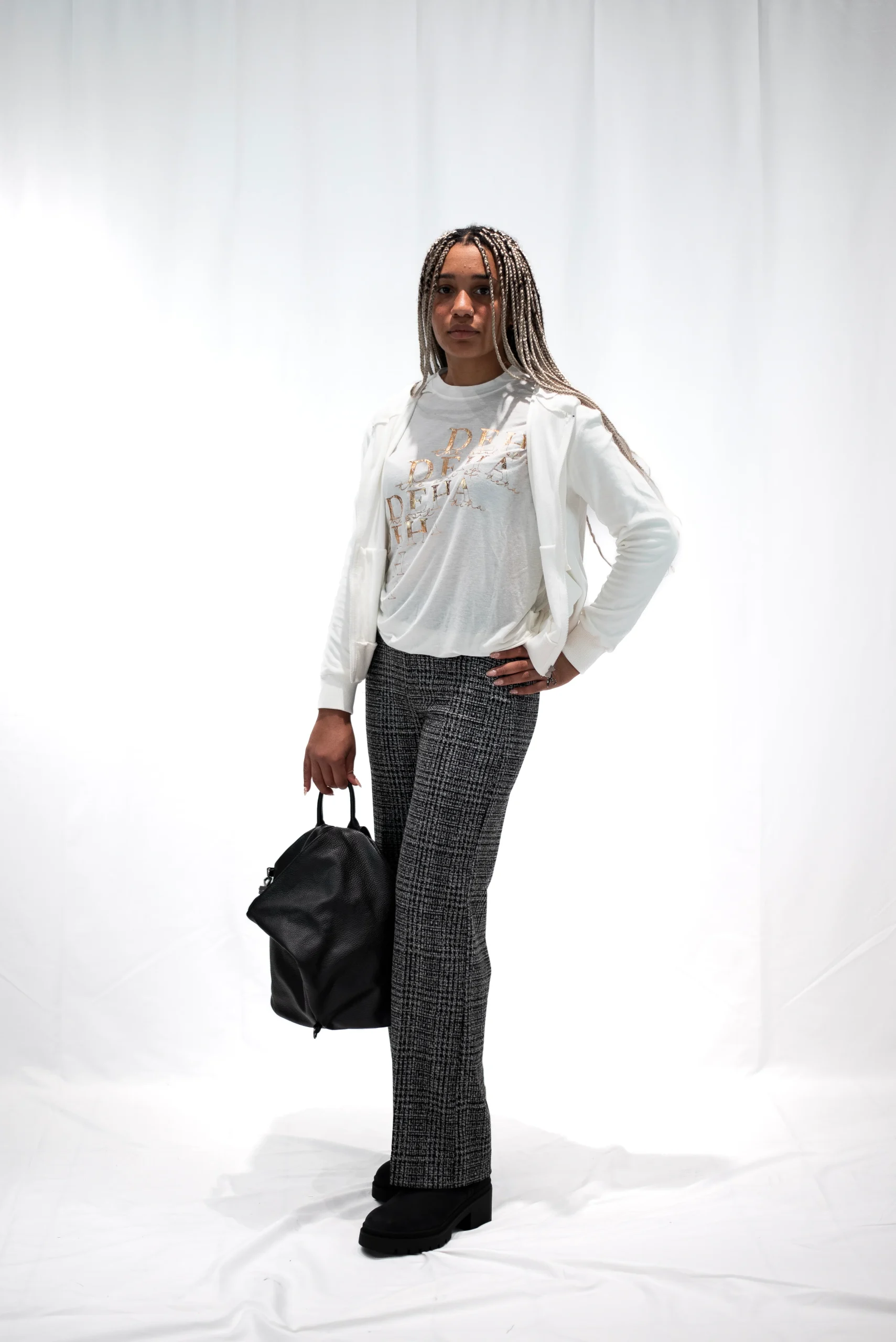 Capo di abbigliamento elegante e raffinato, caratterizzato dalla presenza di un tessuto jacquard stile principe di Galles. Perfetto per creare un look casual chic in stile DEHA.