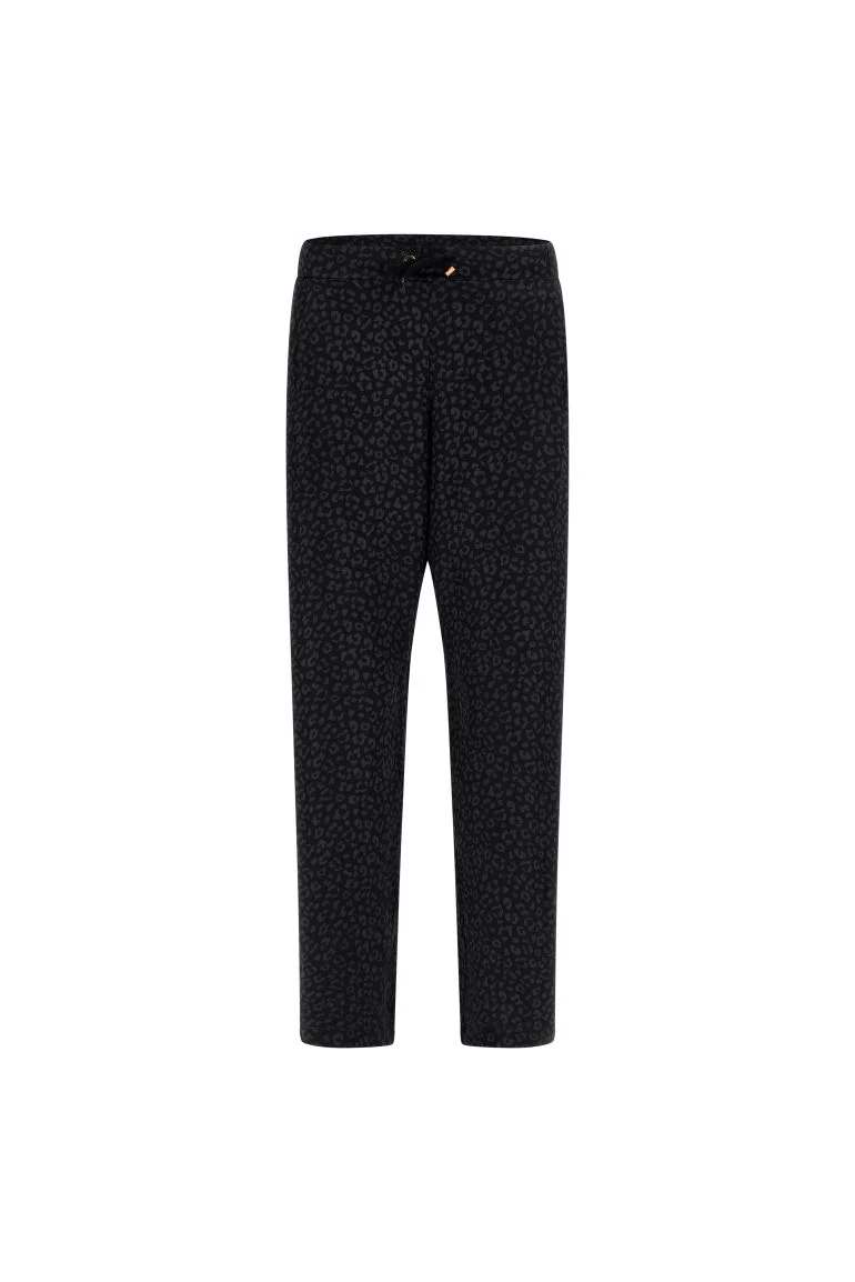 Pantaloni in tessuto satin con stampa animalier in colore nero all over. Il modello presenta vita con elastico interno posteriore e coulisse, tasche interne alla francese e fondo dritto. Il logo FY lucido posizionata sotto la tasca sinistra completa i dettagli. Capo fresco e piacevole da indossare in cui la comodità del design è esaltata dal panneggio morbido e fluido del tessuto piacevole al tatto che dona una gradevole sensazione di freschezza sulla pelle.