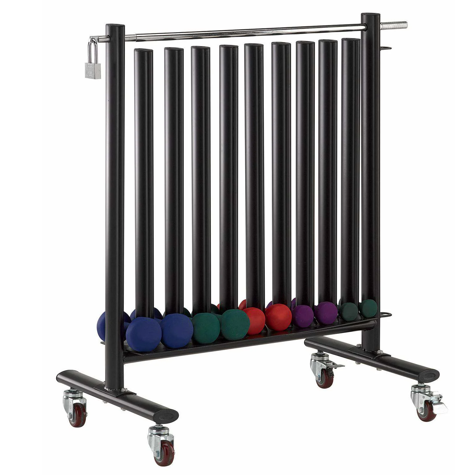 Storage manubri ad inserimento verticale. La barra di chiusura lo rende sicuro in ambienti ad uso collettivo. Dotato di ruote di trasporto a cuscinetto e freno.