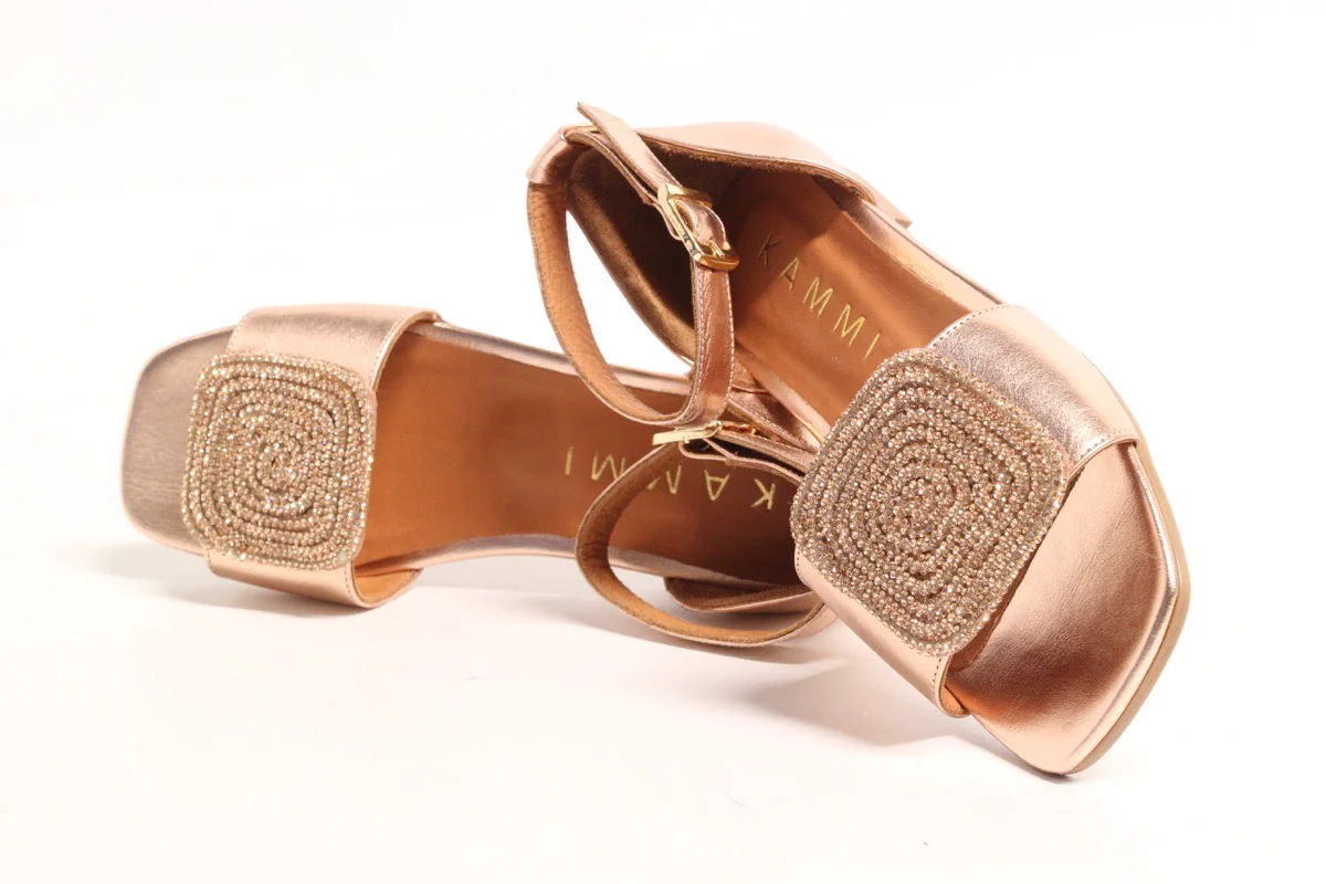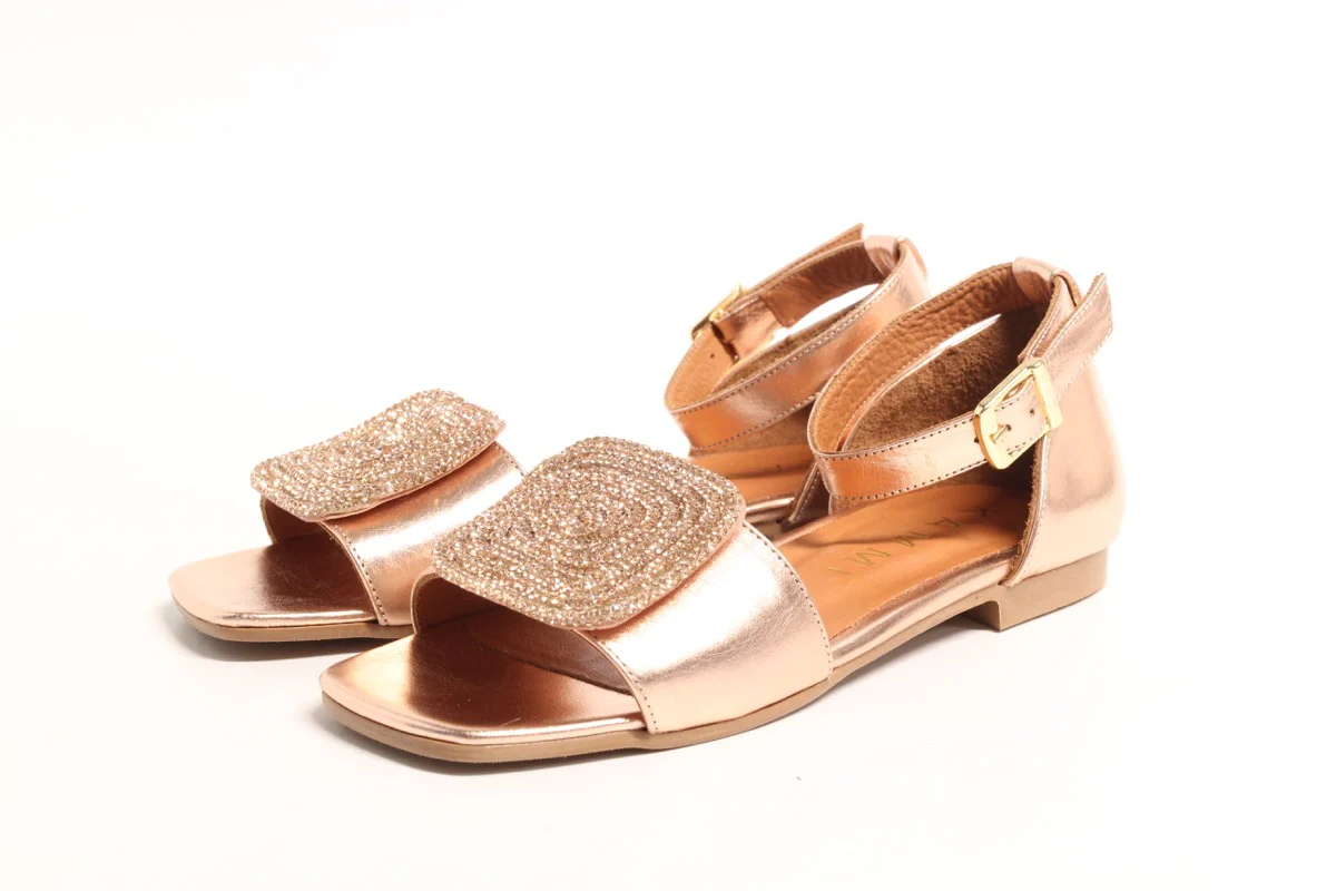 Sandalo Donna Basso Modello con fascia pelle oro con strass e parte chiusa dietro Chiusura con cinghietto alla caviglia Suola in gomma Tacco cm 1