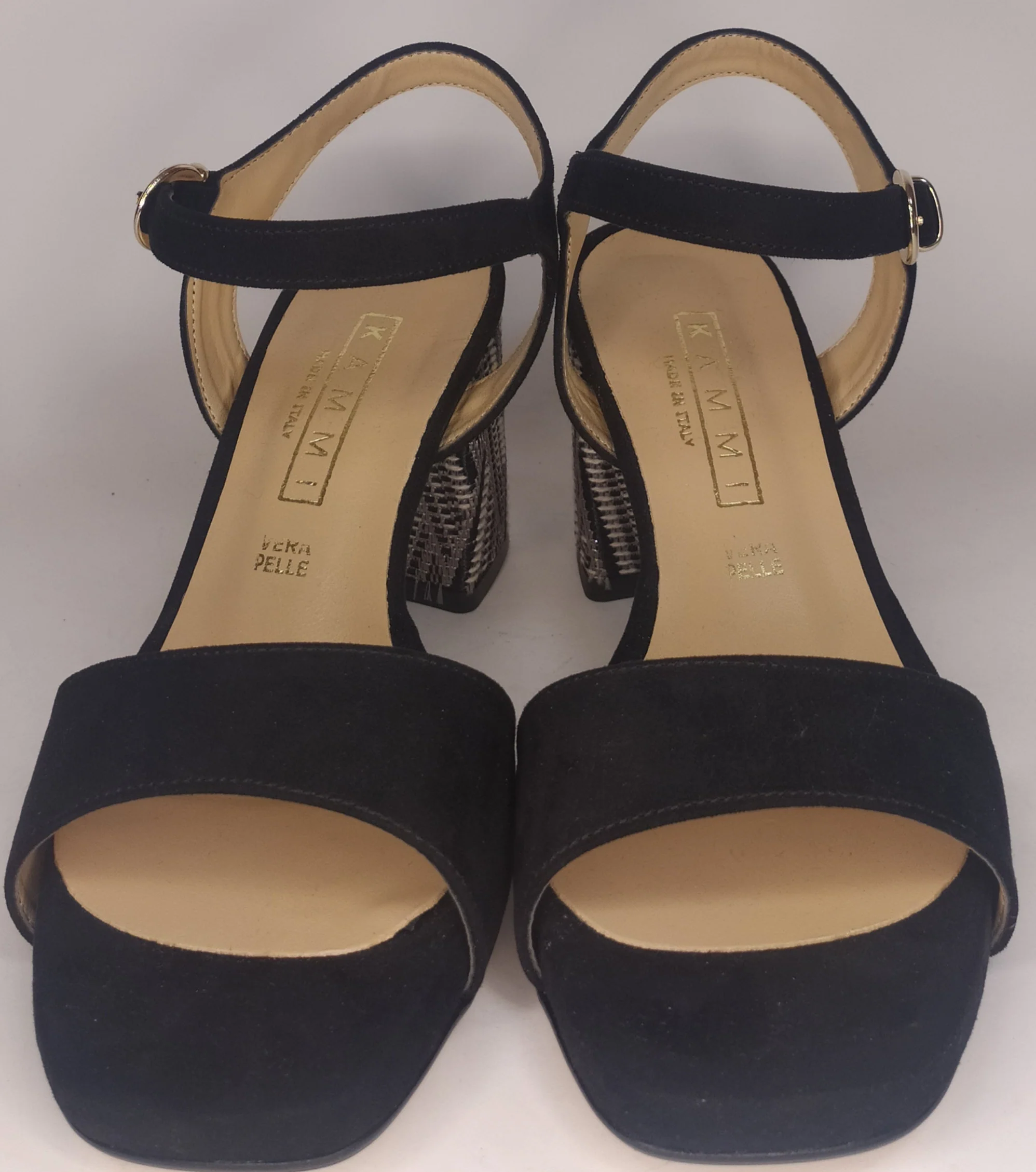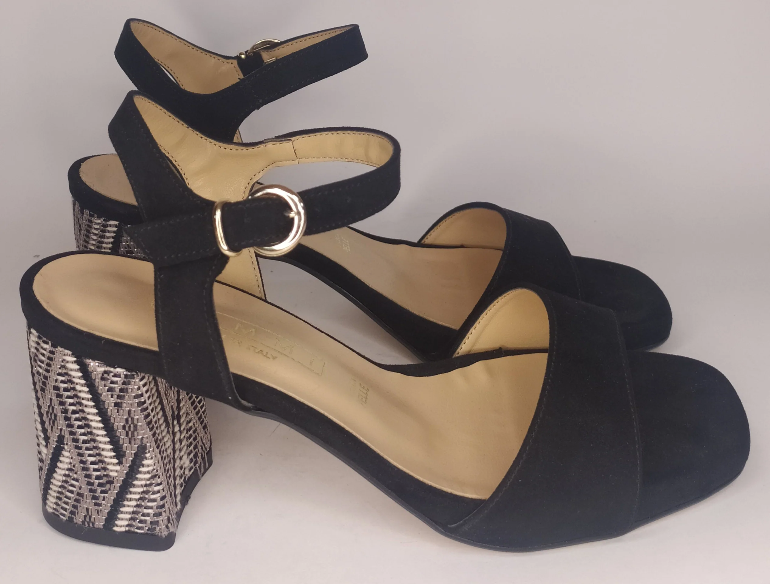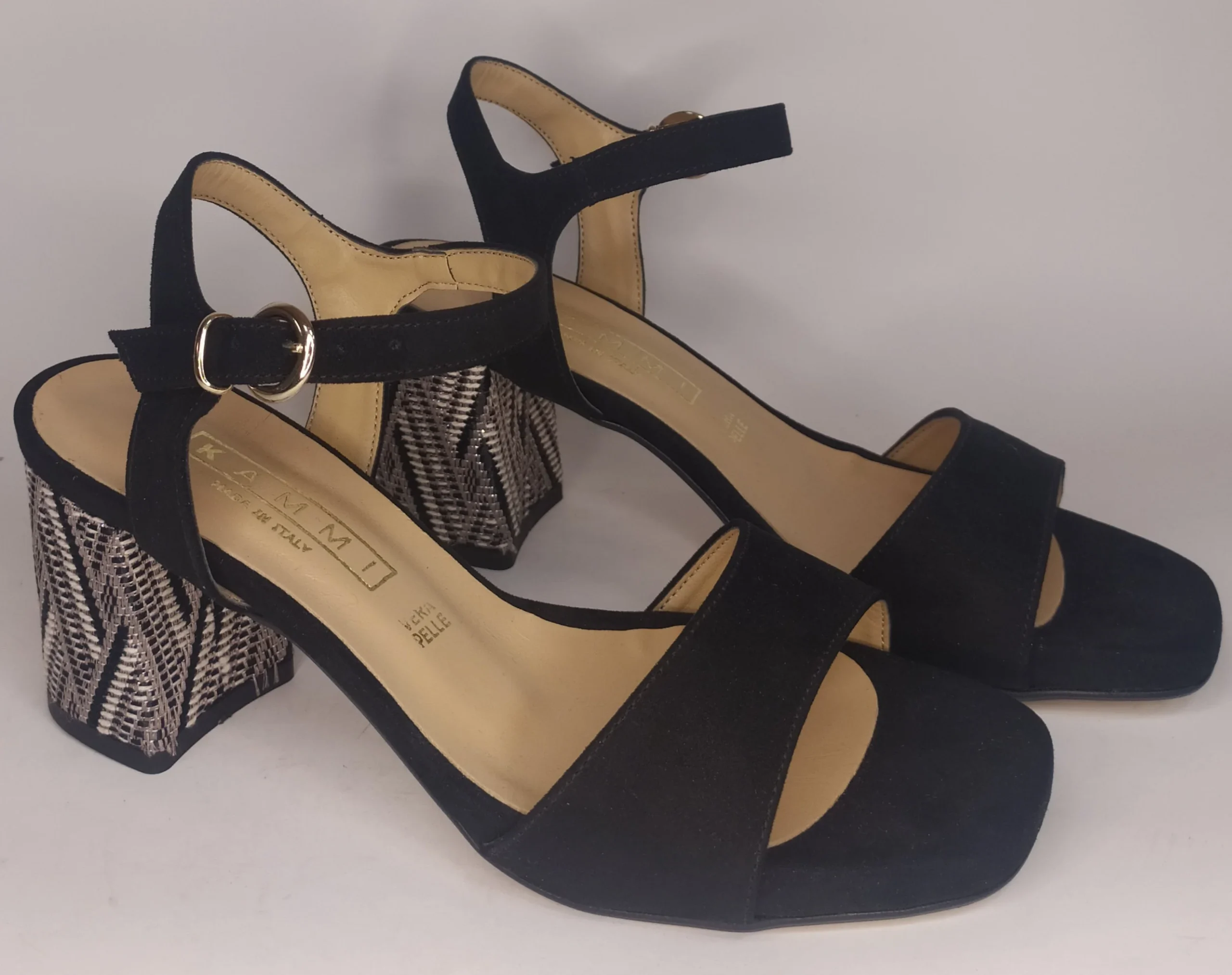 Sandalo donna nero con tacco comodo con decorazione etnica 1266 Materiale ecopelle effetto camoscio color nero Tacco cm 6 con lavorazione colore nero e beige Plantare in pelle Chiusura con cinturino alla caviglia