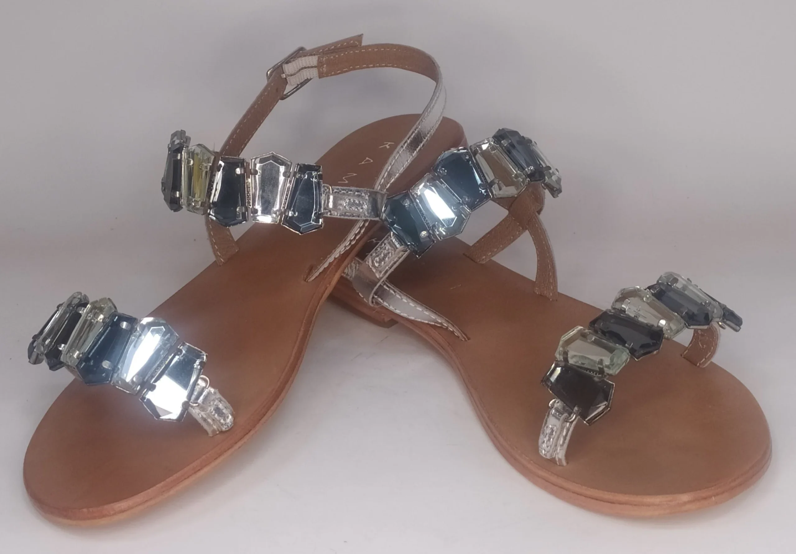 Sandalo gioiello con due cinturini interamente in pelle rivestiti di strass modello 5312-MYA con suola in cuoio tacco cm 1