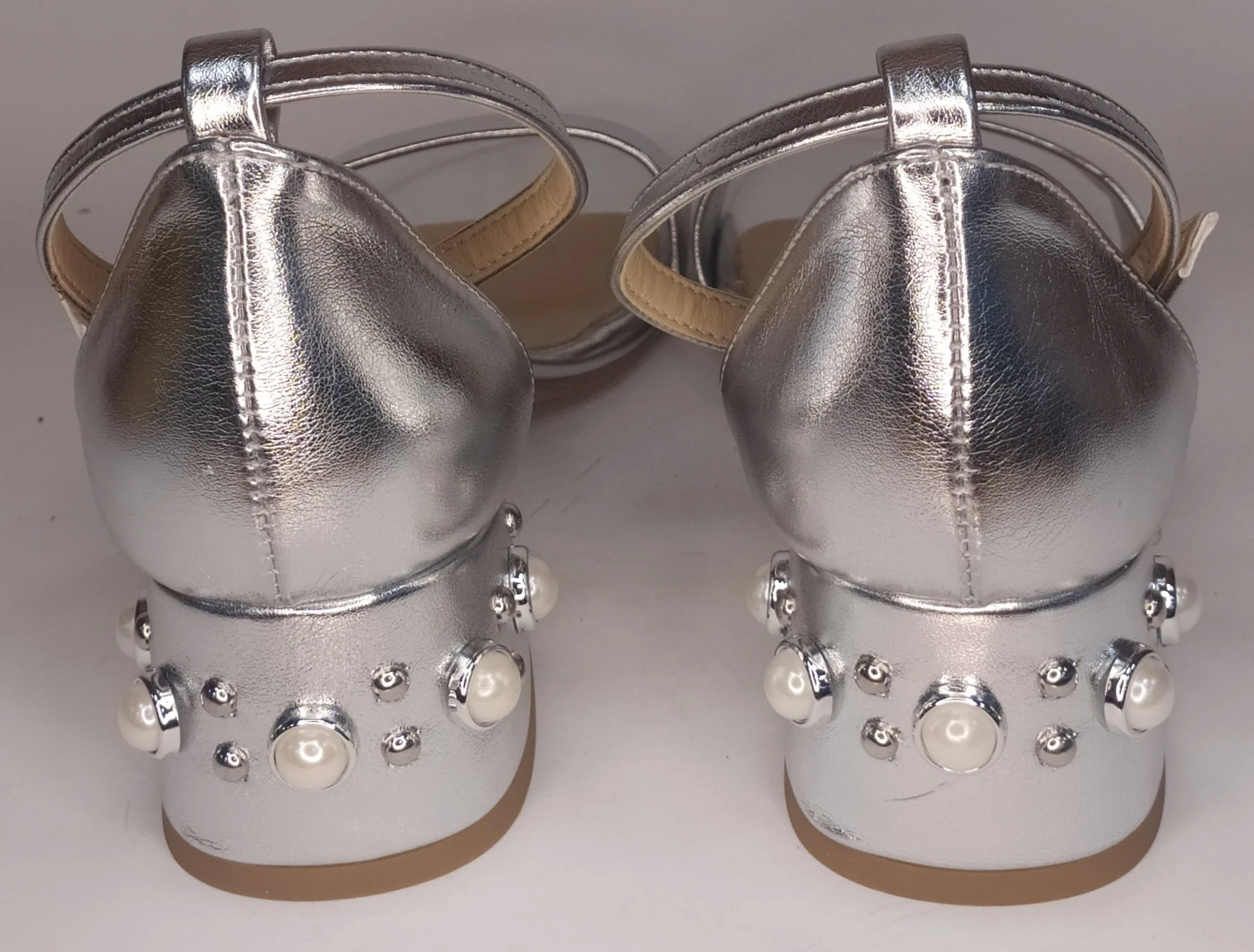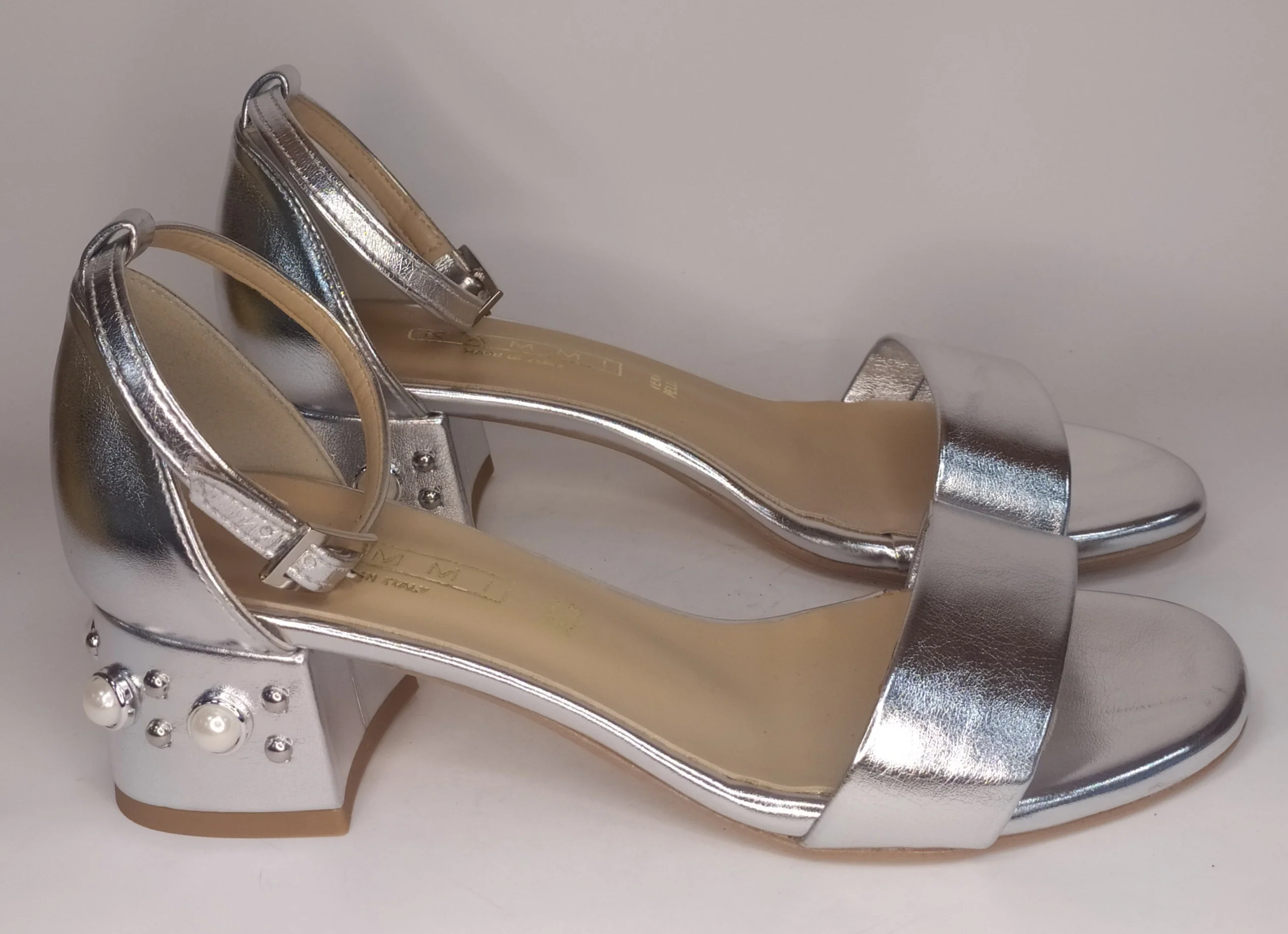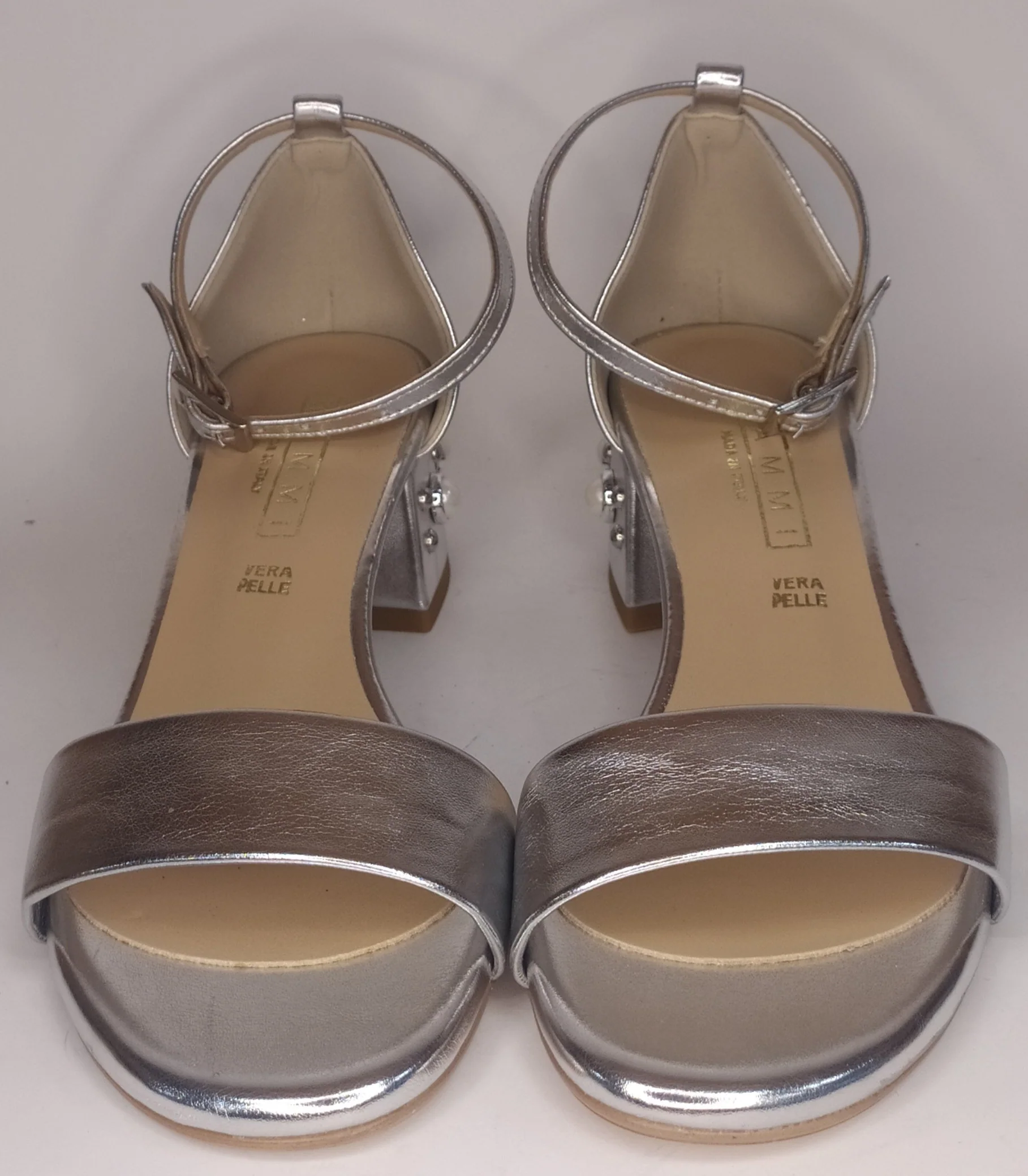Sandalo donna in ecopelle argento con fascia sul piede MODELLO 1333 Tacco cm 3 con inserti di perline Chiusura coin cinturino alla caviglia Plantare in pelle