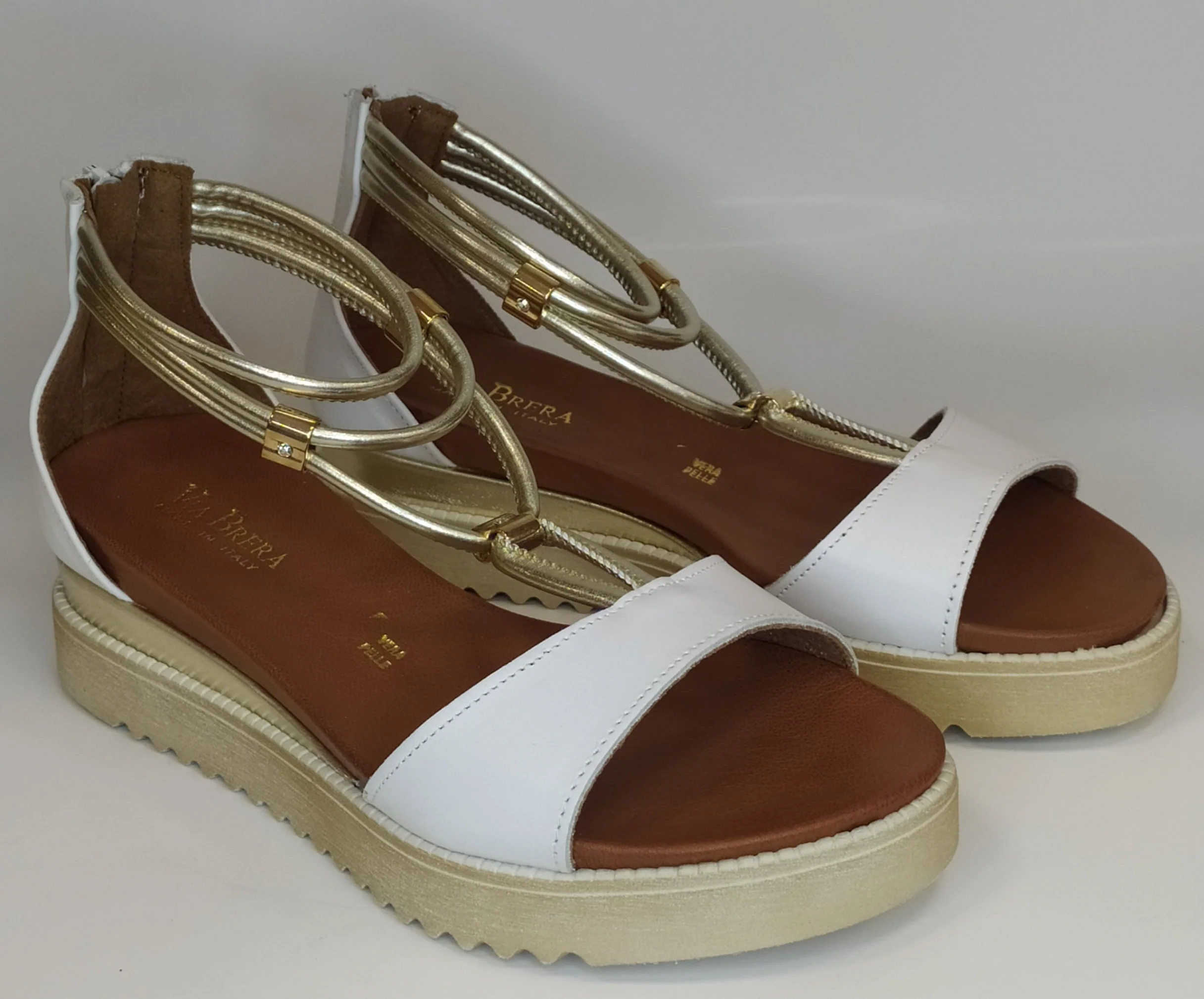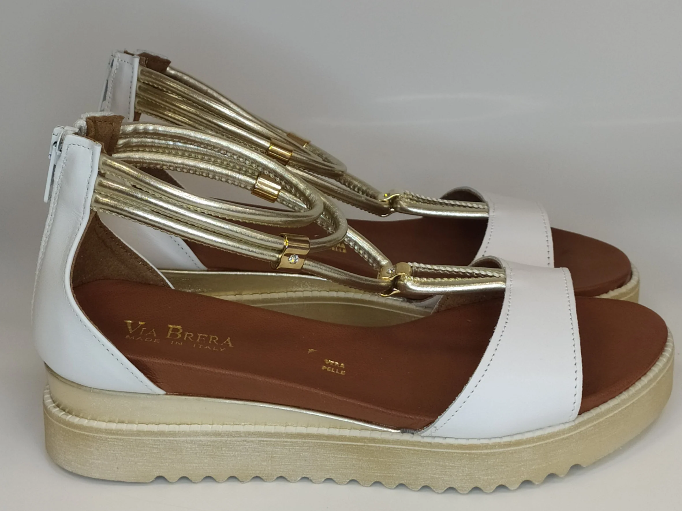 Sandalo in pelle bianco con cinturini pelle oro sul collo del piede e chiusura con cerniera Plantare in pelle con rialzo cm 3 Suola in gomma