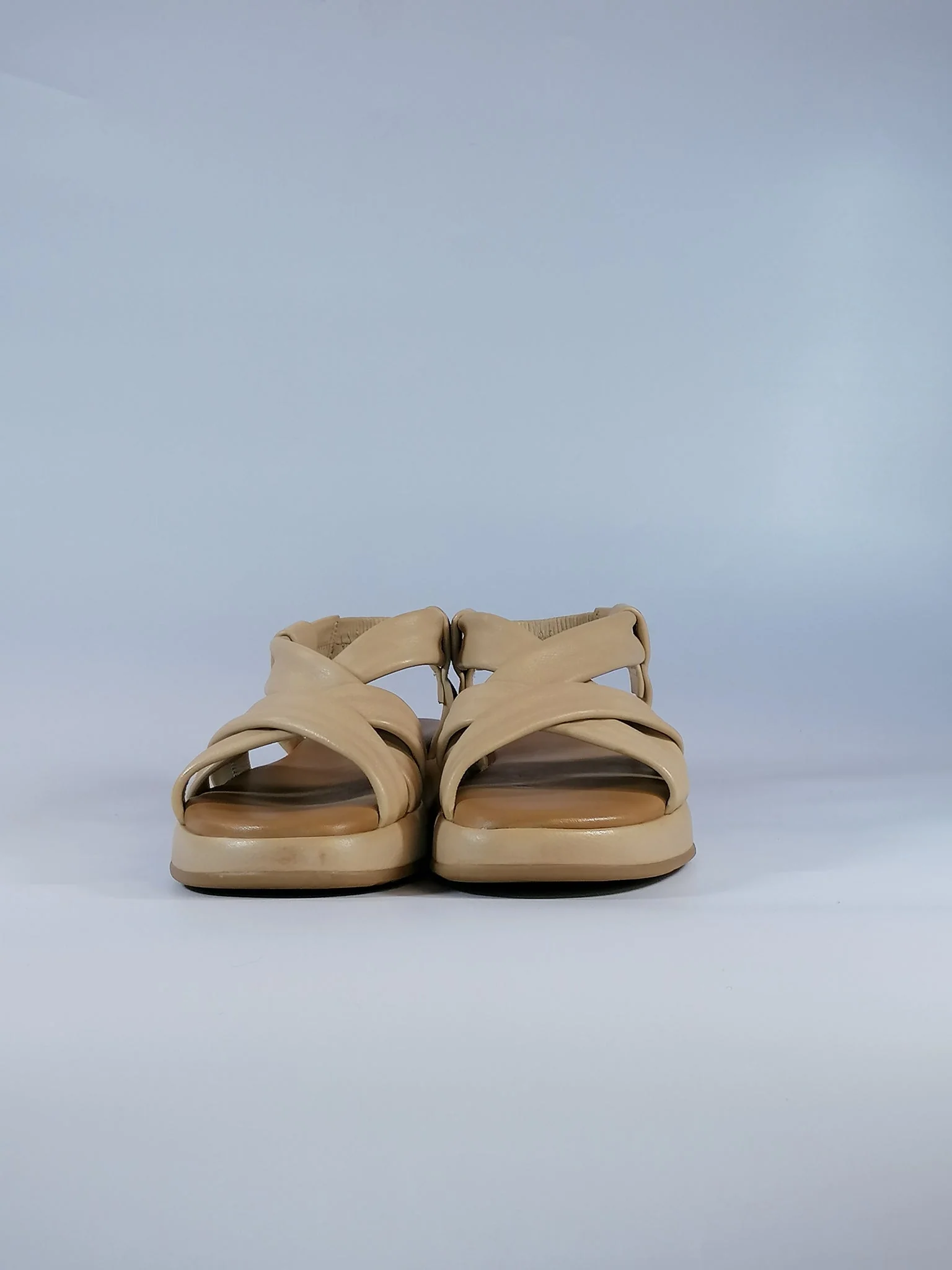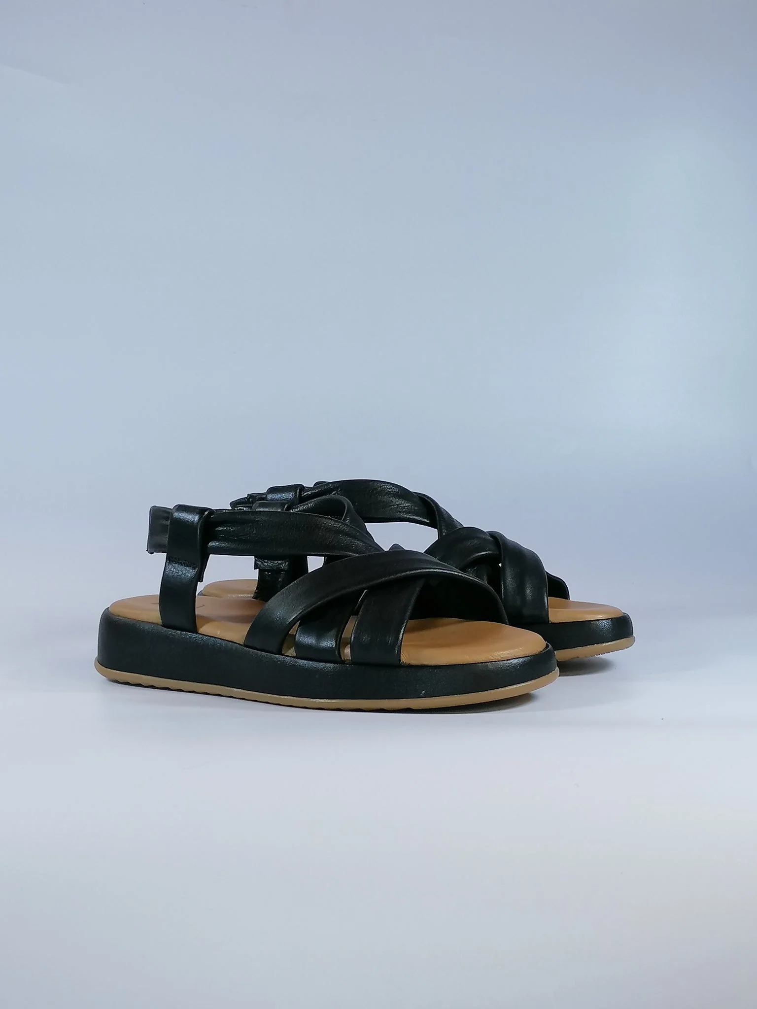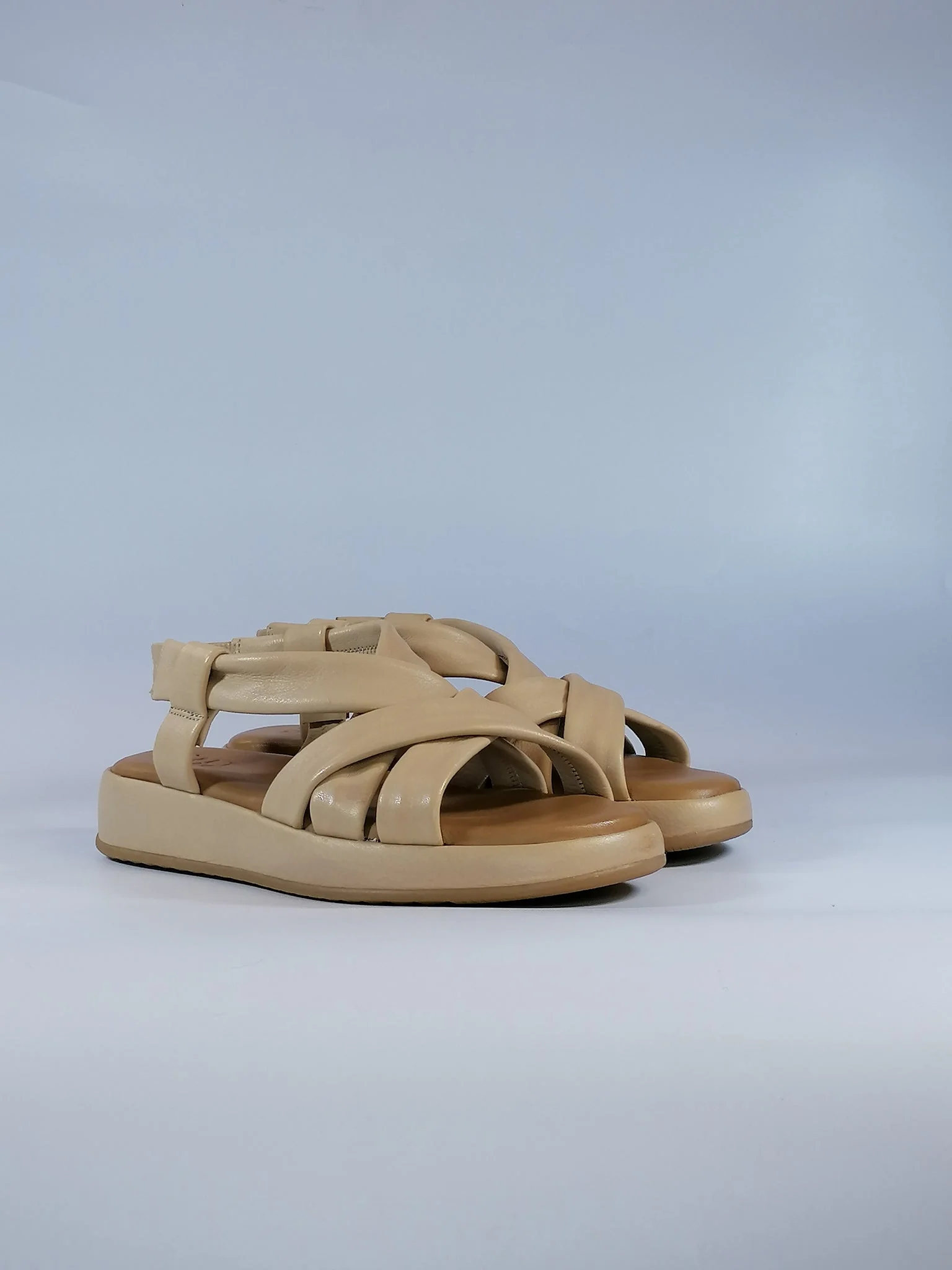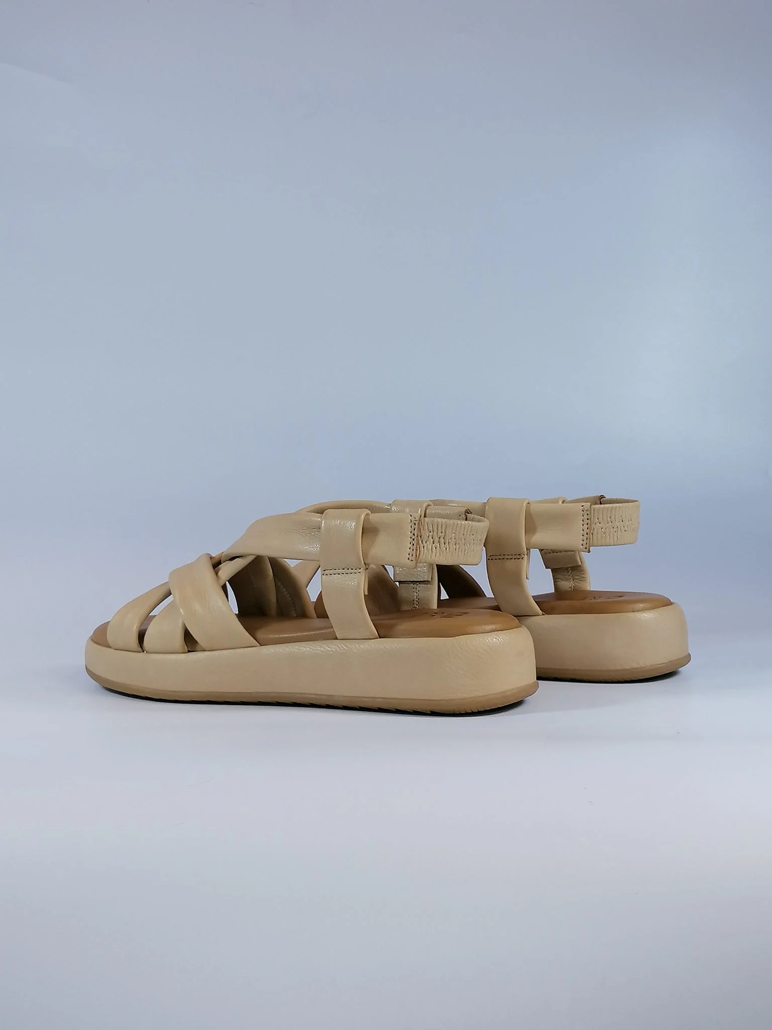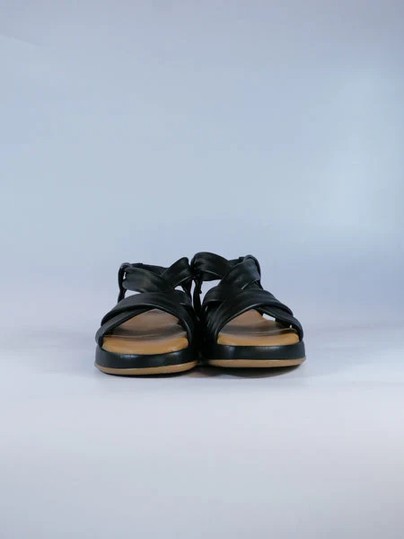 Sandalo Donna in pelle 47112 Modello con fasce incrociate e chiusura con elastico. Zeppa cm 3 Tomaia in pelle e plantare con cuscinetto in morbida pelle. Suola in gomma Disponibile in color NERO o IVORY