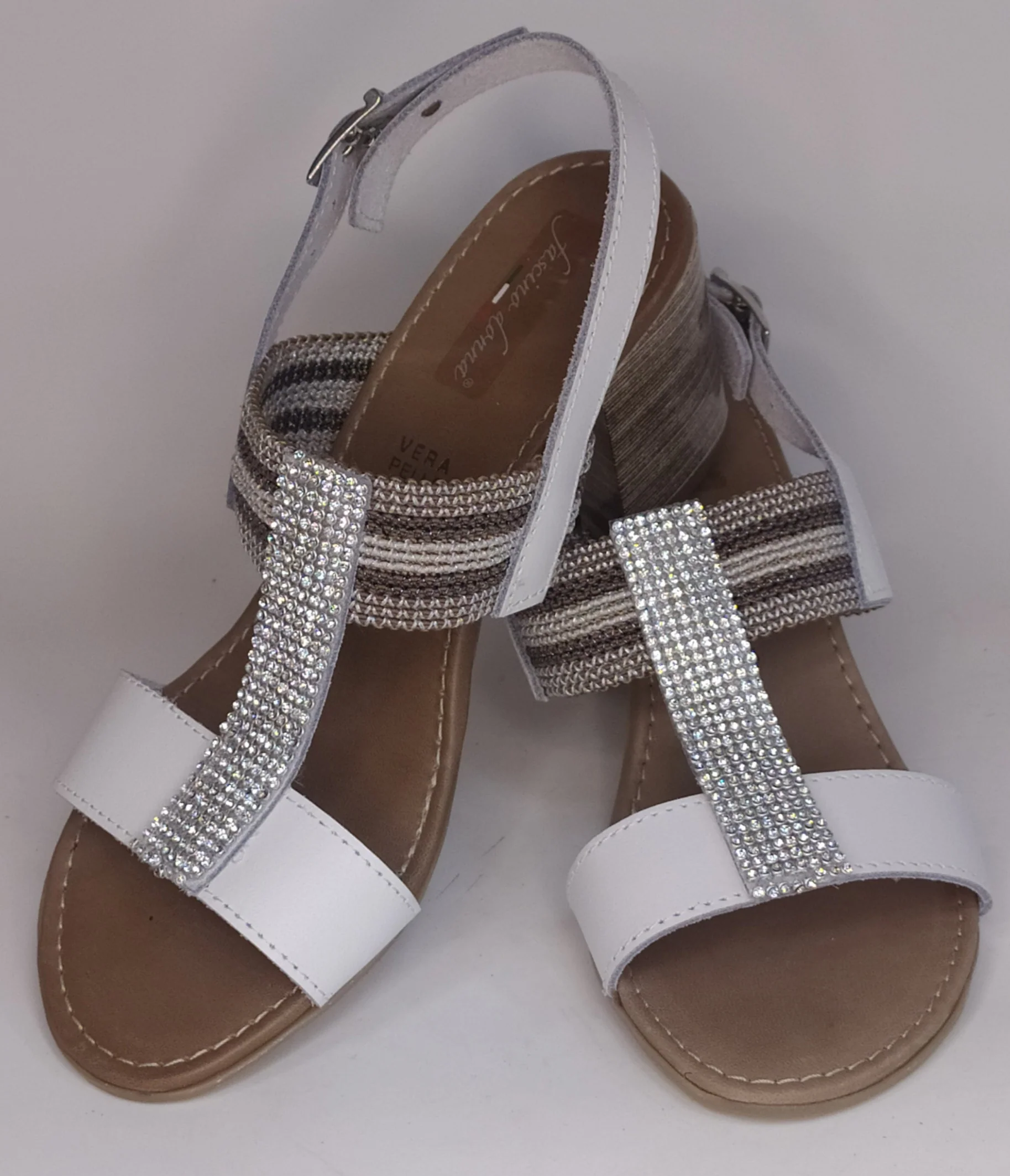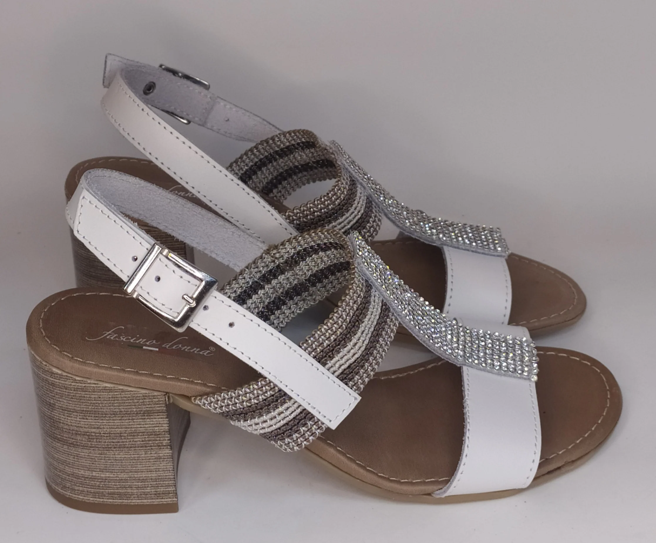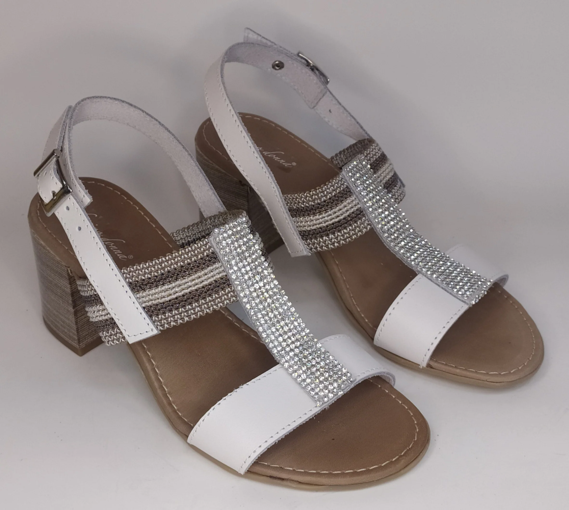 Sandalo in pelle bianco con tacco Tomaia con una striscia in pelle bianco e una in tessuto elasticizzato in nuance di beige, con striscia di strass sul collo del piede modello 31229 Plantare in pelle Chiusura con cinturino e fibbia alla caviglia Tacco 6 cm