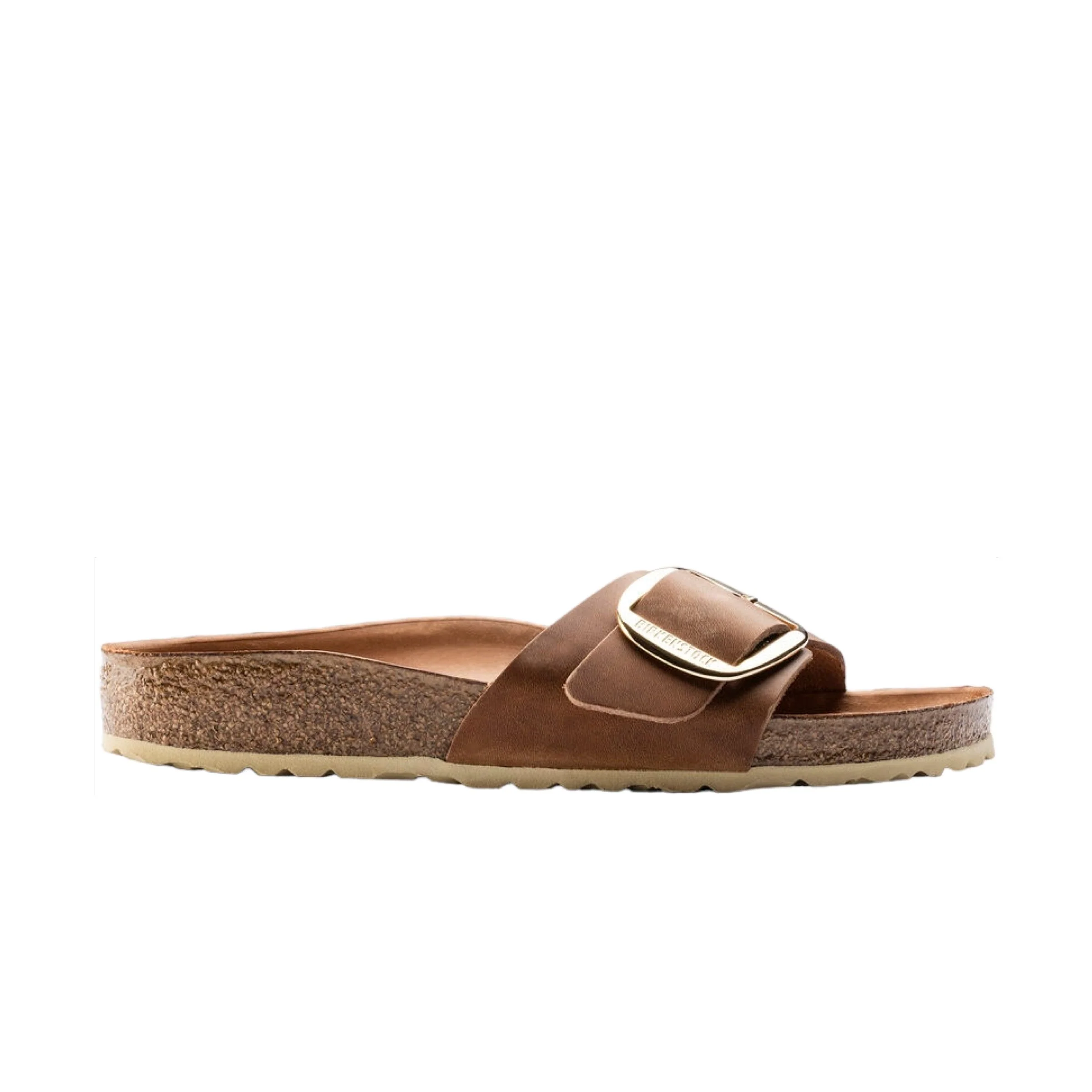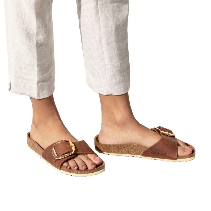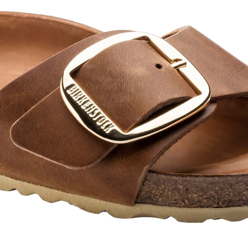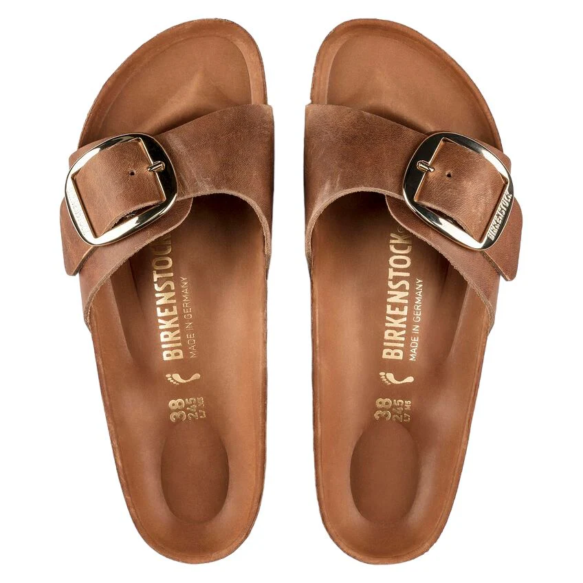 Il modello BIRKENSTOCK Madrid è un vero classico che entusiasma il mondo della moda con il suo design essenziale. La variante Big Buckle presenta una fibbia ad ardiglione grande ed elegante, un bel particolare che spicca su questi sandali molto sobri. Il sottopiede del plantare semi-exquisit è rivestito in morbida pelle liscia in colore coordinato alla scarpa. La tomaia è composta da pelle nabuk particolarmente spessa e oliata, lavorata a cuciture aperte. Plantare anatomico in sughero e lattice; semi-exquisit Tomaia: pelle nabuk oliata Sottopiede: pelle liscia Suola: EVA Dettagli: un cinturino con fibbia ad ardiglione in metallo regolabile individualmente; plantare in colore coordinato “Made in Germany” Materiale superiore: Pelle oliata La pelle oliata è una delle nostre preferite. La sua superficie oleosa e cerata crea effetti di colore unici e una bellissima patina. Il finish oliato dei nostri prodotti naturali in pelle porta a una conseguente variazione del colore e rende ogni paio unico. Suola interna: Nappa La nappa è una pelle liscia pregiata e particolarmente avvolgente. La nappa si presta molto bene a essere modellata. Per questo è ottima per rivestire i plantari. Materiale del plantare: Sughero Il sughero è una materia prima che ricresce, ottenuta dallo strato superficiale della quercia da sughero. Questo prodotto naturale isola dal caldo e presenta ottime proprietà ammortizzanti. Suola: EVA EVA (etilene vinil acetato) è una plastica pregiata, particolarmente leggera ed elastica, dotata di proprietà ammortizzanti straordinarie. È in grado di compensare lievi irregolarità del terreno e ammortizza dolcemente i passi durante la camminata.