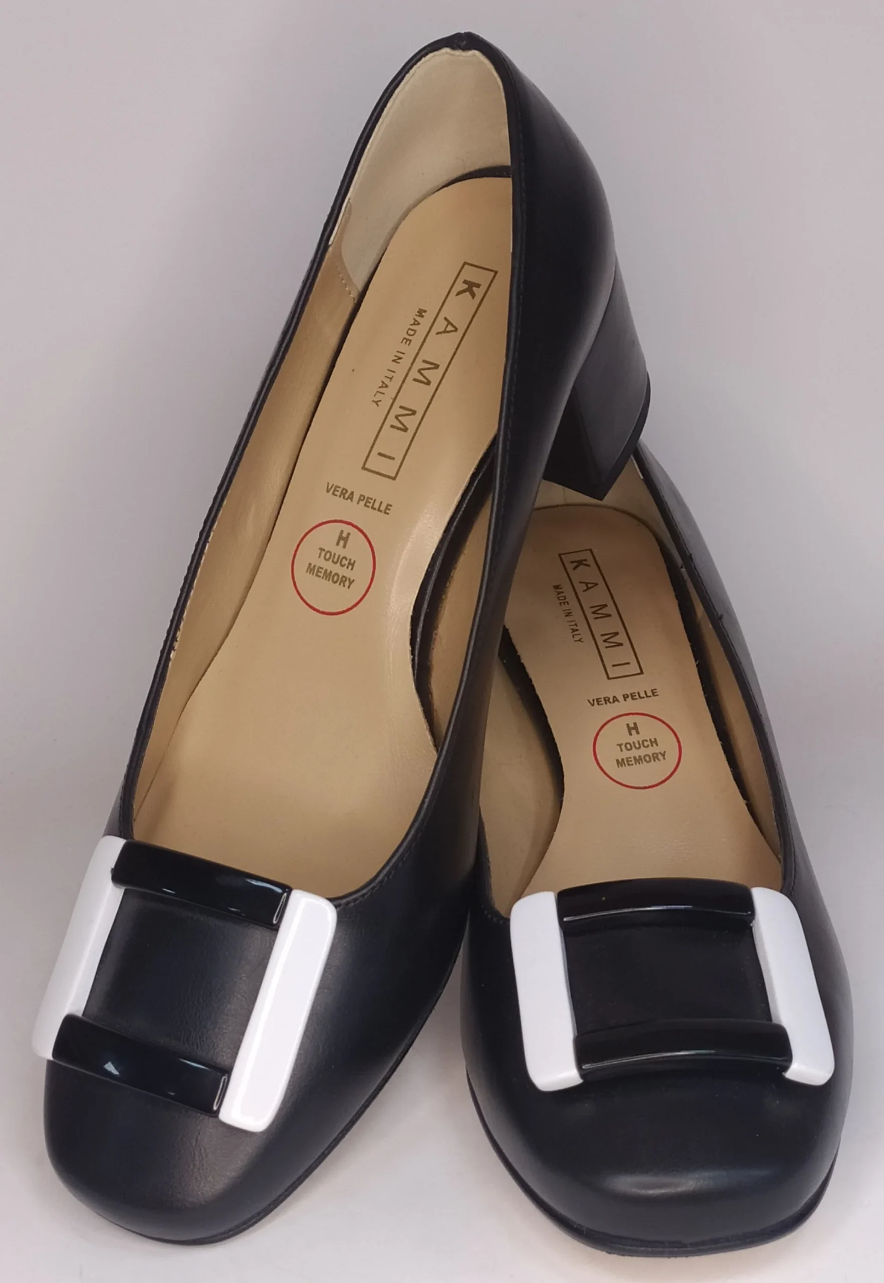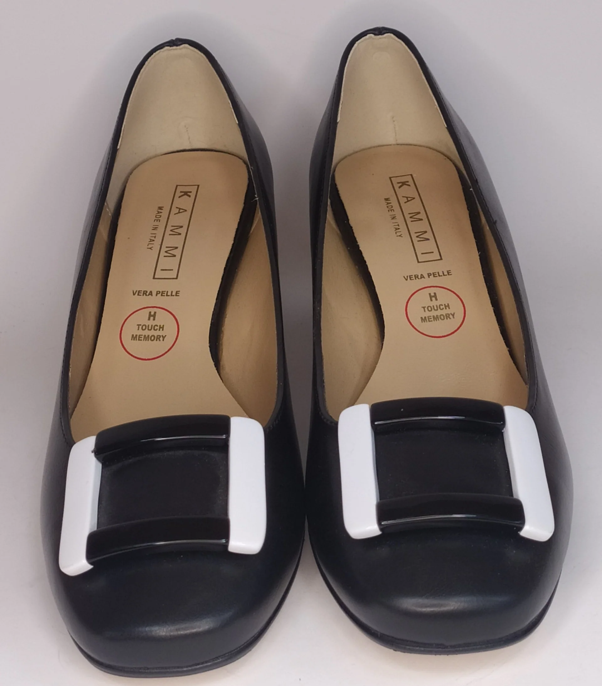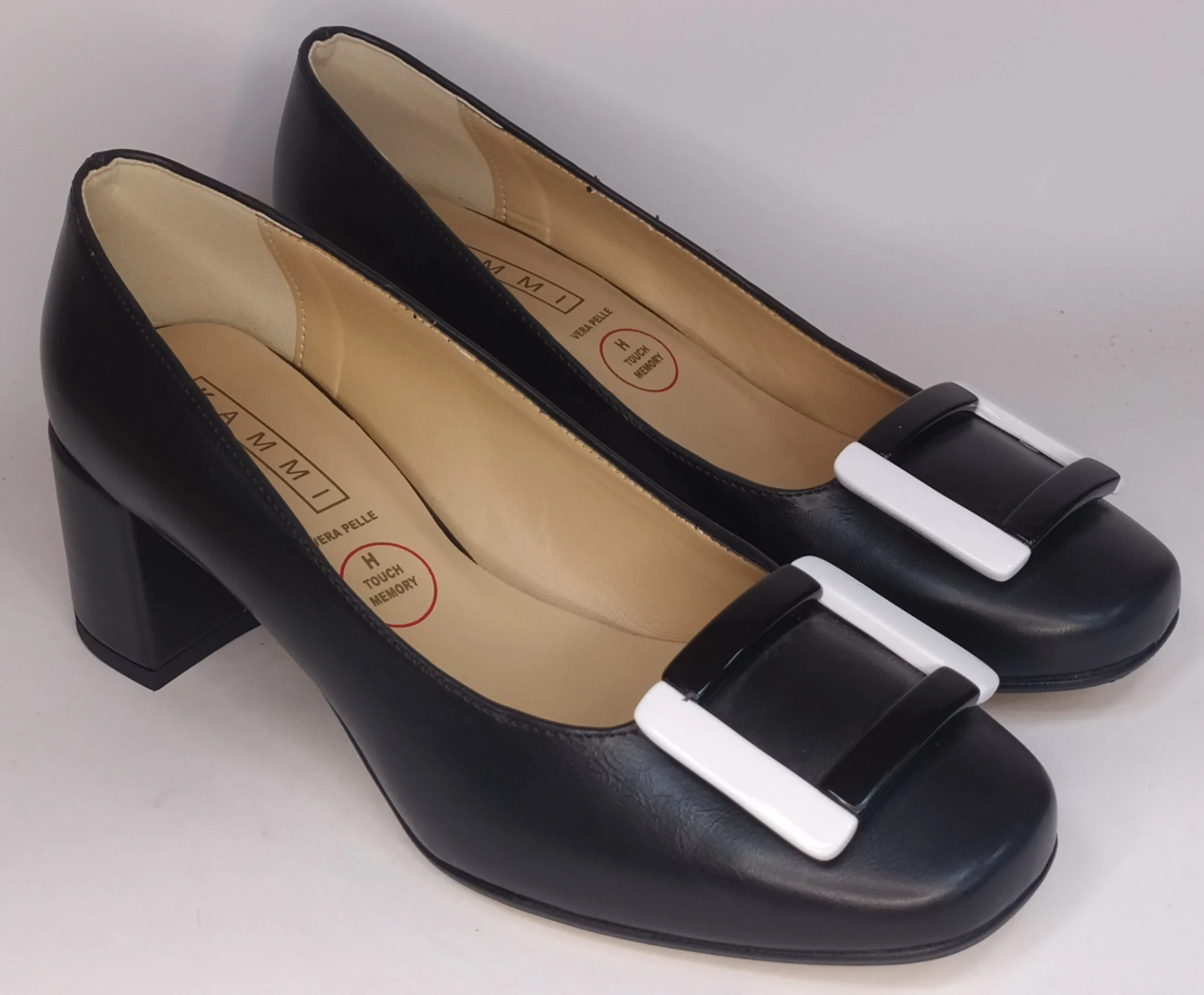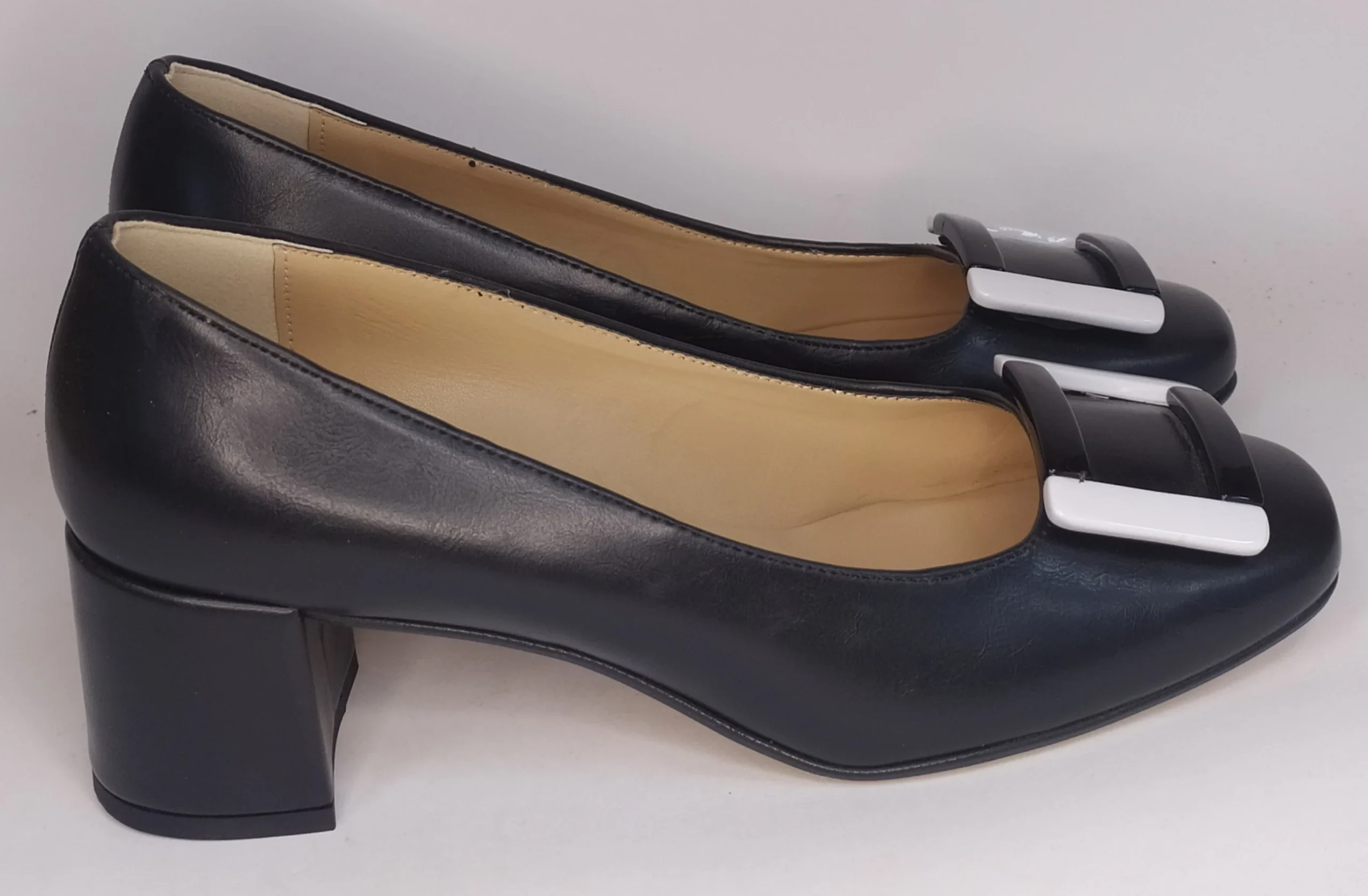 Scarpa donna con tacco comodo color nero Materiale ecopelle finitura pelle nera Modello con fibia bianca e nero Plantare in pelle con cuscinetto touch memory Tacco cm 5
