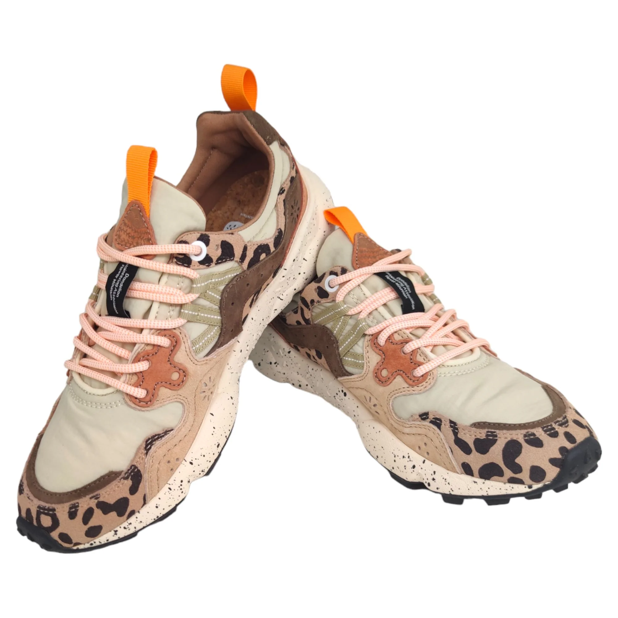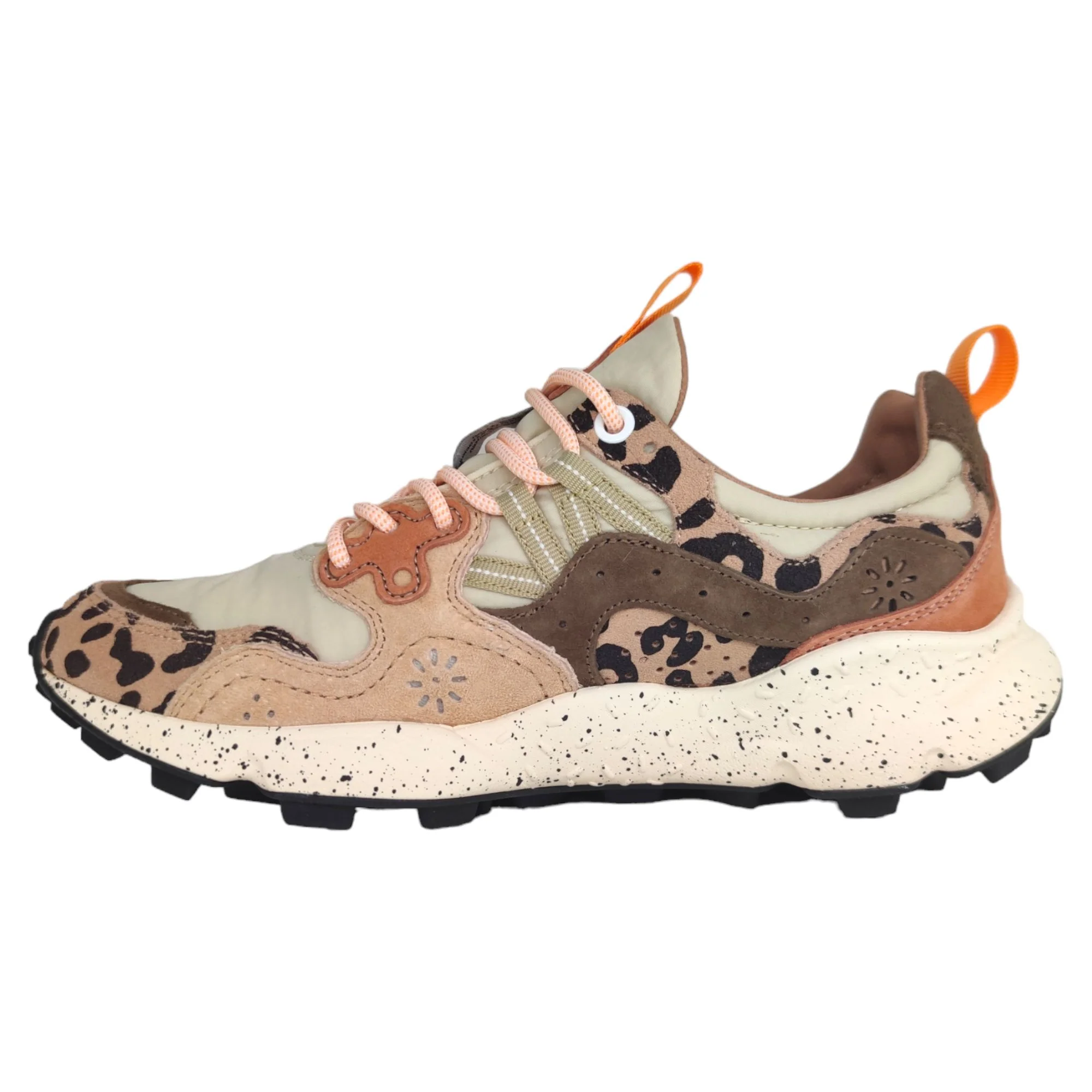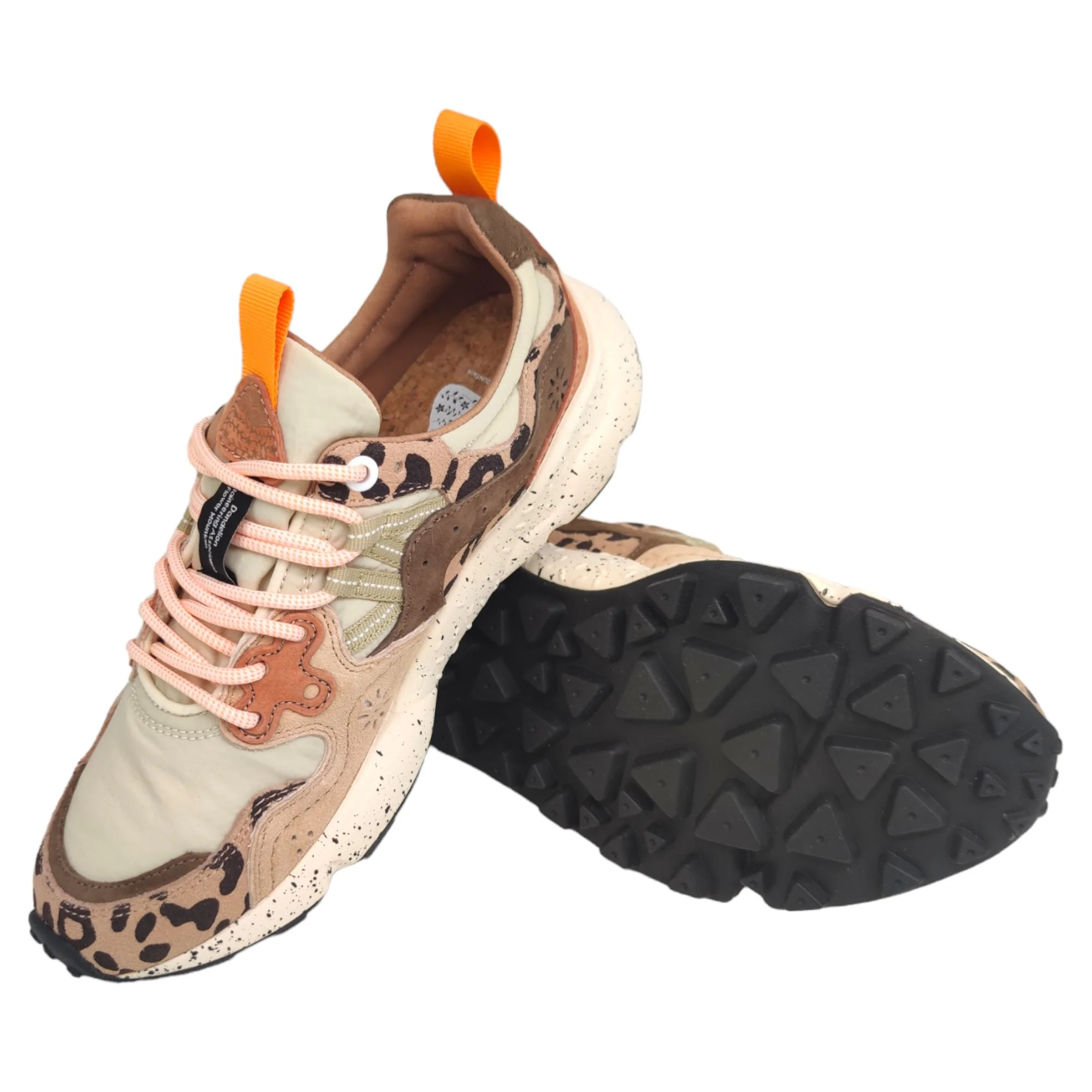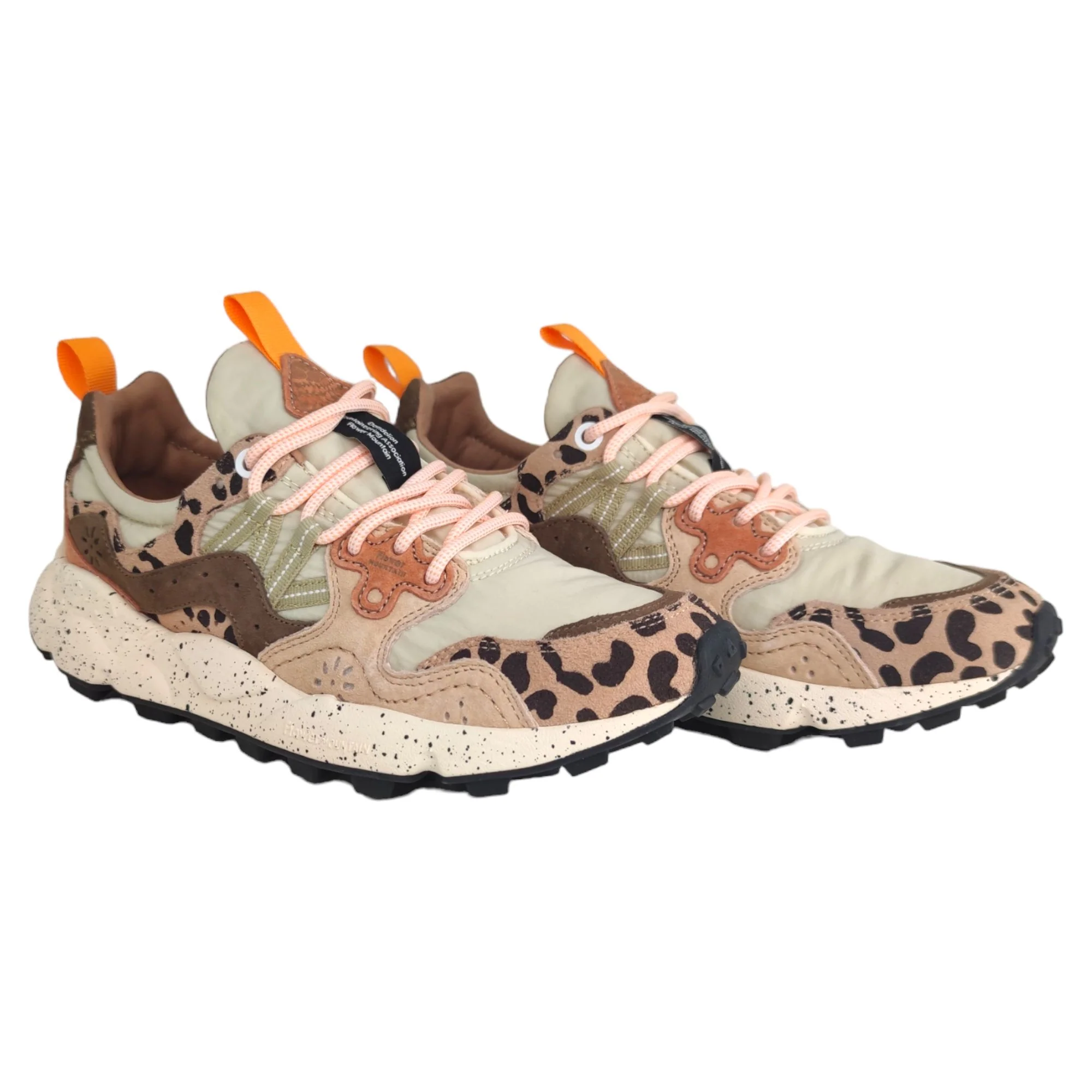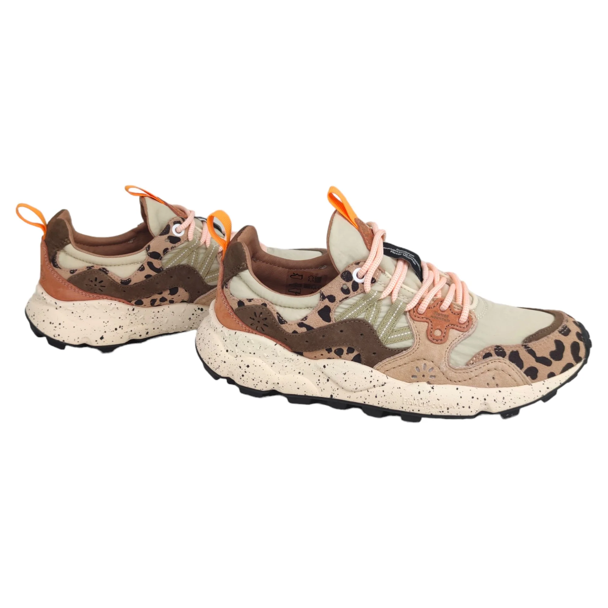 Le Flower Mountain Yamano 3 Print sono sneakers che uniscono il design giapponese alla qualità artigianale italiana. Ispirate alla natura e al trekking, queste scarpe offrono una fusione di tessuti tecnici e pelle, con dettagli come lacci da trekking e iconici occhielli in pelle. La fodera in pelle e il sottopiede in sughero naturale, trattato con AGION per prevenire muffe e batteri, garantiscono igiene e comfort. La suola in gomma leggera con particolare grip è ideale per le attività outdoor, rendendole perfette per chi cerca stile e funzionalità