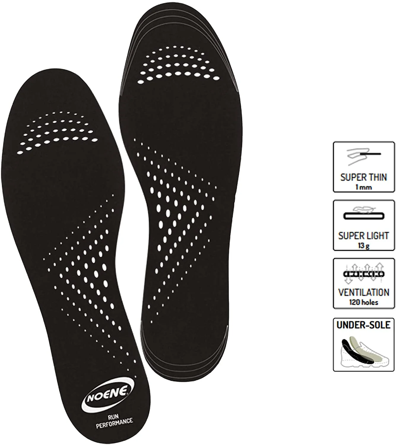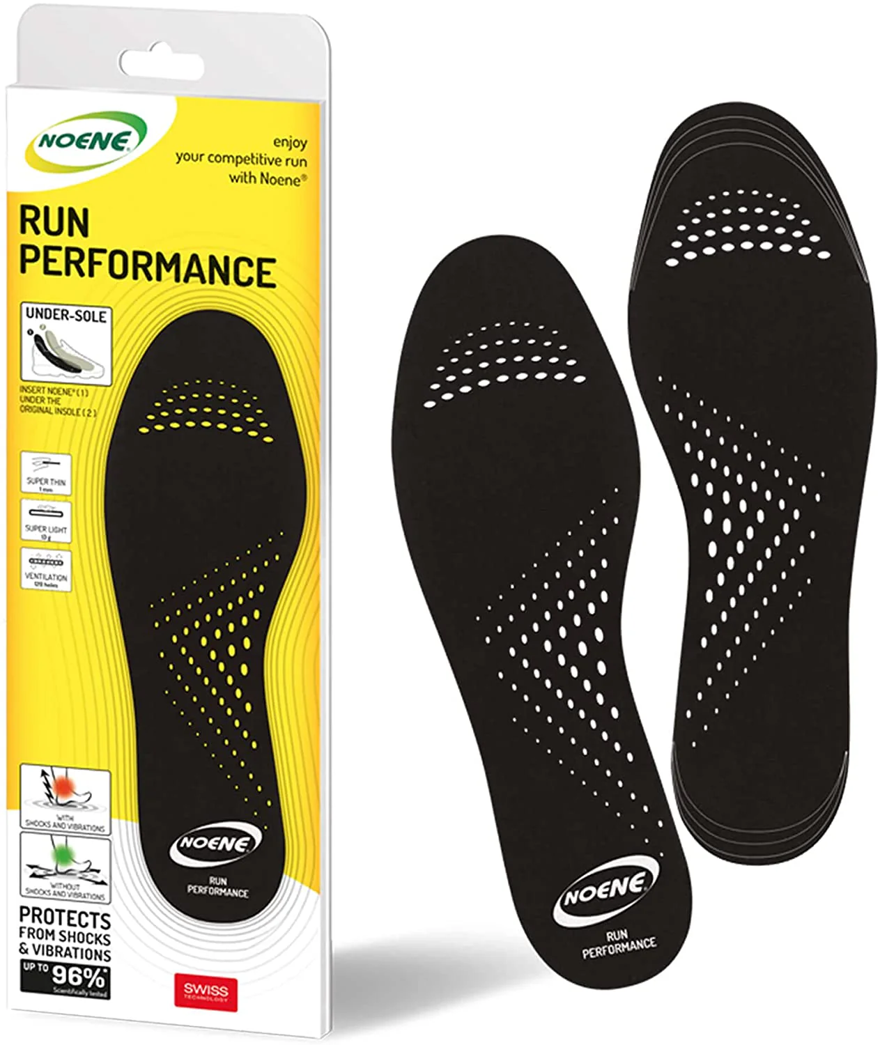 Le solette UNDER-SOLE RUN PERFORMANCE sono molto leggere, pesano solo 13 g. Proteggono con uno spessore di 1 mm senza cambiare o alterare le prestazioni della tua scarpa. Sono realizzati con fori di ventilazione funzionali ed ergonomici e non hanno rivestimenti in tessuto.