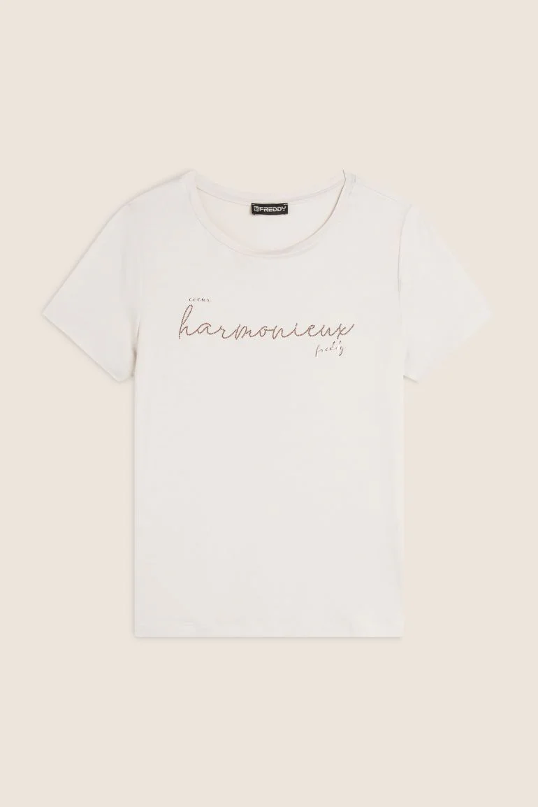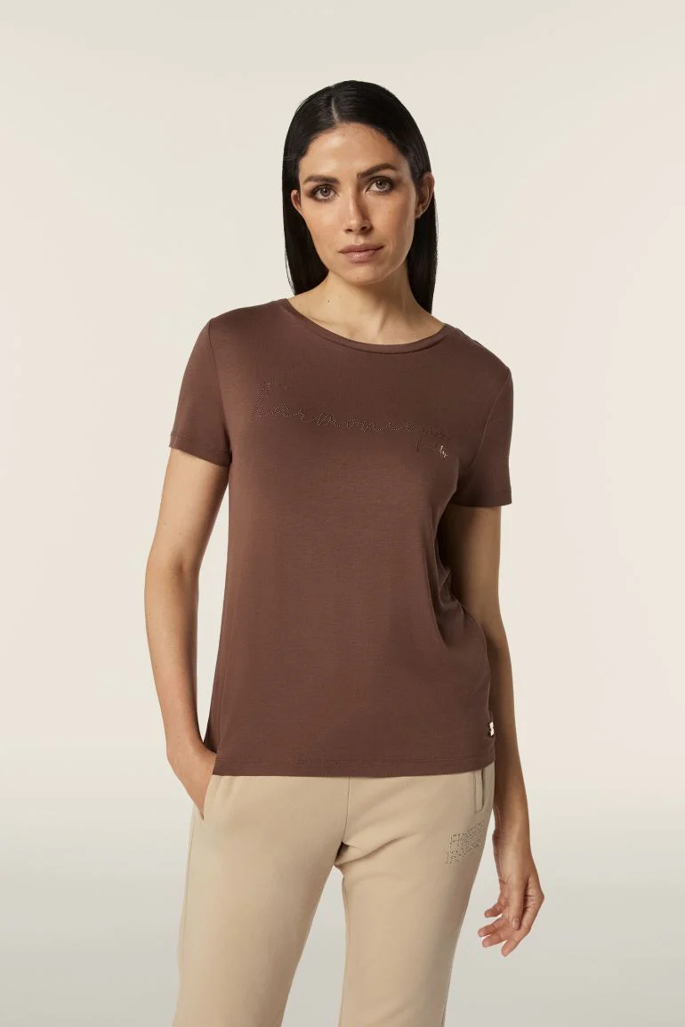 Scopri il comfort e la brillantezza del jersey stretch di viscosa con questa t-shirt donna regular fit. La scritta “Harmonieux” composta da borchie e dettagli in oro rosa dona un tocco di eleganza e originalità. Ideale per chi cerca uno stile casual con un accento di raffinatezza. Girocollo, maniche molto corte e fondo dritto per una silhouette impeccabile.