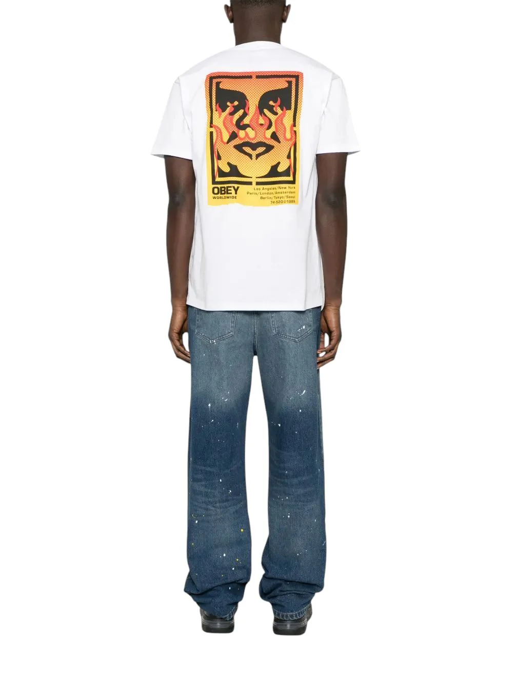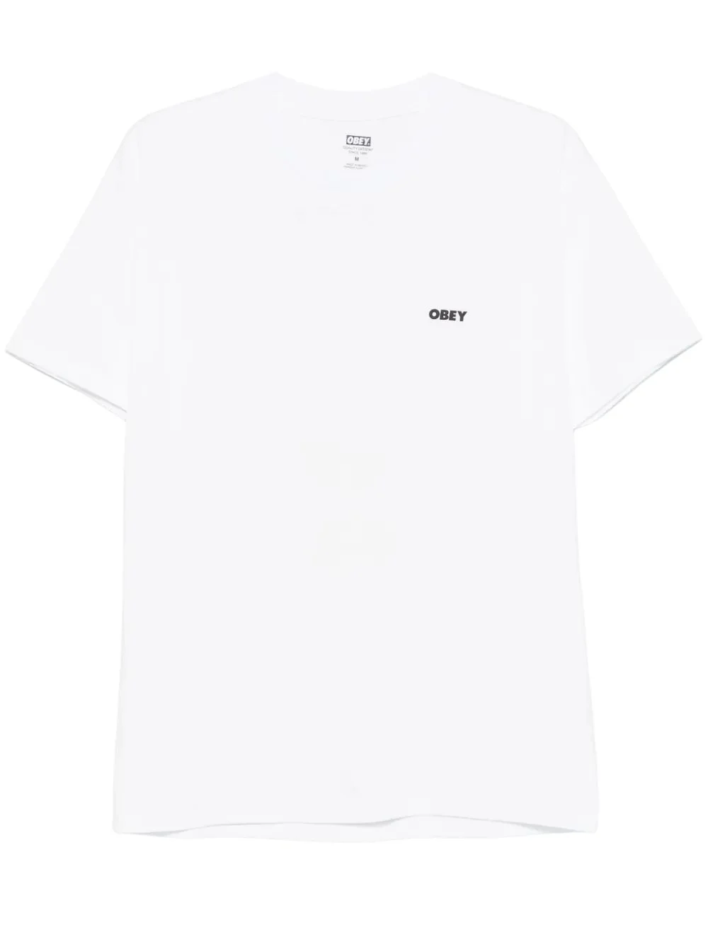Il design presenta una grafica iconica con il logo OBEY in stile stencil accompagnato da dettagli fiammeggianti, aggiungendo un tocco audace al capo. Le maniche corte e lo scollo rotondo classico garantiscono una vestibilità confortevole, mentre la qualità del tessuto assicura durata nel tempo, mantenendo la forma e il colore anche dopo numerosi lavaggi.
