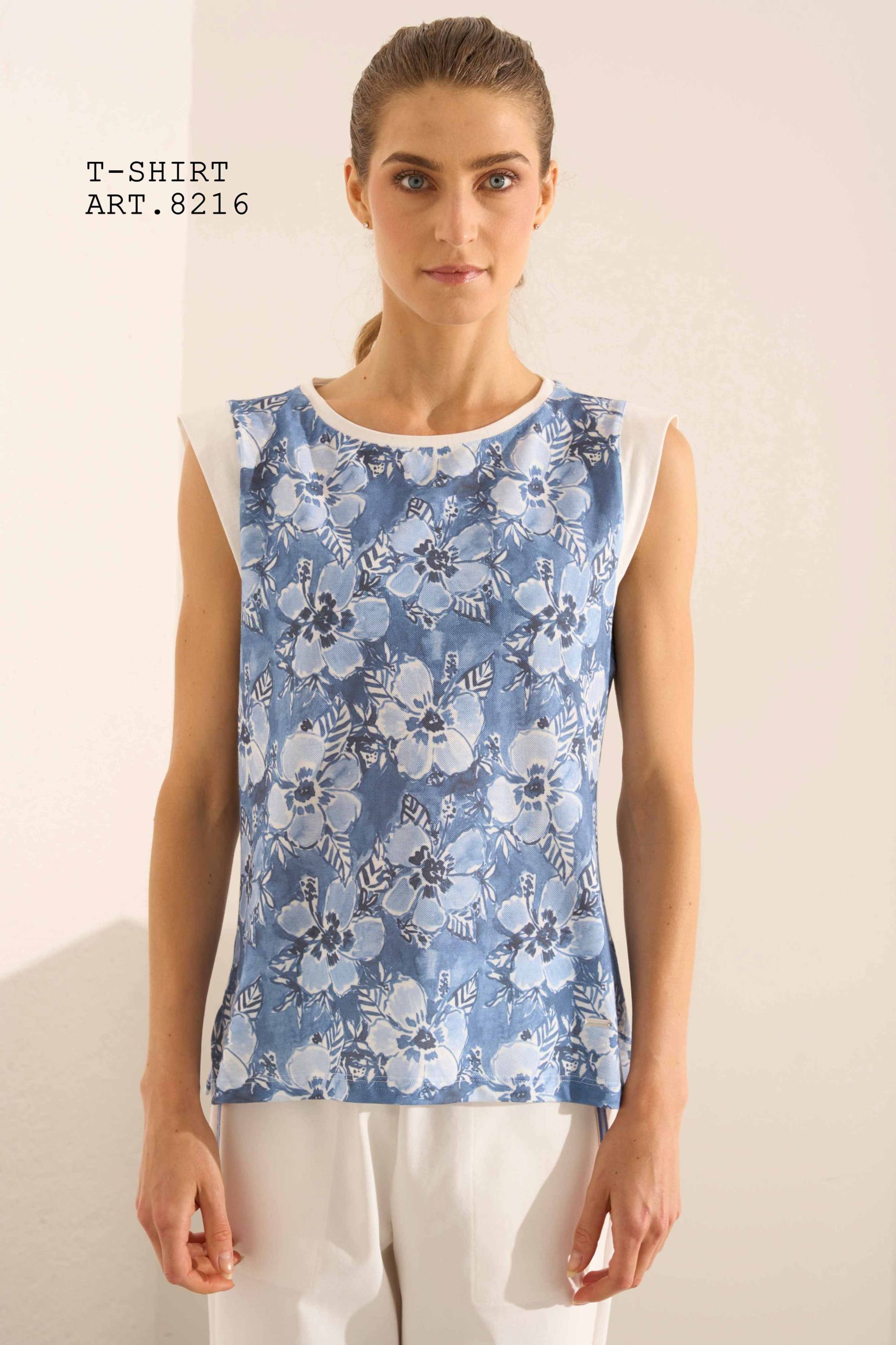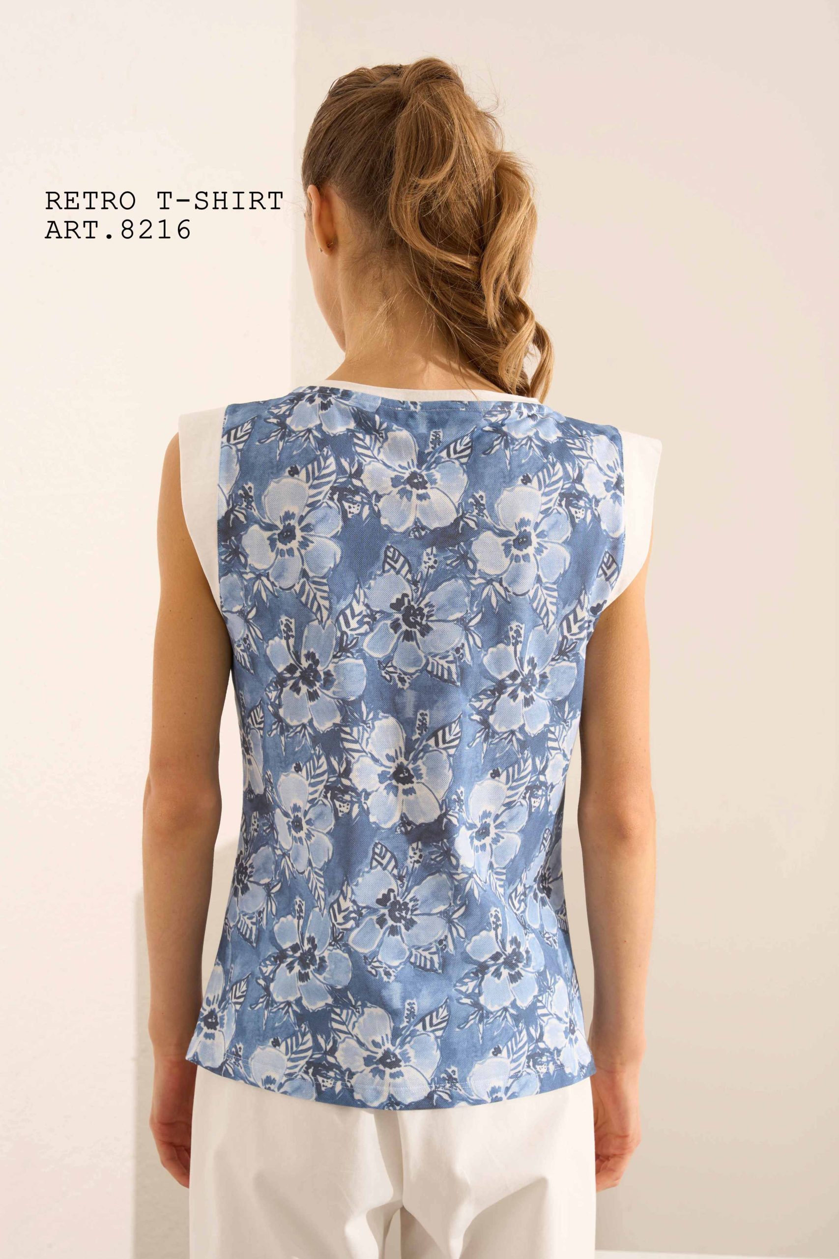 TOP DONNA HAITI AZZURRO MODELLO CON MANICHE AD ALETTA Composizione: 100,00 % cotone / INSERTO – 50,00 % viscosa – 50,00 % nylon