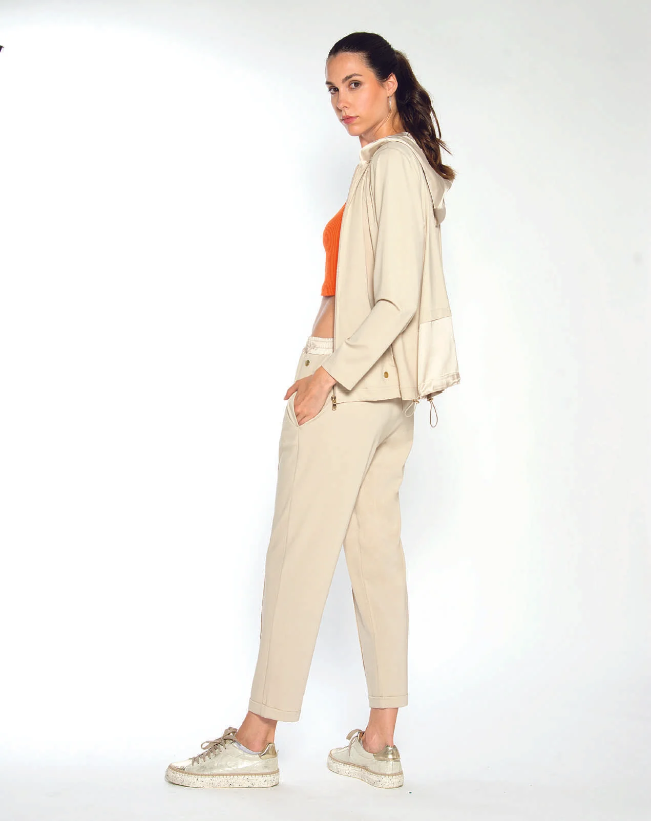 Modello con cappuccio e inserto nella giacca in viscosa. Pantalone dritto con risvoltino e coulisse in viscosa